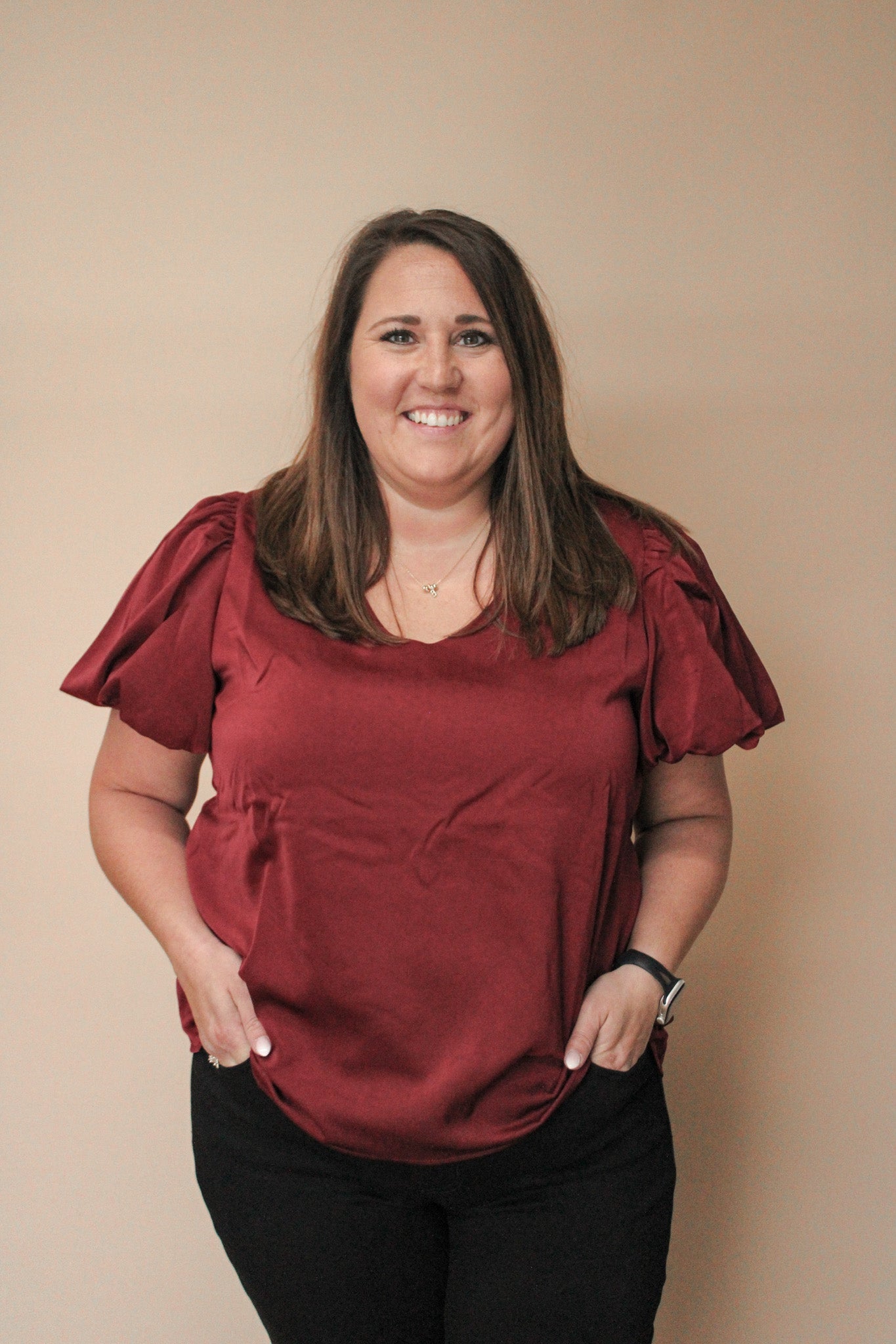 Elevate your everyday style with the CRISTIE CURVY V-NECK BLOUSE—a versatile essential that works with literally everything in your closet. The flattering v-neckline pairs perfectly with the adorable short puff sleeves for a touch of playful charm. Whether you're dressing it up for a night out or keeping it casual with your favorite jeans, this blouse is your new go-to piece. Comfortable, chic, and endlessly mixable—because looking fabulous should be effortless.