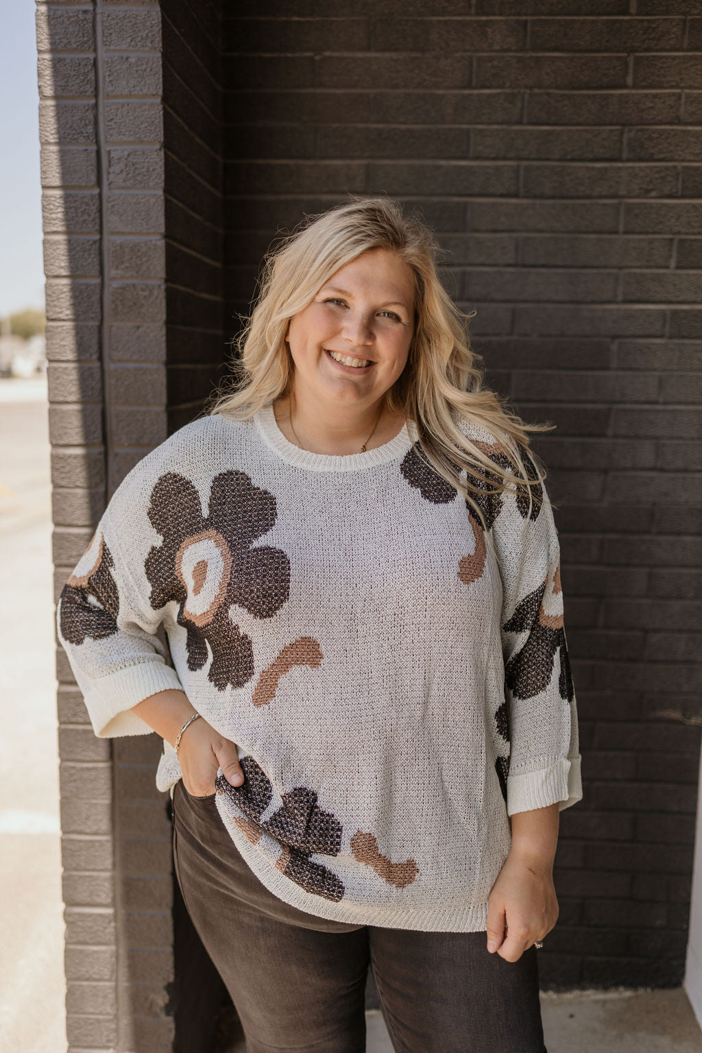 Made from 100% acrylic, this sweater features an abstract floral design in elegant neutral tones. The 3/4 sleeves add a touch of sophistication, making this sweater a must-have for any fashion-forward wardrobe. Elevate your style with this luxurious piece.