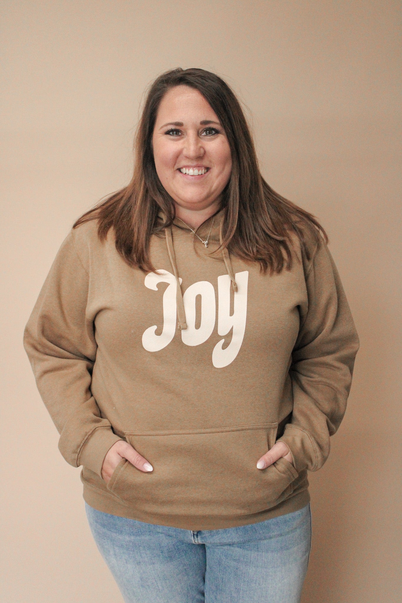 Wrap yourself in pure comfort with this beautiful brown hooded sweatshirt from LAT brand. Featuring a charming cream "JOY" imprint, it's the perfect cozy companion for chilly days. The soft, warm fabric keeps you snug while the playful graphic adds a touch of personality to your everyday look. Available in regular and curvy sizes, this hoodie is designed to make you feel as good as it looks. Embrace the warmth, embrace the joy!
