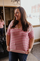 Say hello to sunshine with our KIT CURVY STRIPED COLLAR KNIT TOP. Stay cool and comfortable in 100% viscose fabric with a playful striped design and split neck collar. Perfect for those warm, breezy days. Add a pop of fun to your wardrobe today!