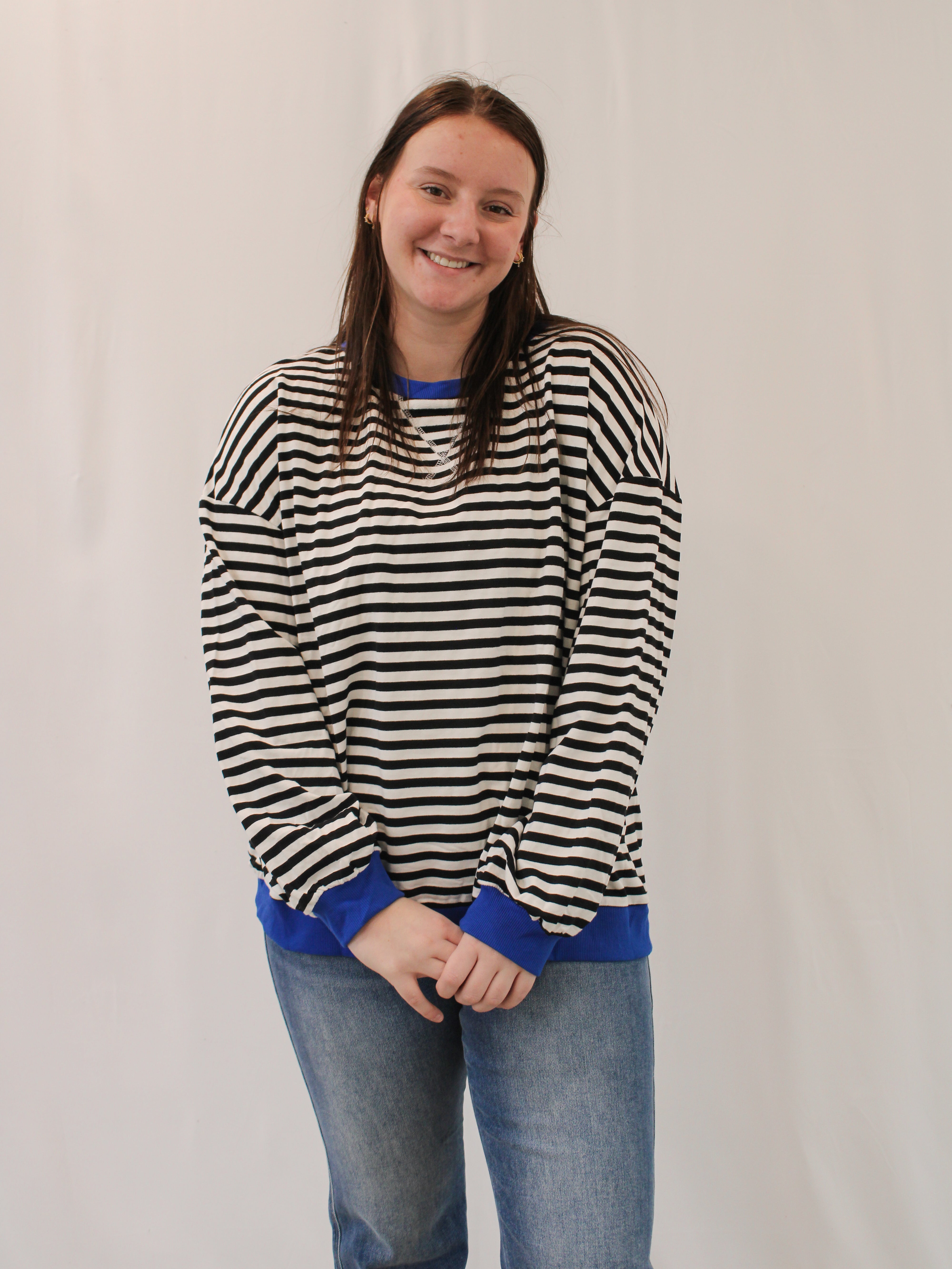 Add some effortless style to your wardrobe with the MONA STRIPED SWEATER. Its relaxed drop sleeve silhouette offers comfort and trendiness, while the bold striped design and contrast binding add a unique touch. The striped detail and contrast edges provide a modern twist to the classic oversized style. Perfect for lounging or a casual day out with friends!