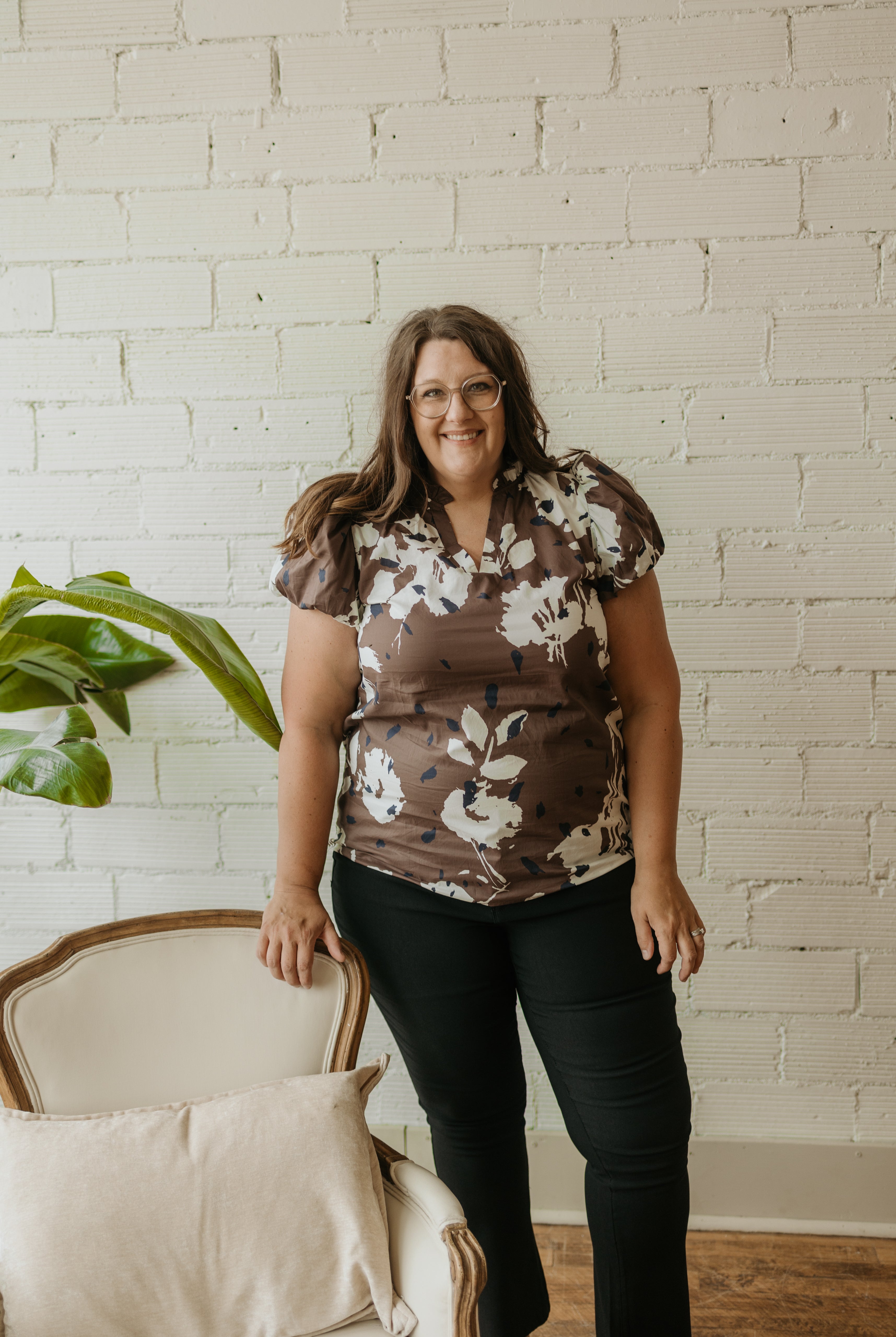 Embrace your playful side with the Ruthie Curvy Ruffle Sleeve Blouse. This large floral top features a flattering V-neck and charming ruffle puff sleeves, adding a fun, feminine touch to your look. Made from 100% cotton, it offers breathable comfort all day long. Perfect for brightening up any outfit with a splash of floral flair!