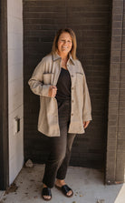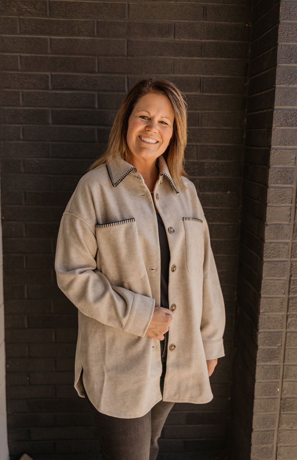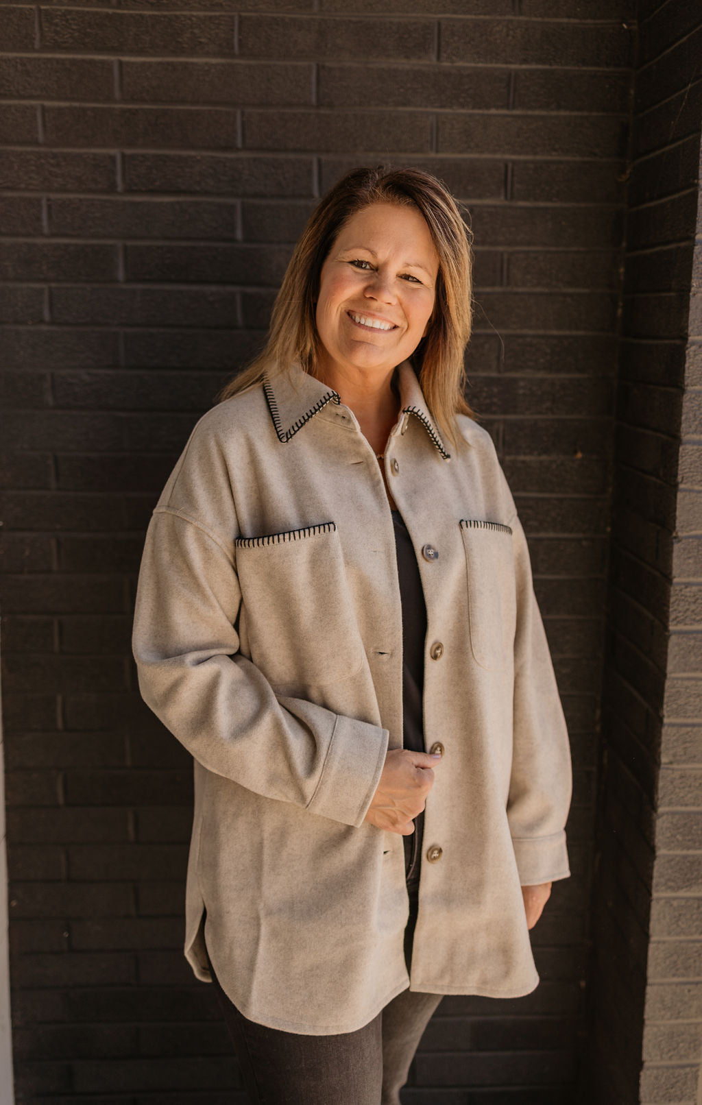 Discover the epitome of elegance with our CHARLA STITCHED SHACKET. This exquisite shacket features a stitch point button down design, adding a touch of sophistication to your wardrobe. In a luxurious oatmeal color, it's perfect for any occasion. Elevate your style today with this exclusive piece.