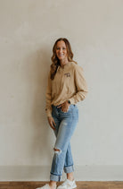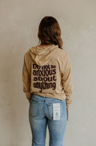A cozy long sleeve hooded shirt in a beautiful golden wheat color, perfect for layering through the seasons. The back features an inspirational imprint that reads, “Do not be anxious about anything – Philippians 4:6”, serving as a meaningful reminder with every wear. Soft, comfortable, and versatile, this hoodie is both stylish and uplifting.