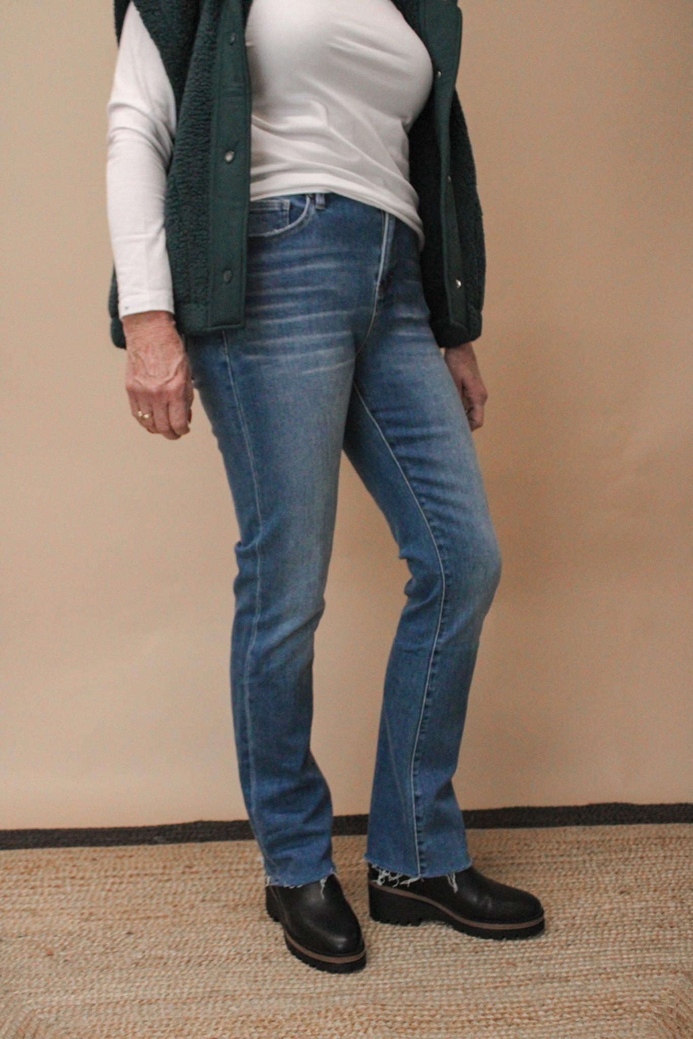 The ADLEY High Rise Raw Hem Straight Jean is your new denim obsession! With a generous 10½" rise, these babies sit perfectly on your hips while the classic straight leg keeps things timeless. The raw hem adds that effortlessly cool edge—dress it up or down, it works either way. Crafted from a comfortable cotton-poly-spandex blend, they've got just enough stretch to move with you all day. At 32" inseam with a 14¼" leg opening, you're getting that perfect fit that actually fits. Straight-up denim goals.
