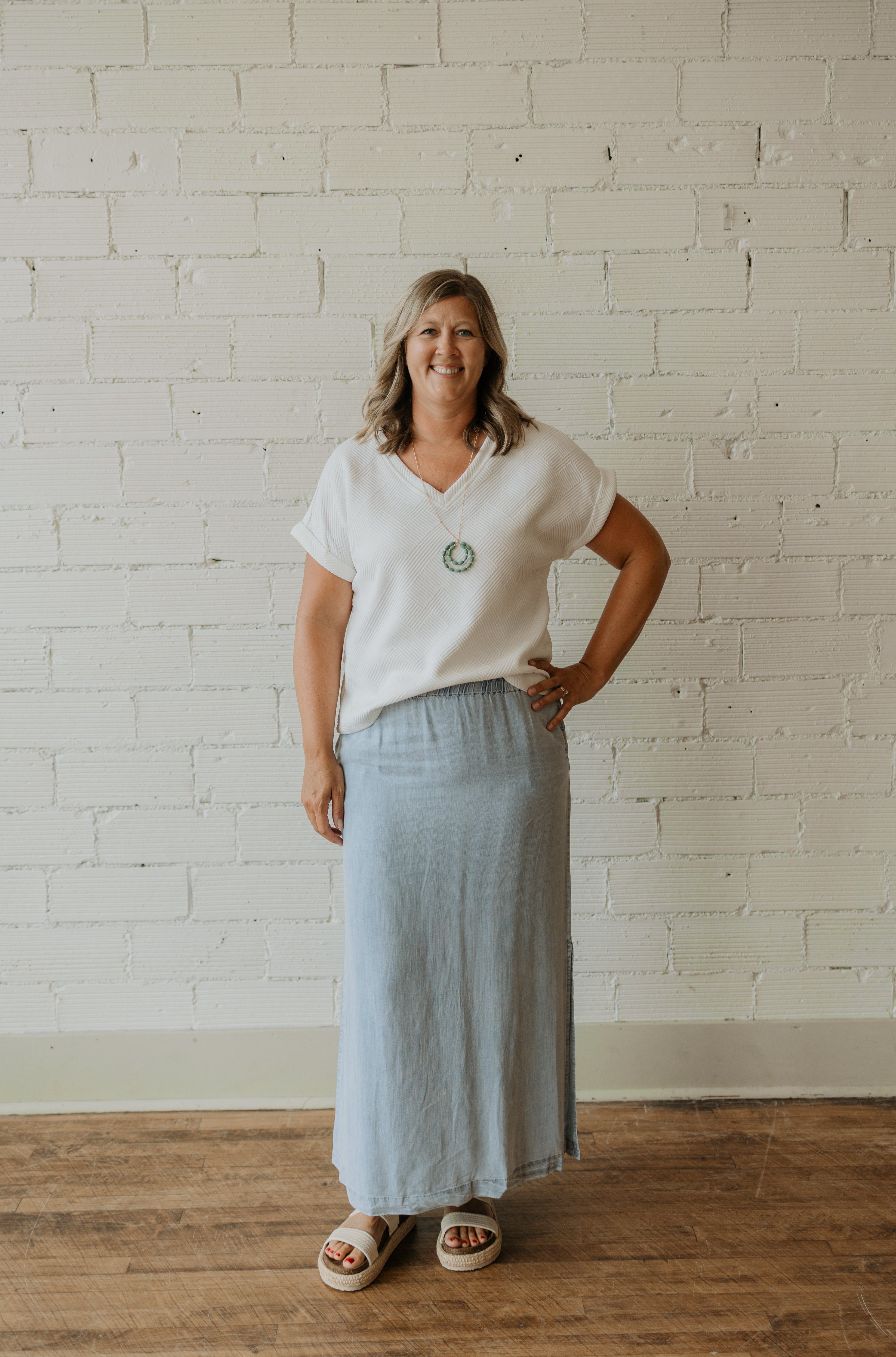 Forever cool and classic denim maxi in our softest tencel fabric, featuring an elastic waist, dual side pockets and side slits.