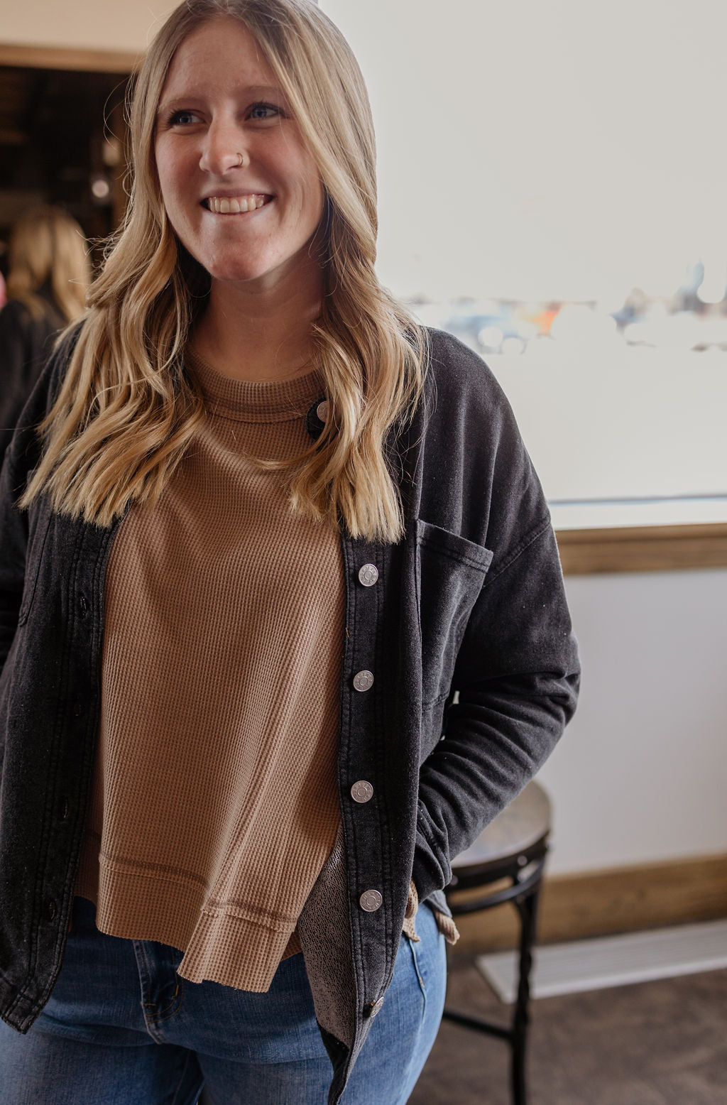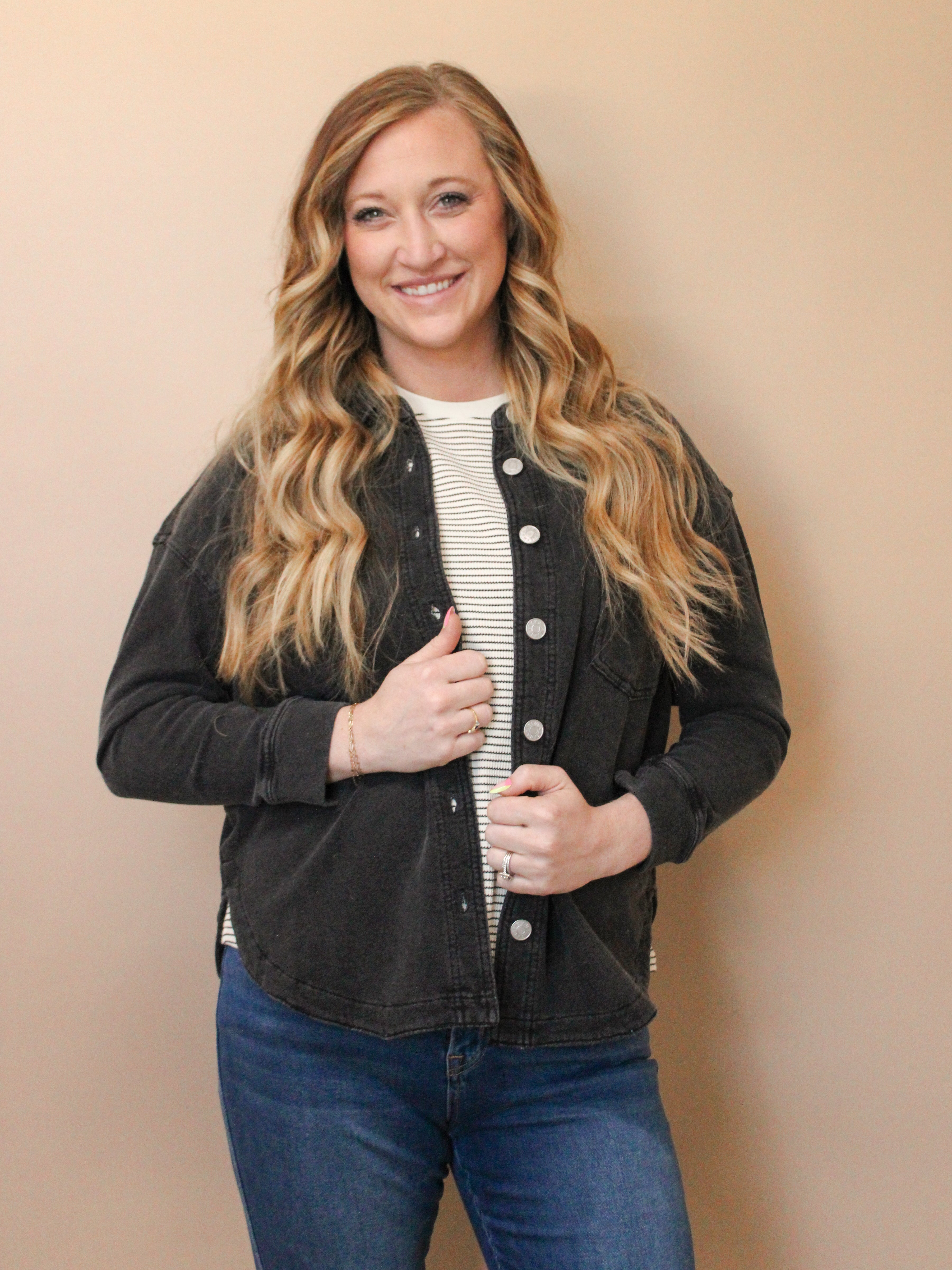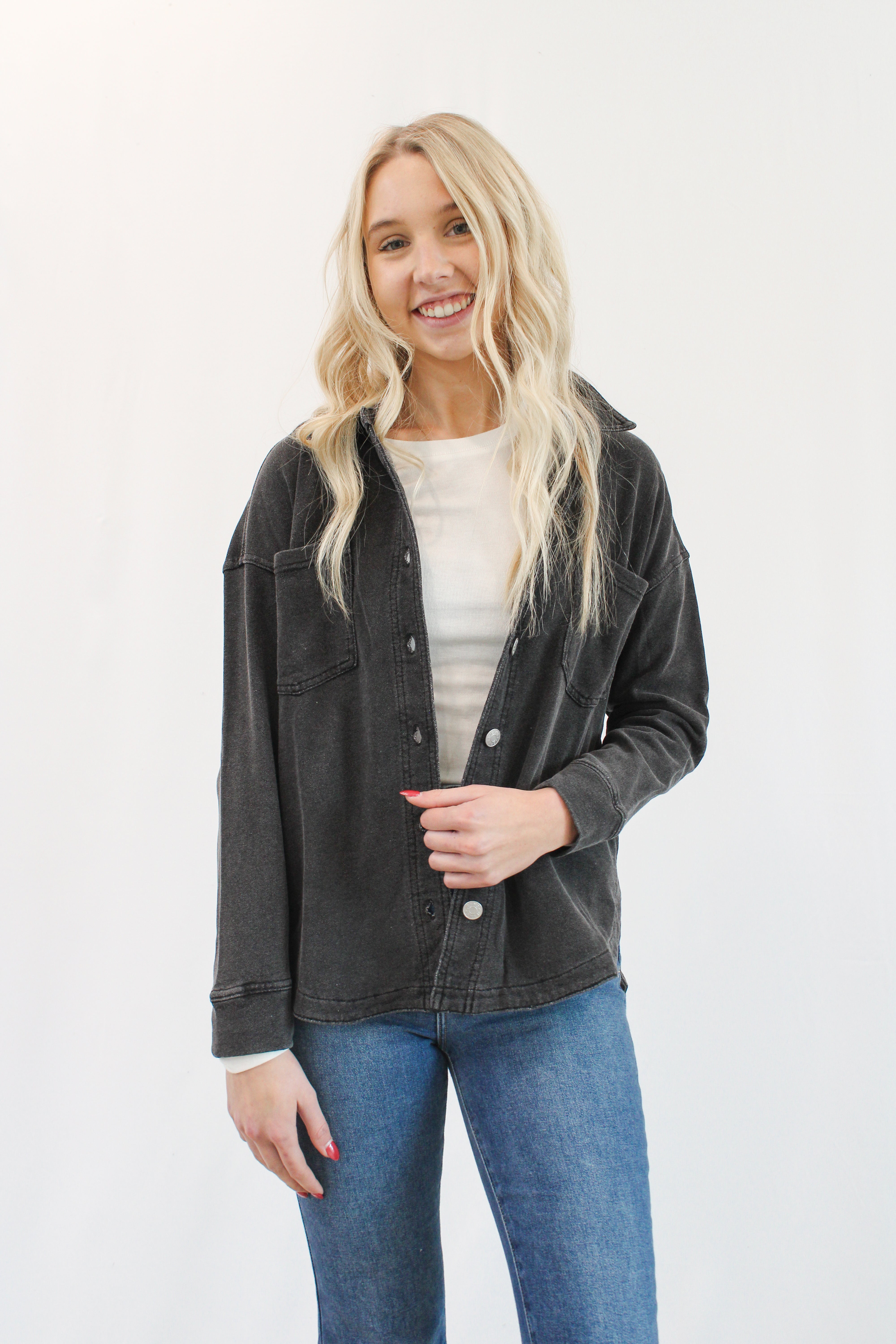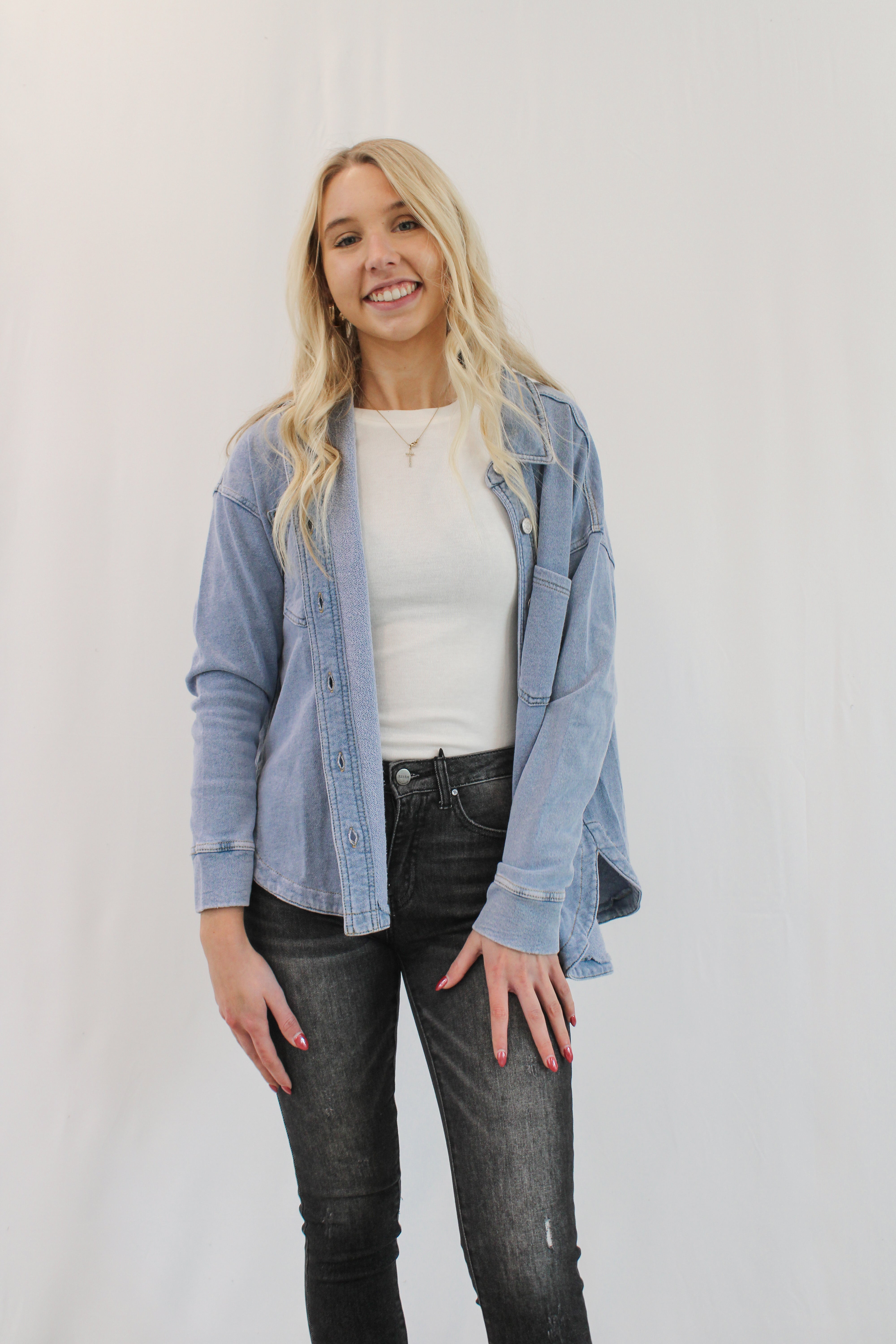 Indulge in luxury with our DEANDRA OVERSIZED SHACKET. Crafted from ultra soft denim, this shacket features an oversized cut, chest pockets, and a rounded hemline. The perfect balance of style and comfort, elevate your wardrobe with this must-have piece.