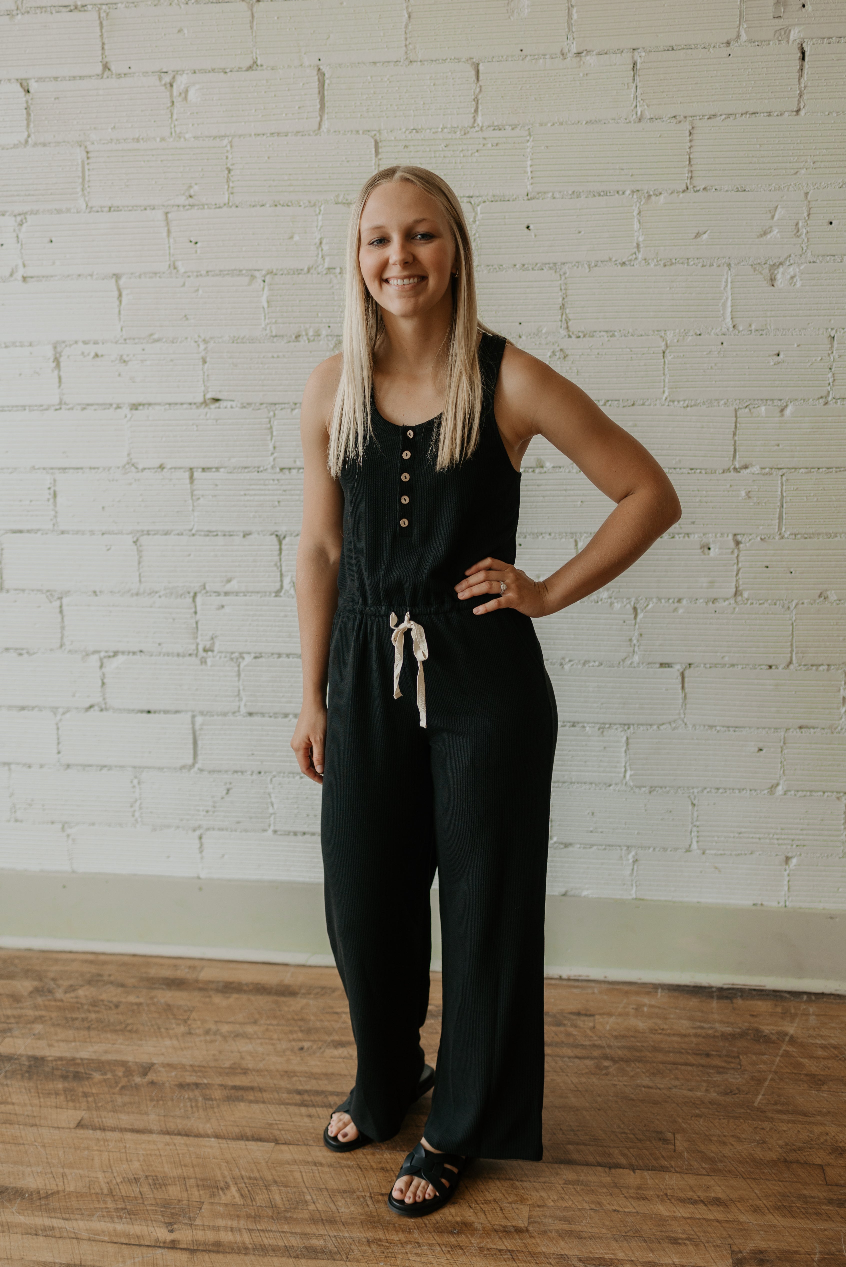 This playful sleeveless jumpsuit features a relaxed fit with a scoop neckline and button placket for easy style. The drawstring waist lets you adjust for the perfect fit, while two side hip pockets add practical charm. Finished with straight leg pants, it’s a fun and comfortable choice for any casual occasion. Made from a soft blend of 93% polyester and 7% spandex, it moves with you all day long.