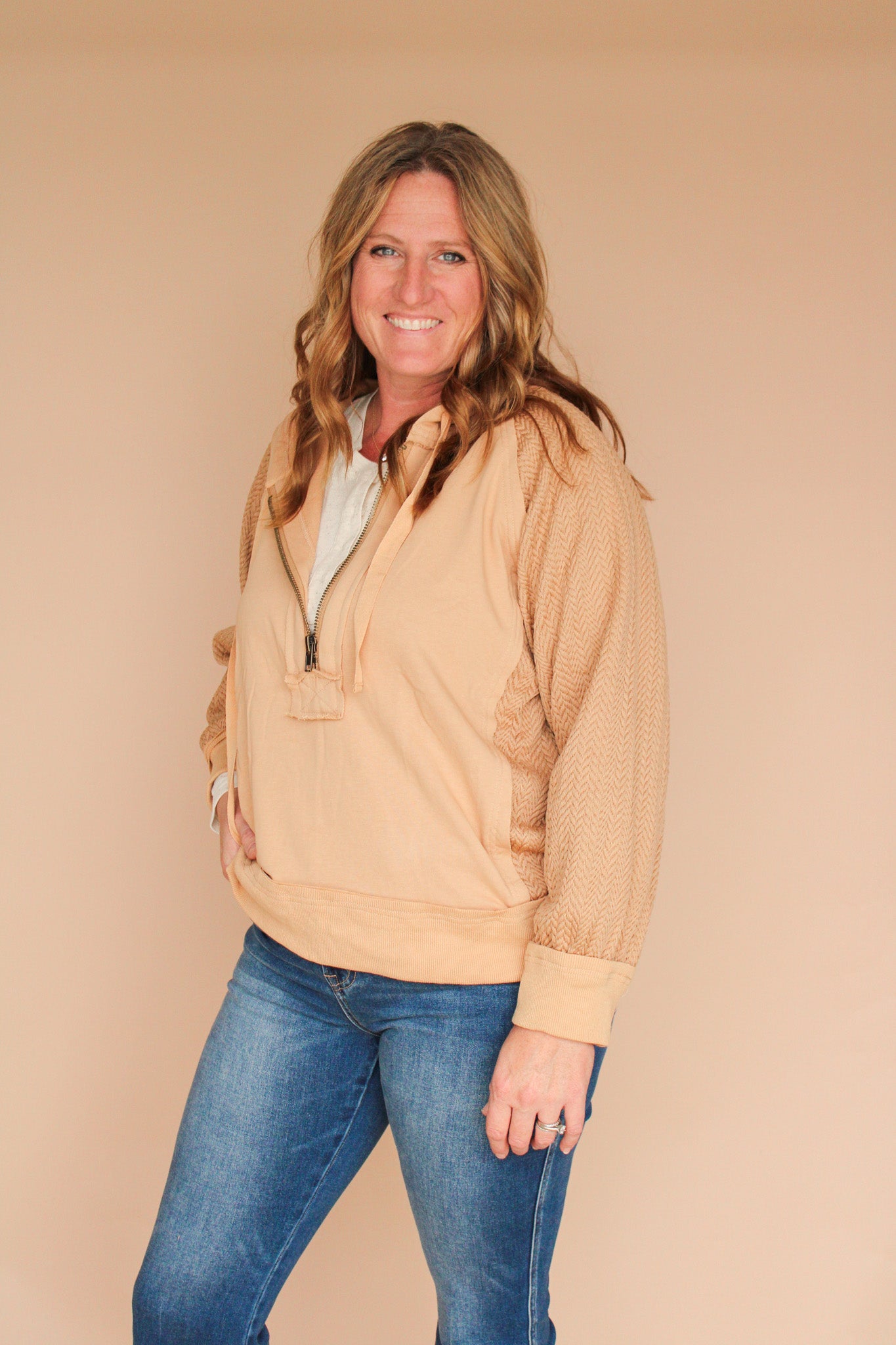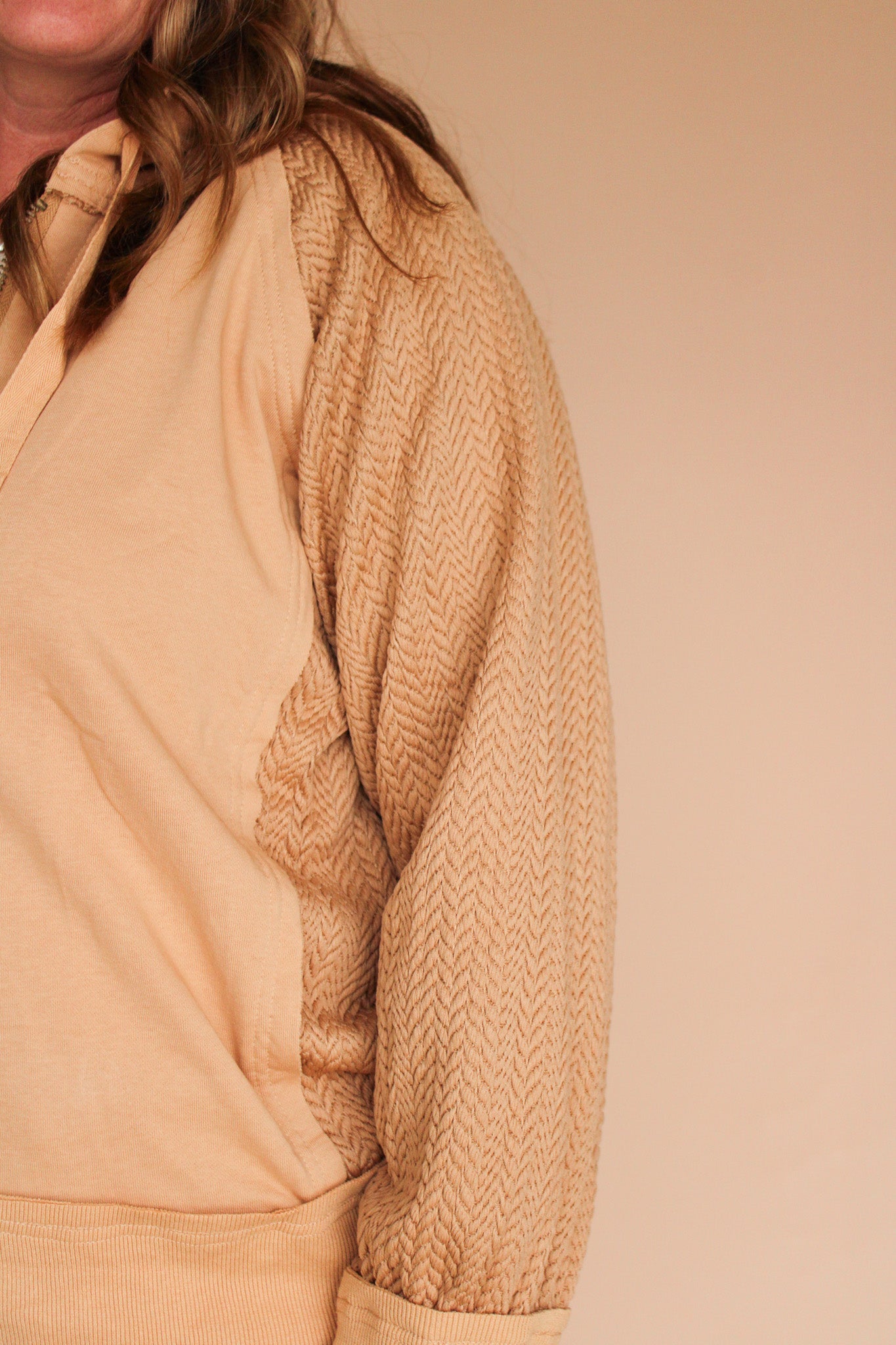 Stay cozy and stylish in the GAGE Textured Sleeve Half Zip Hoodie, featuring eye-catching caramel tones and contrasting sleeves that add a fun twist to your casual look. The half zip lets you play with ventilation, perfect for those chill days when you want to keep it cool but not too cool. Whether you're lounging or out and about, this hoodie brings comfort and character in one playful package.