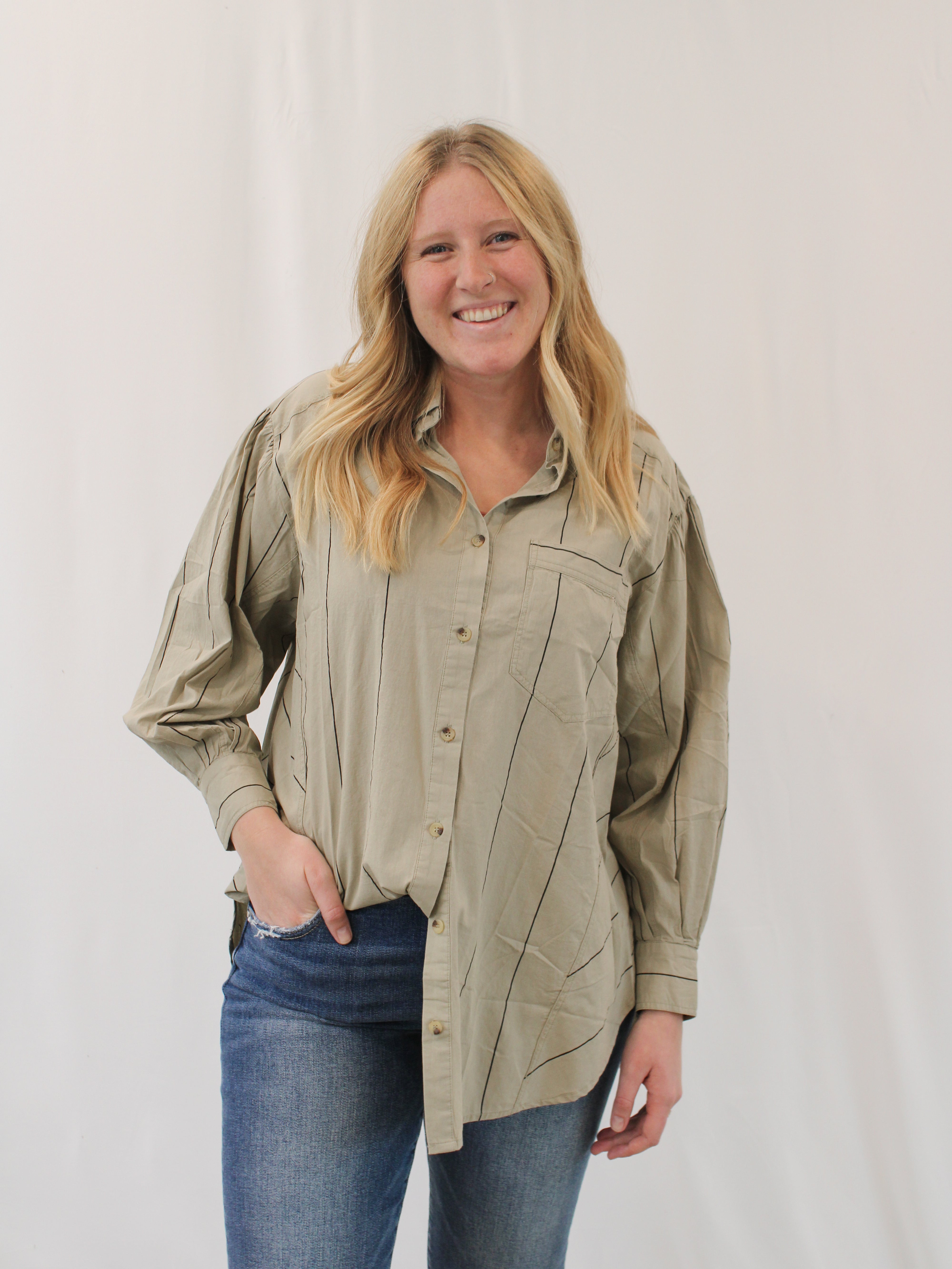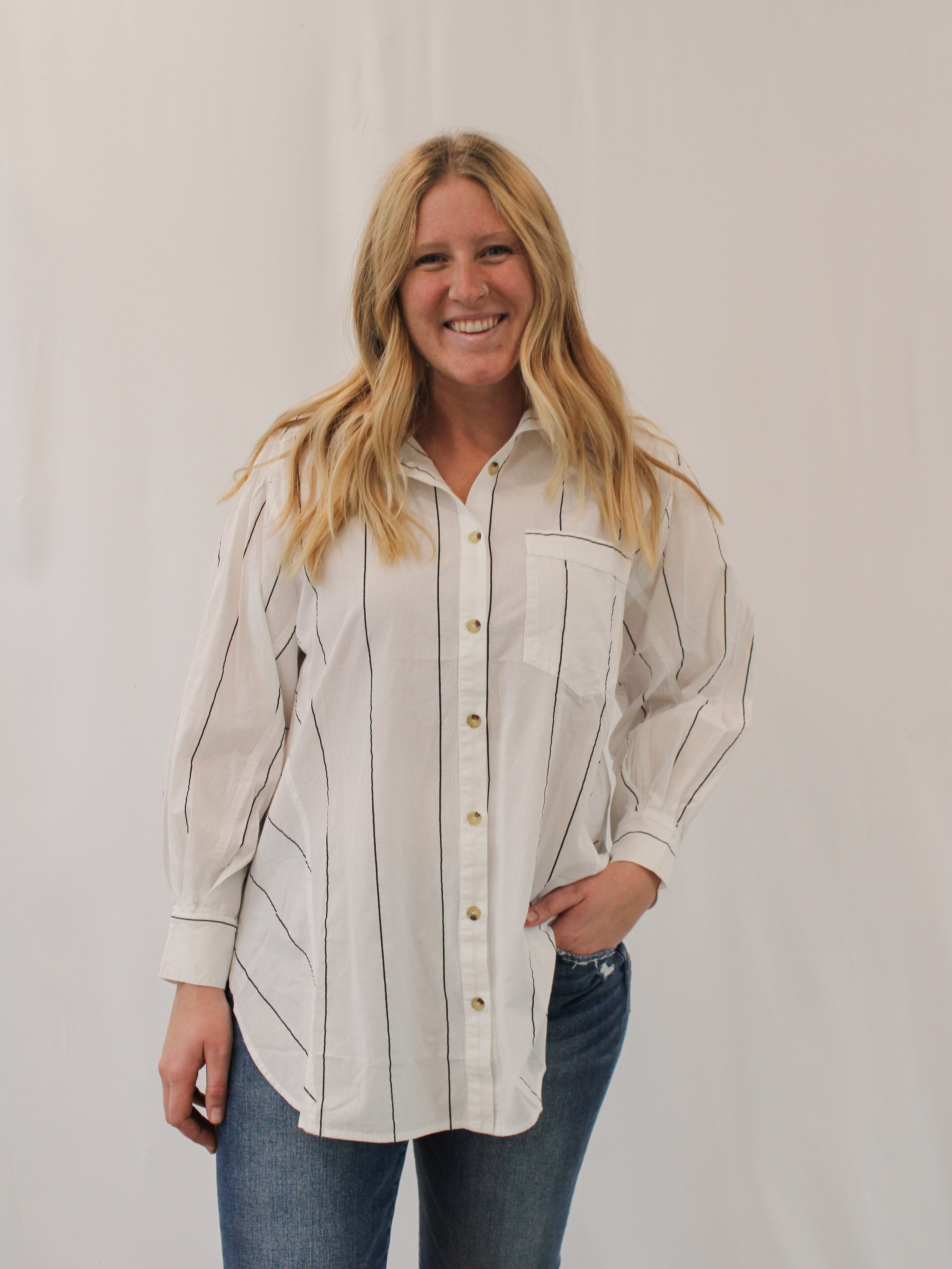 Get ready to slay the fashion game with the Jina Oversized Button Down! This soft wash striped top features a button down front, collared neckline, and buttoned cuffs for a chic look. With added seams for a slimming effect, this high-low design boasts two side slits and a chest pocket. Plus, its slightly oversized fit is perfect for a comfy, yet stylish outfit.