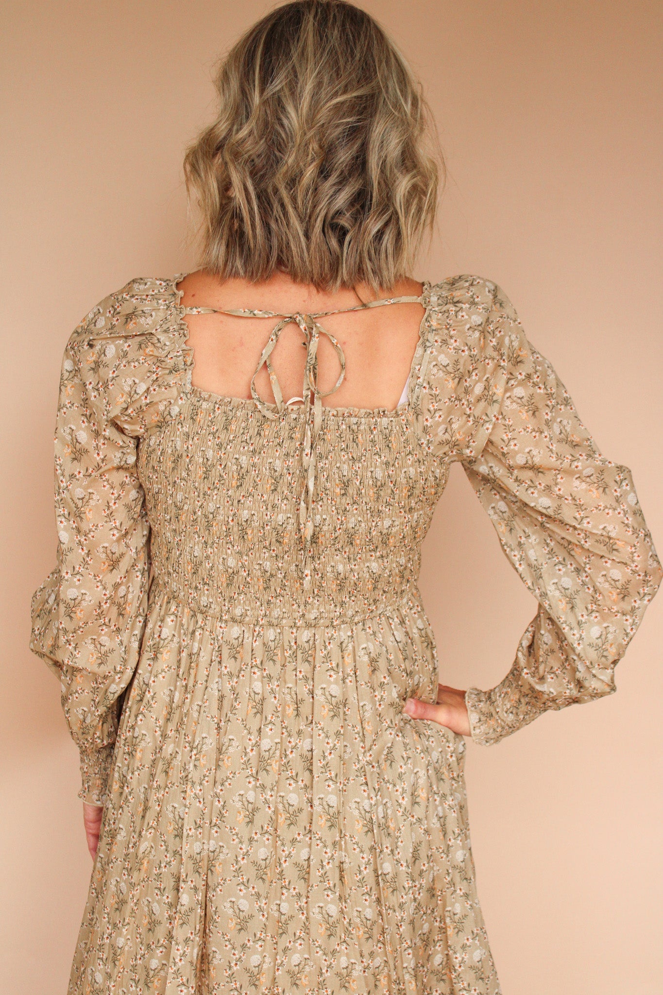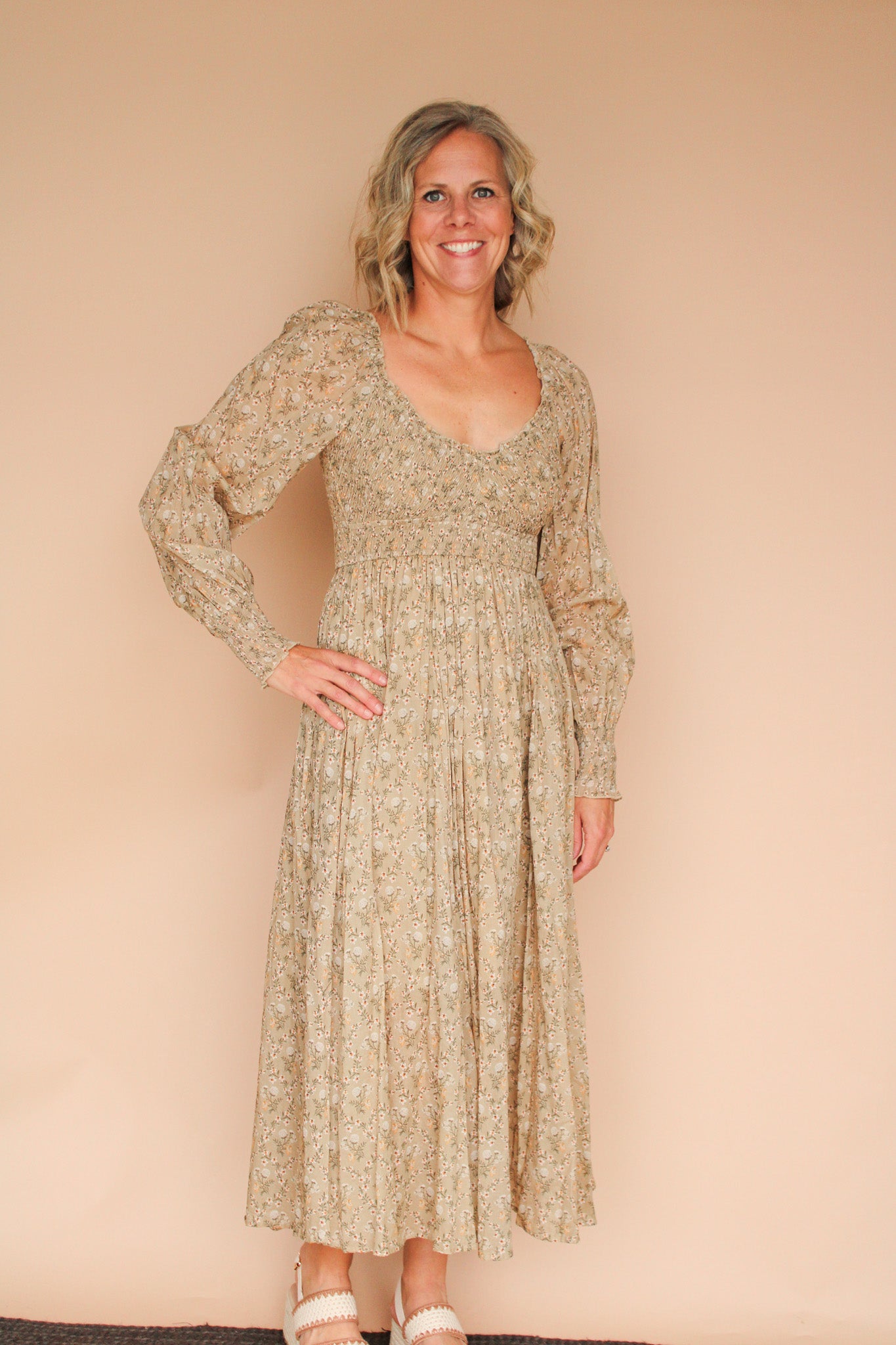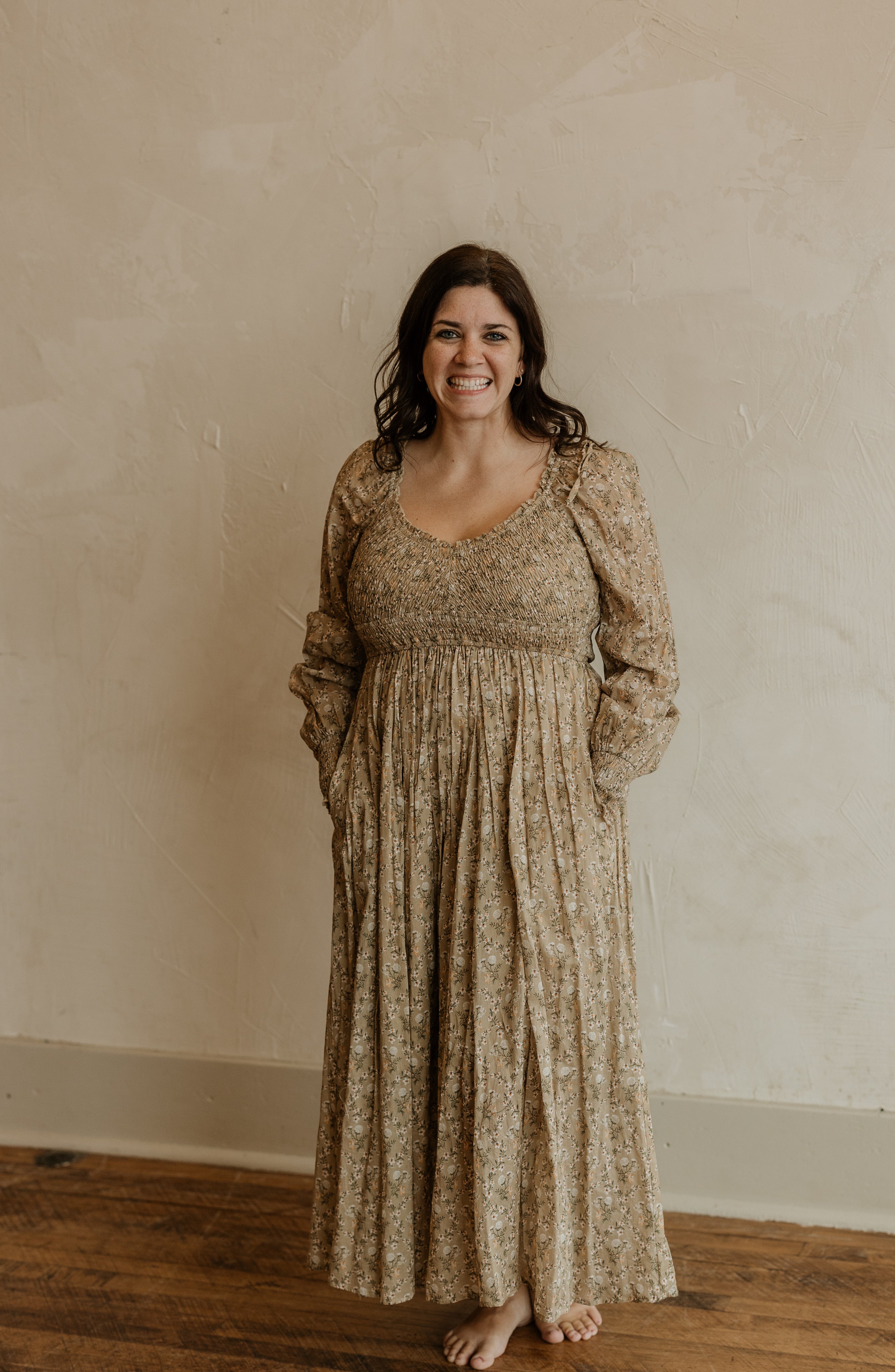 Made from a soft and breathable cotton floral fabric, this dress features a smocked bodice and voluminous sleeve ends for a flattering and comfortable fit. Plus, it has handy side pockets for all your essentials. Perfect for any occasion!