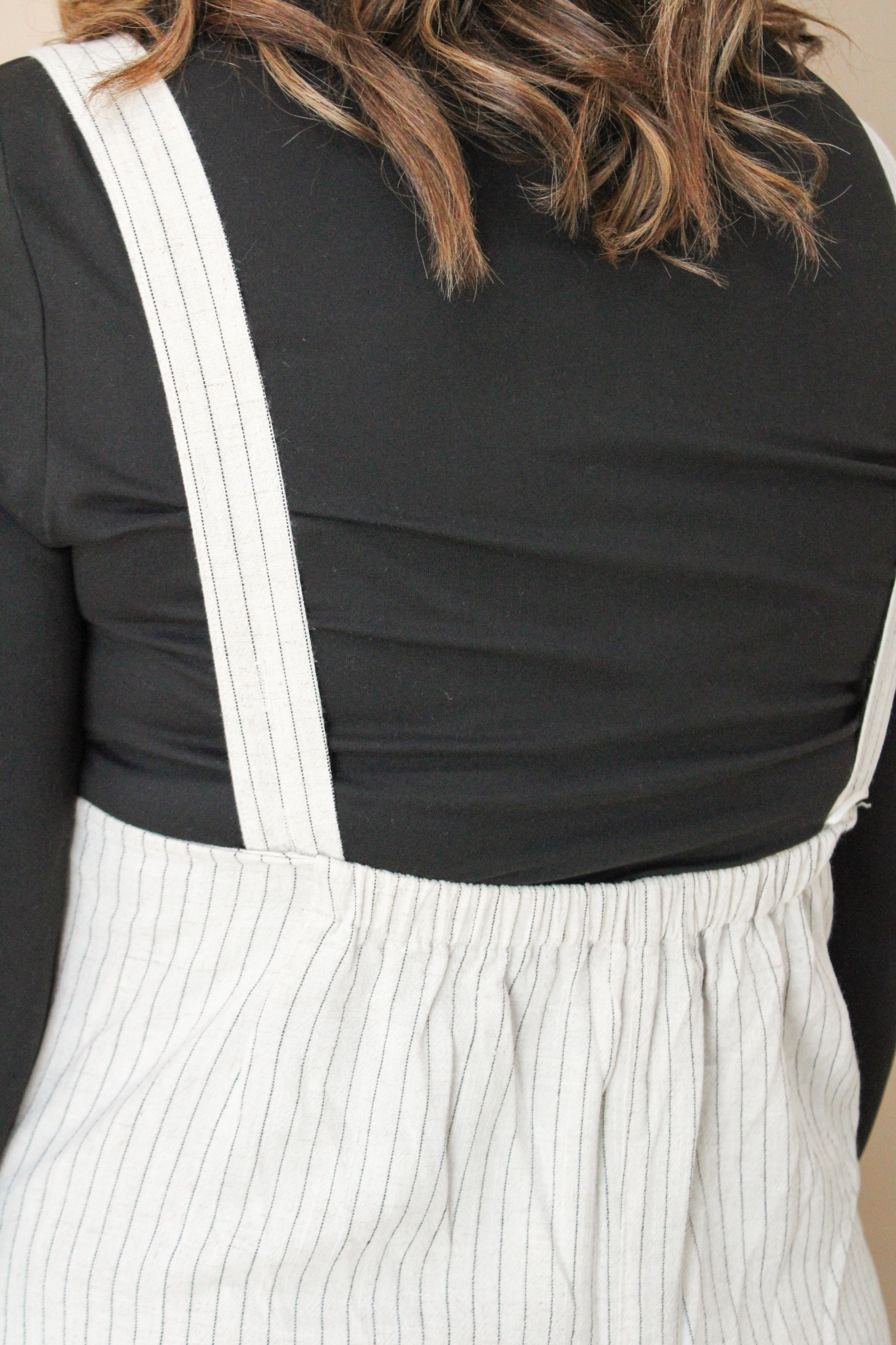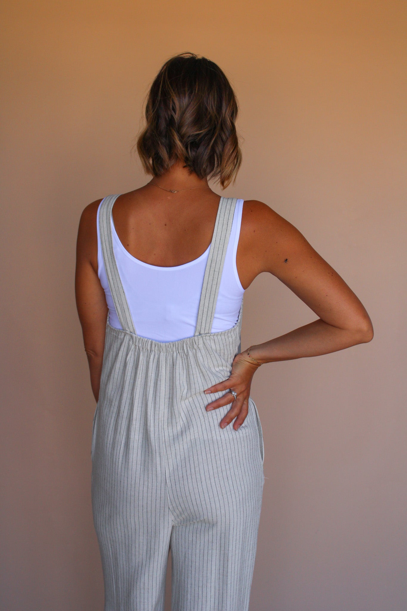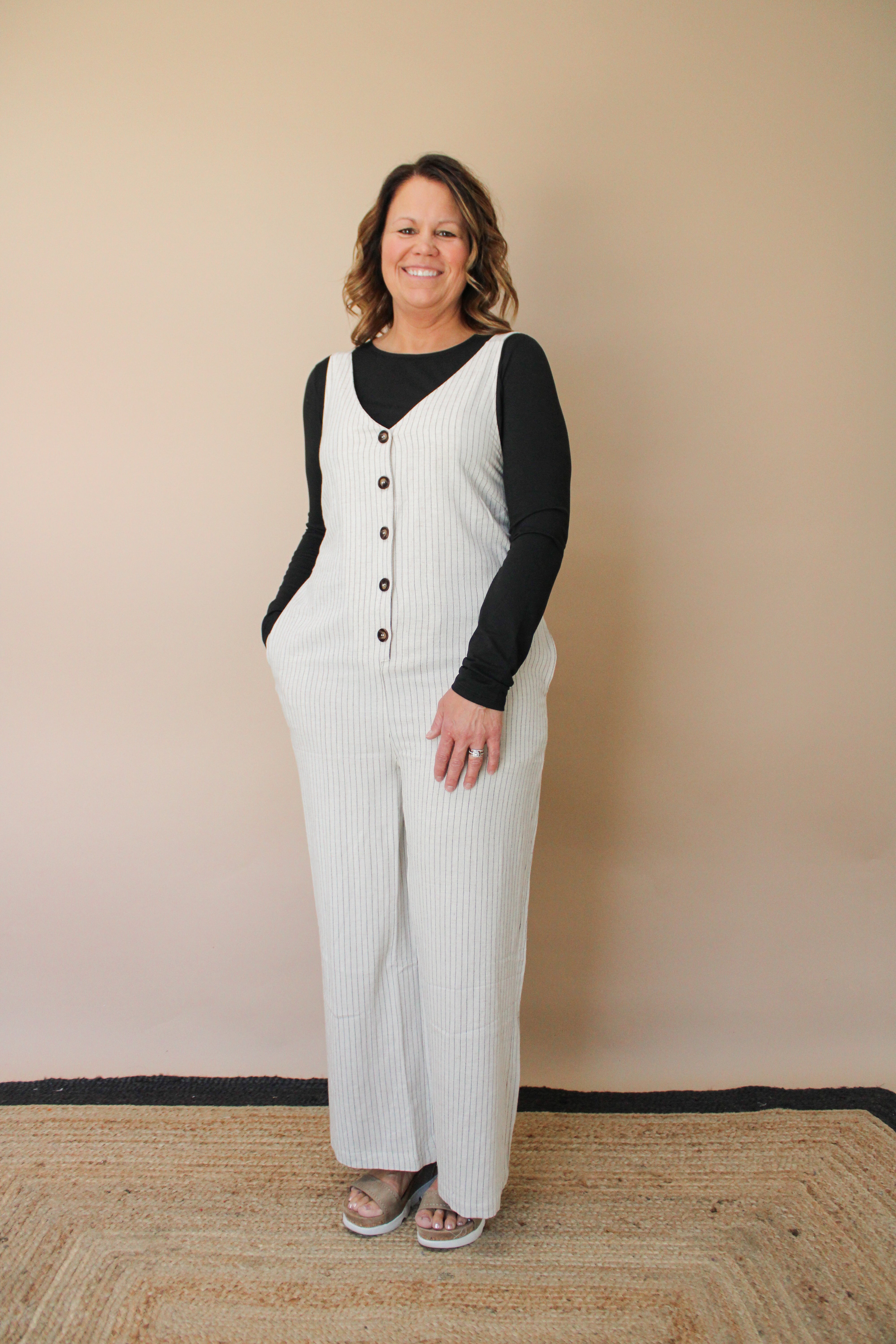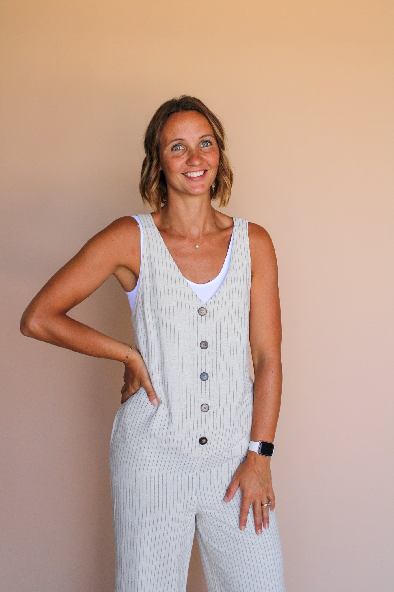 Update your wardrobe with our MAELYN PINSTRIPE JUMPSUIT. This playful and sleeveless jumpsuit features a deep V-neckline, tortoiseshell buttons, and two side hip pockets for added practicality. The button adjustable straps and elastic back detail ensure a comfortable fit, while the relaxed wide-leg design adds a touch of effortless style. Make a statement with this versatile and quirky jumpsuit.