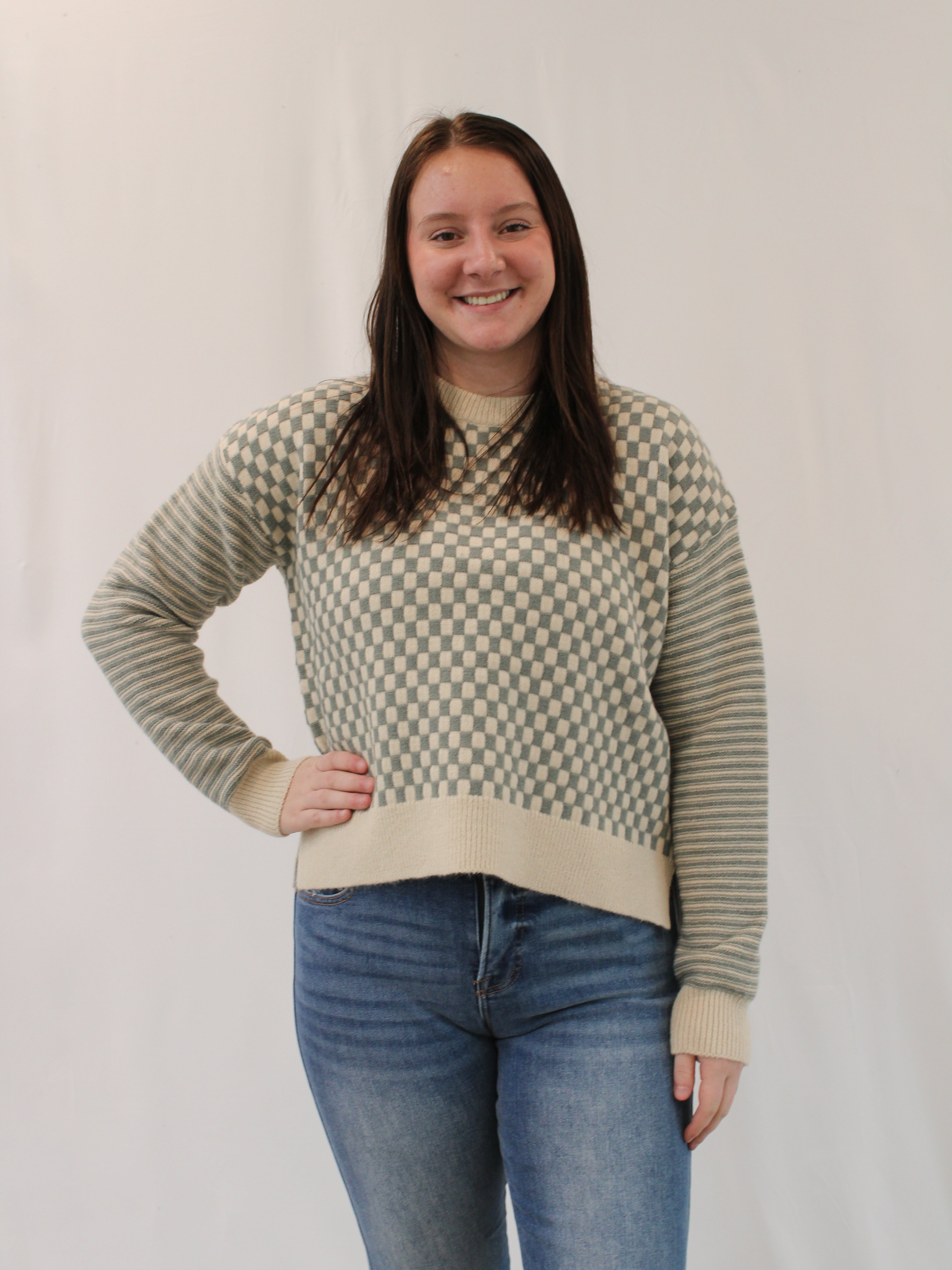 Snuggle up in the SOFYA CHECKERED SWEATER, featuring a cozy oatmilk and sage checkerboard pattern. The crew neck adds a touch of classic style, perfect for a chilly day (or a Netflix binge).