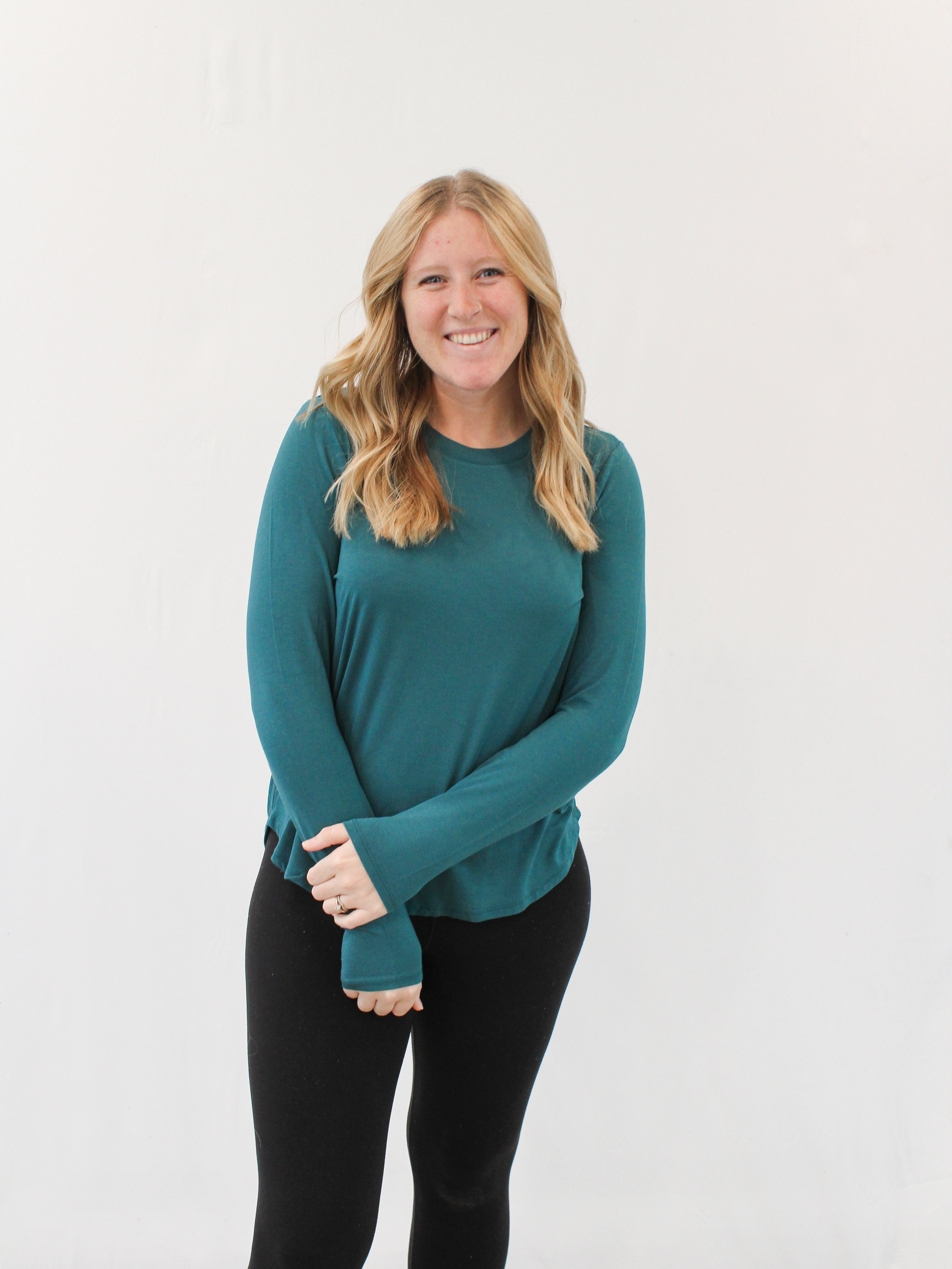 The STASSIA TOP: a playful twist on the classic crew neck shirt. With its unique shirt tail hem, this top adds a touch of fun and style to any outfit. Comfortable and versatile, it's the perfect addition to your wardrobe.