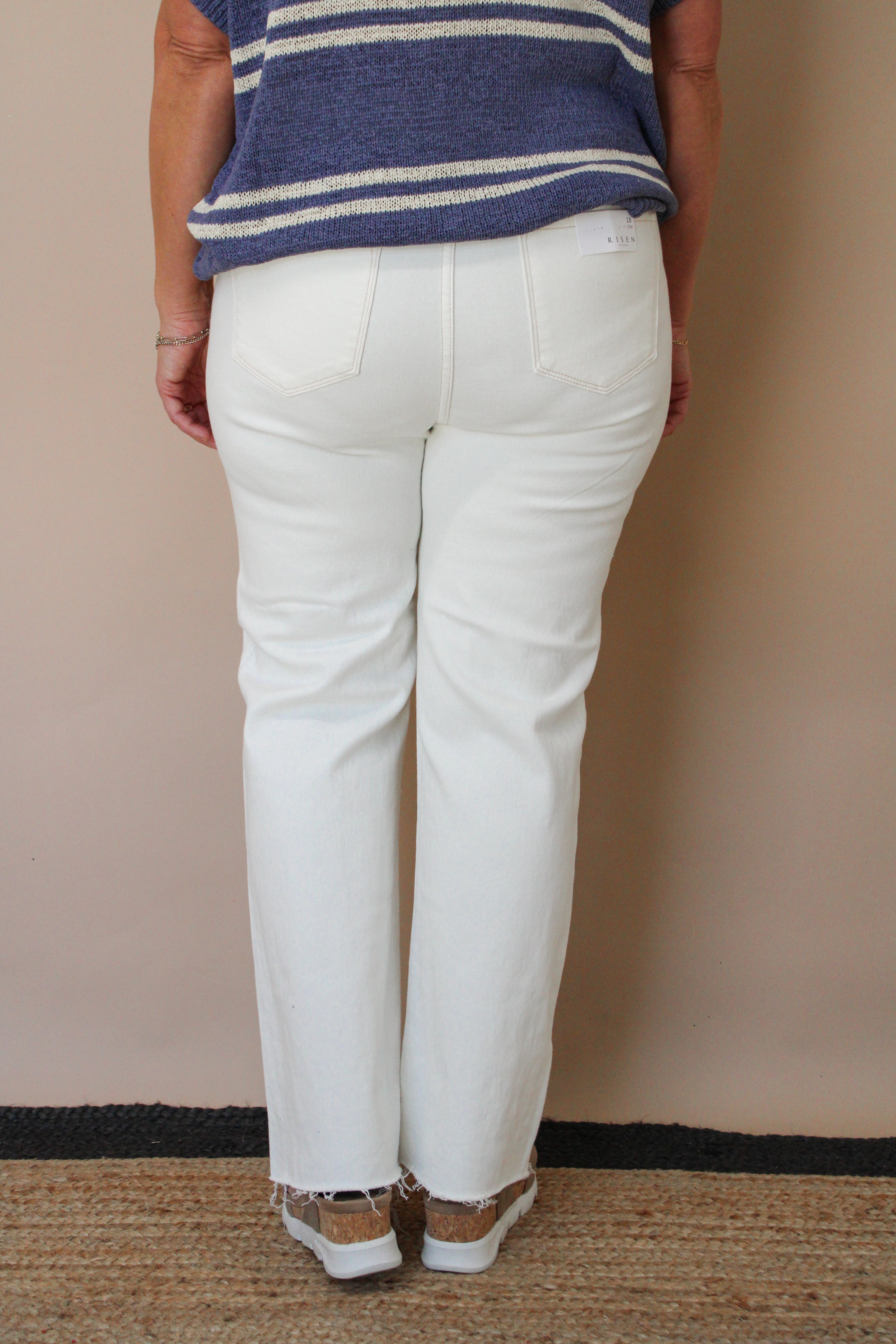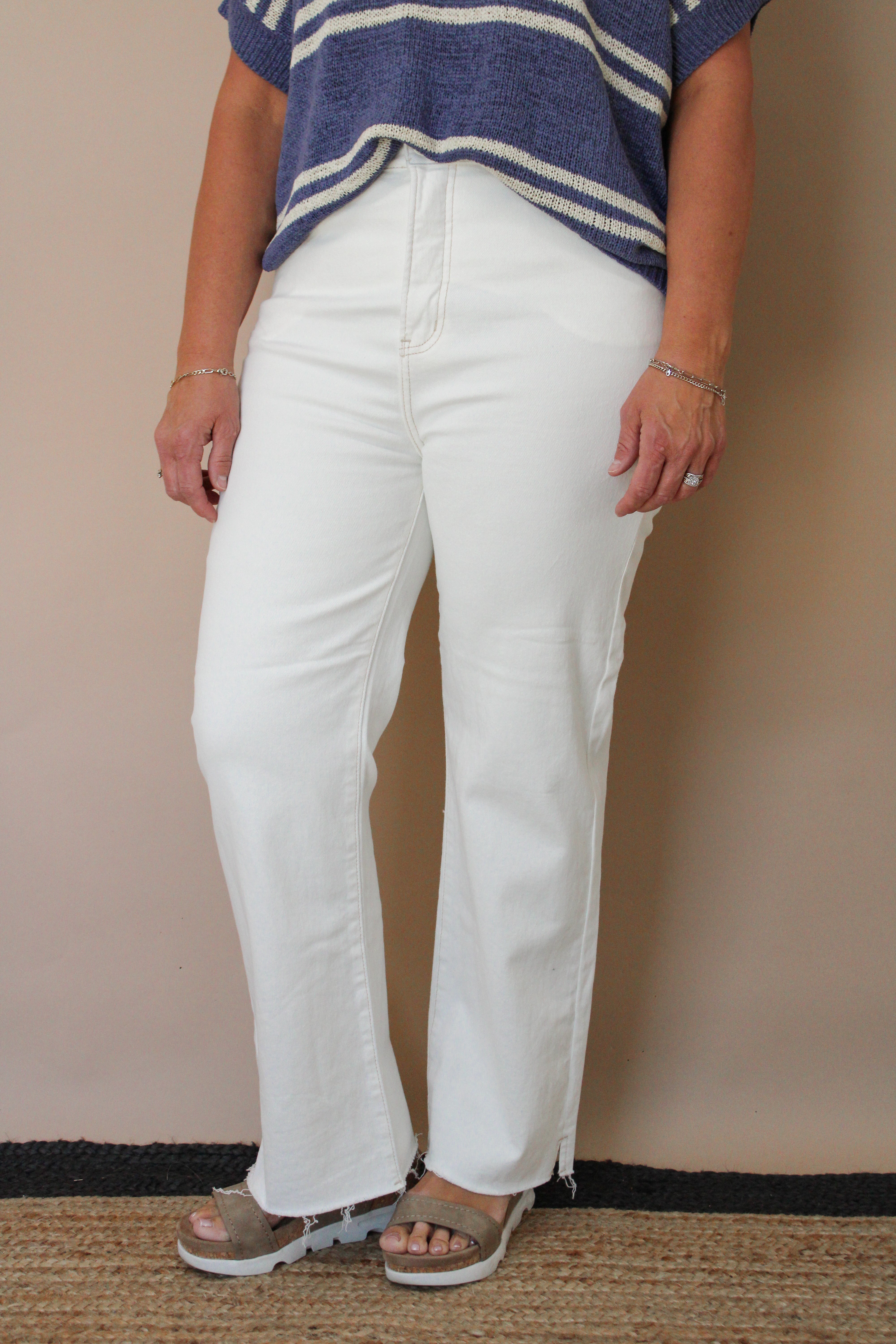Introducing the TATUM TUMMY-CONTROL HIGH RISE ANKLE PANT - the perfect cream-colored, tummy-shaping option for any wardrobe! With its high rise and ankle length, this pant offers both style and comfort. The raw hem with side slit adds a touch of edge to this classic, straight leg design.