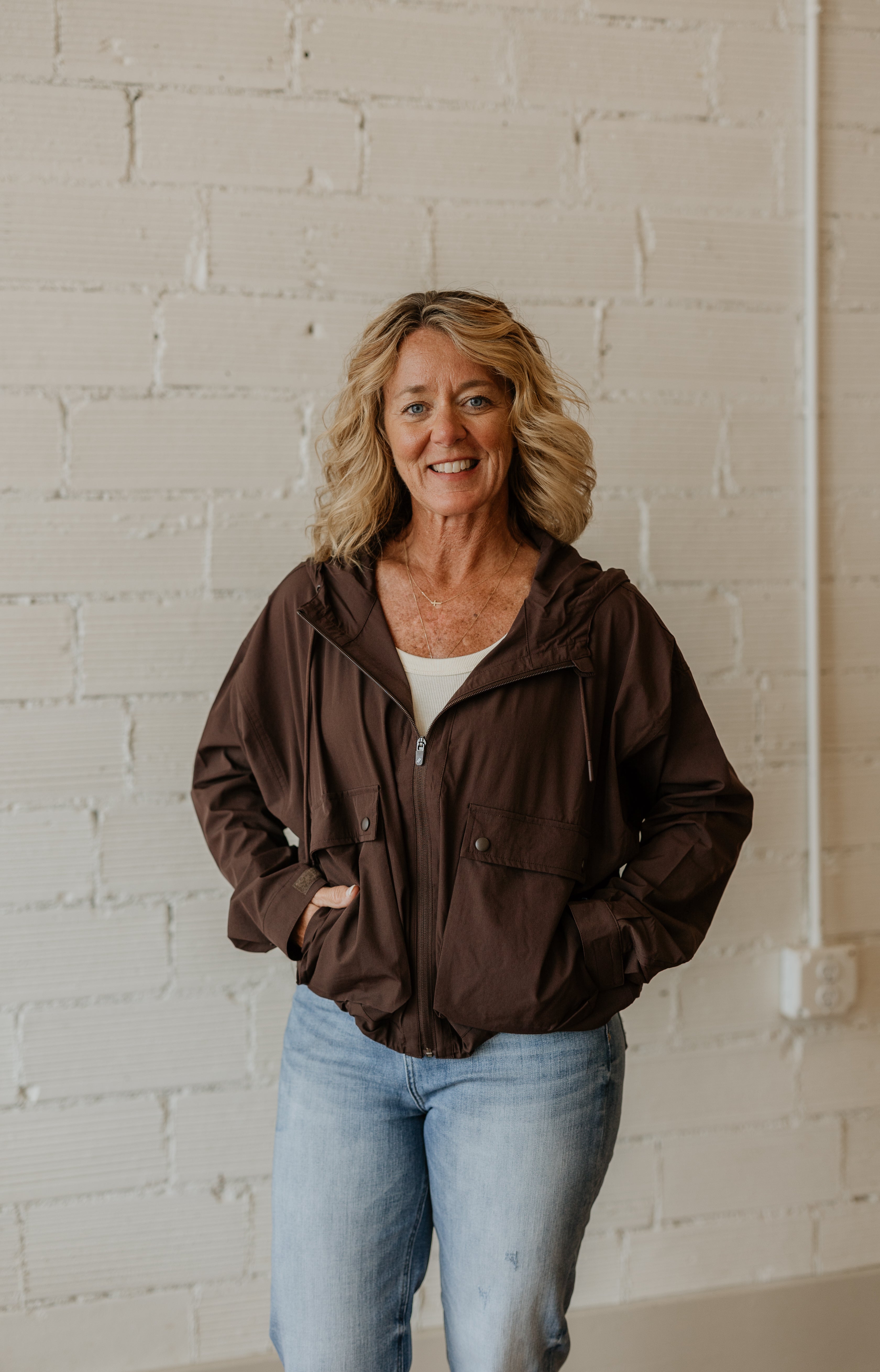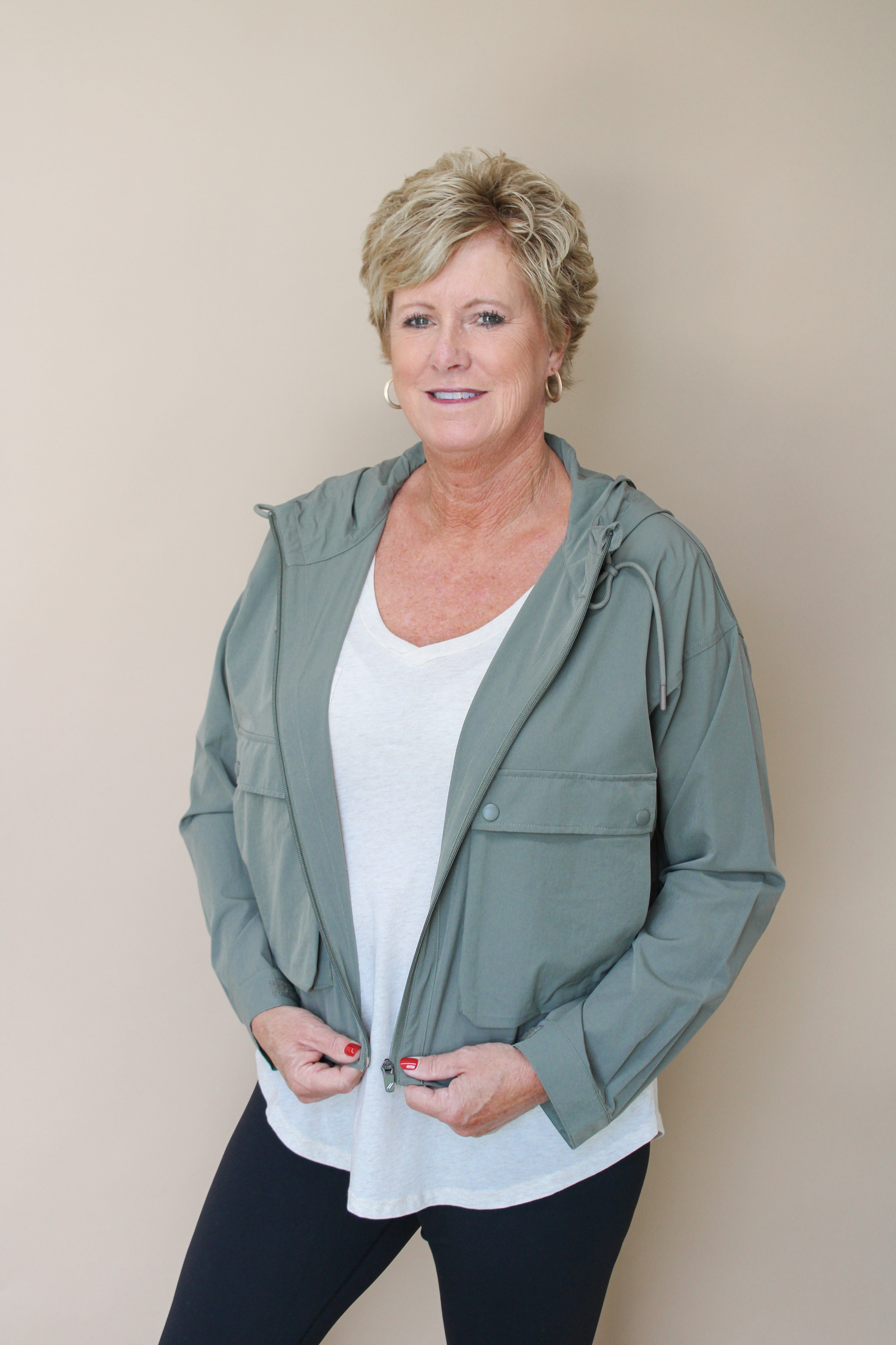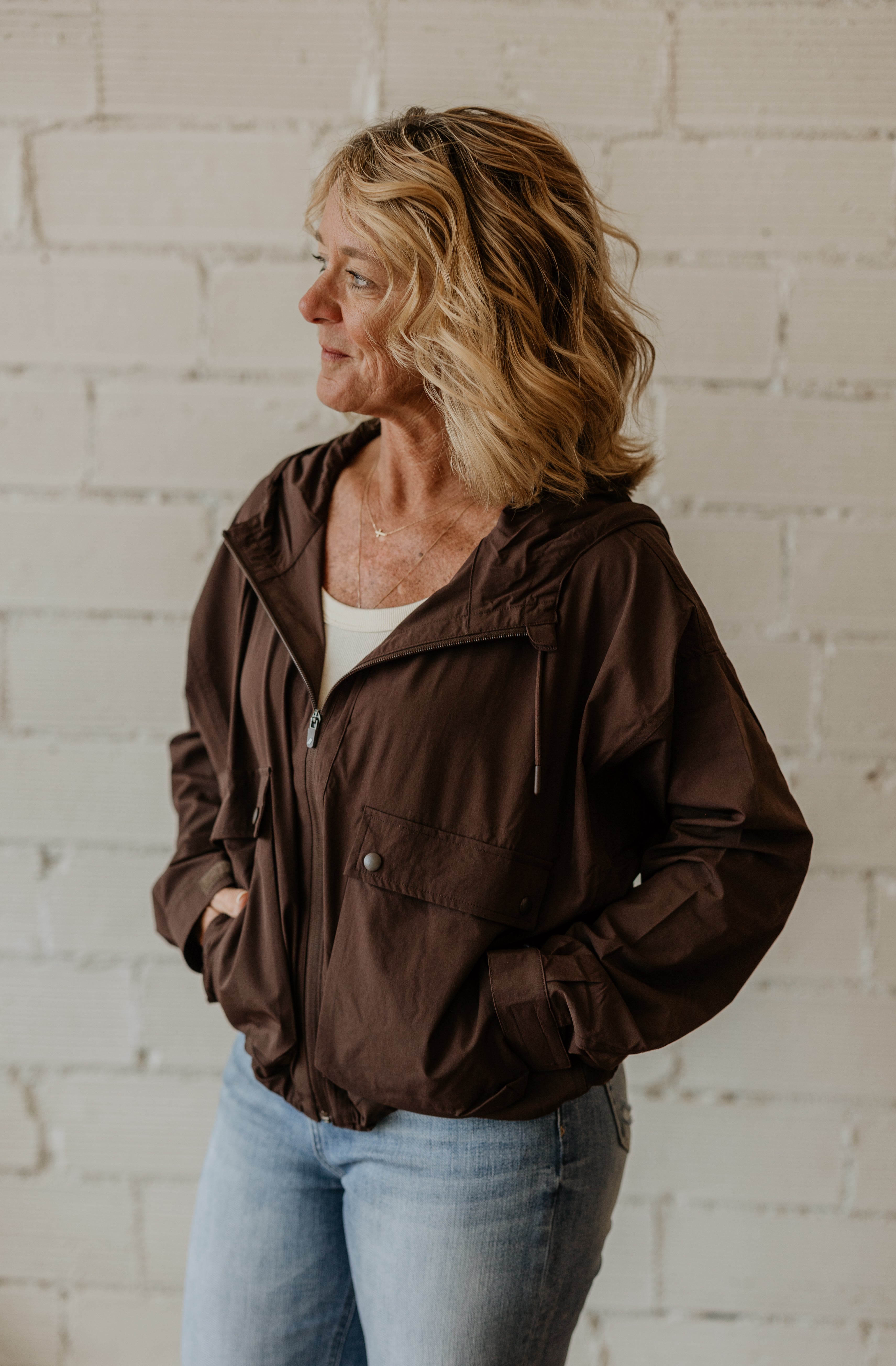 A sporty layer for going to and from workouts or just out and about, this jacket features a nylon windbreaker fabric, adjustable hoodie, and dual box side pockets with snap closures.