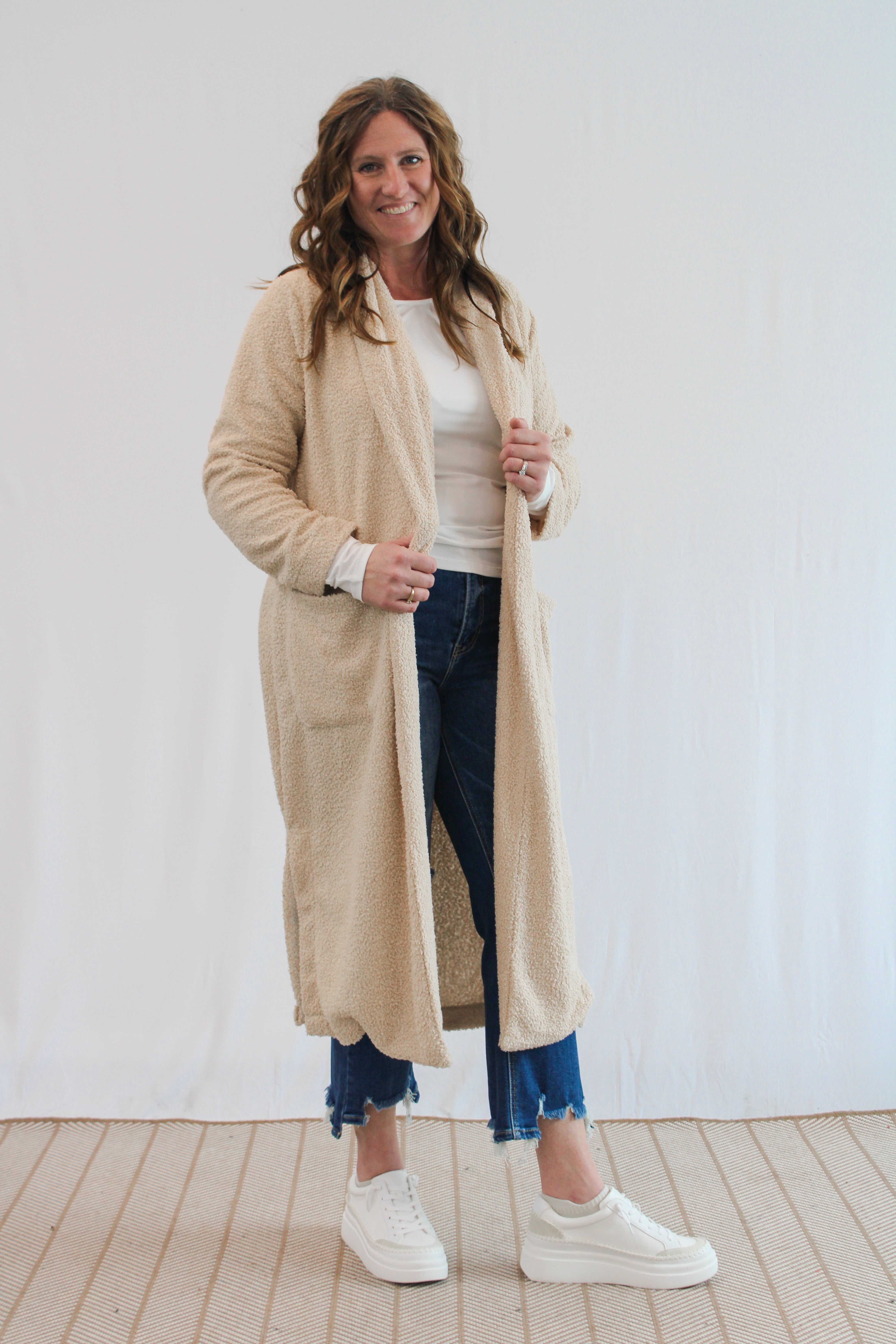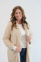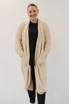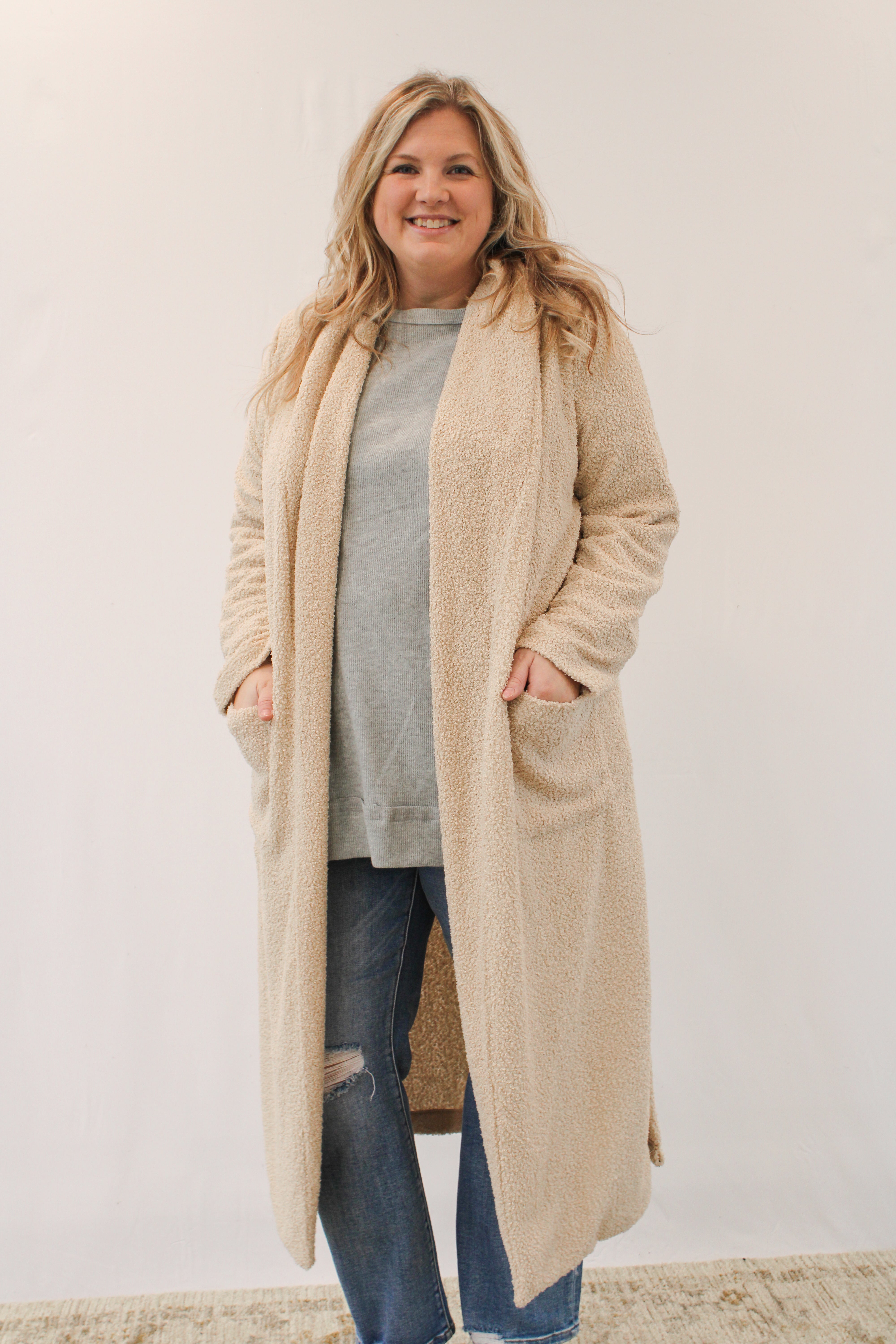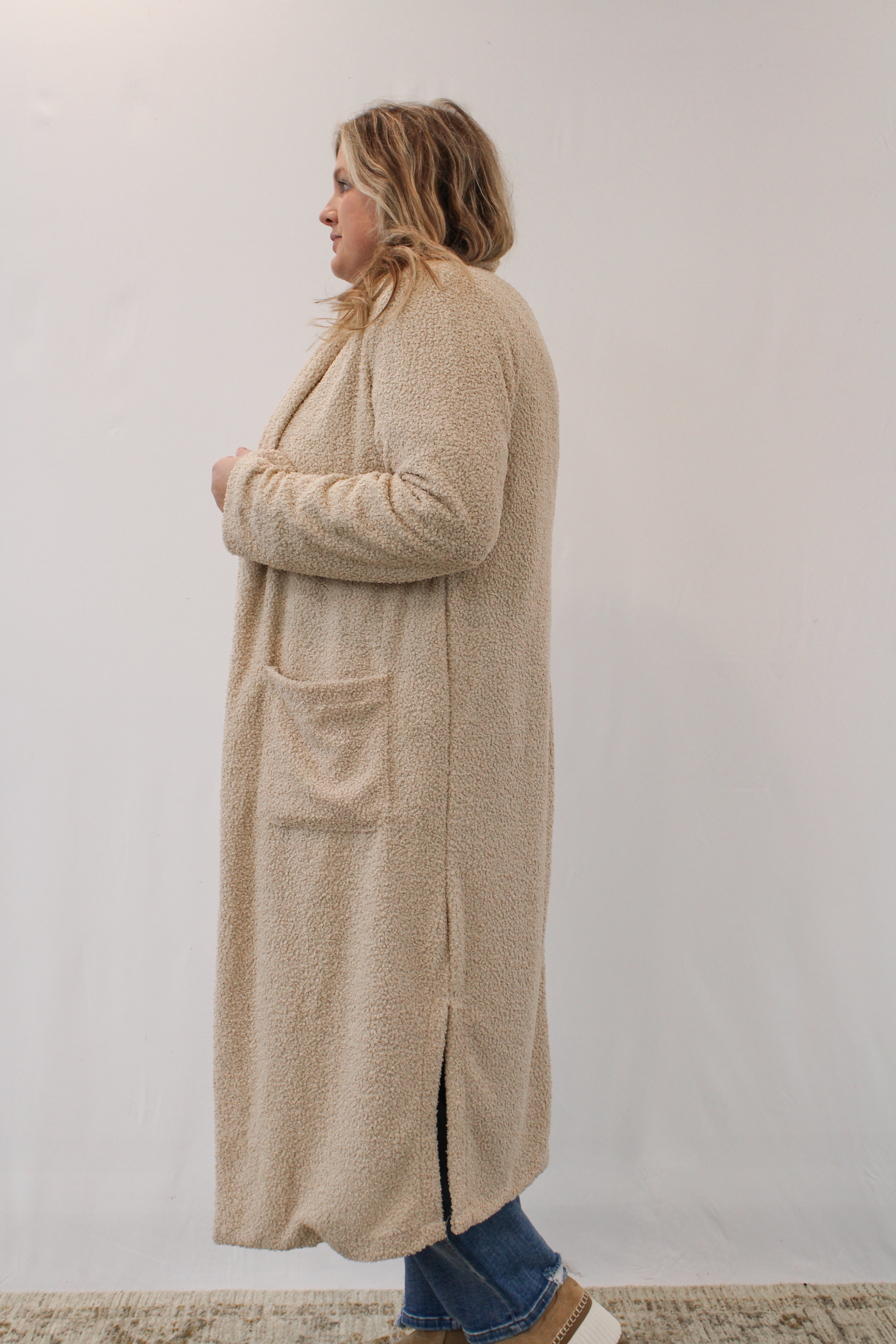 This long taupe teddy coat is the perfect addition to your wardrobe, keeping you warm and stylish on cool days. Its light weight makes it easy to take on and off, and its open design adds a touch of effortless chic to any outfit.