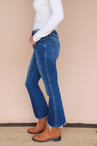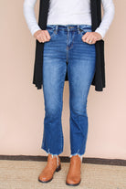 Up your denim game with our SHAYLA REG/CURVY HIGH RISE CROP FLARE jeans. Crafted with 82% cotton, 5% polyester, 12% rayon, and 1% spandex, they provide the perfect balance of comfort and stretch. The high rise and uneven hem add a touch of flair to your look. Get ready to rock these with a front rise of 10 1/4", inseam of 27", and leg opening of 18 1/2".
