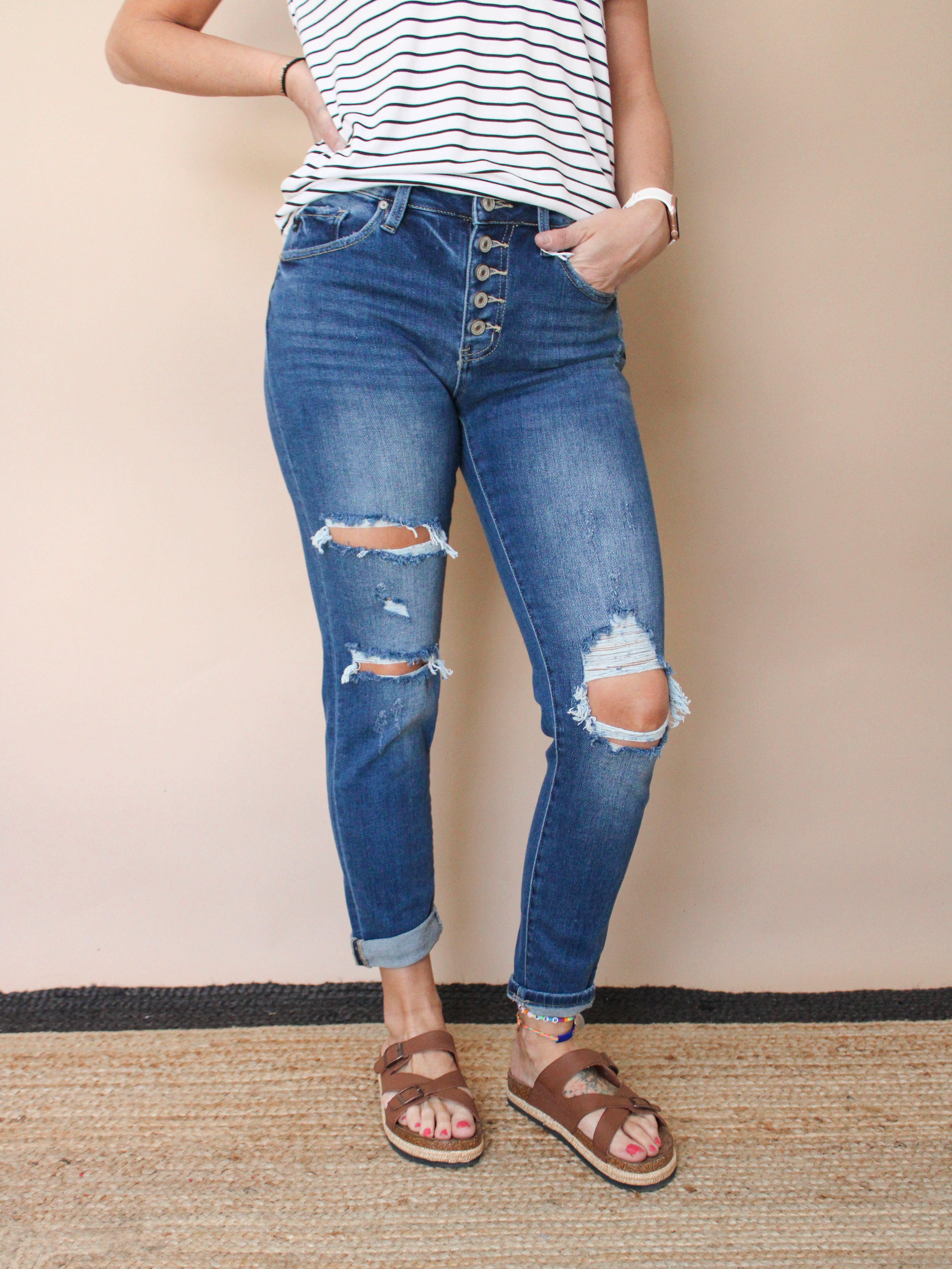 HIGH RISE BUTTON DOWN GIRLFRIEND JEANS BY IVY & CO