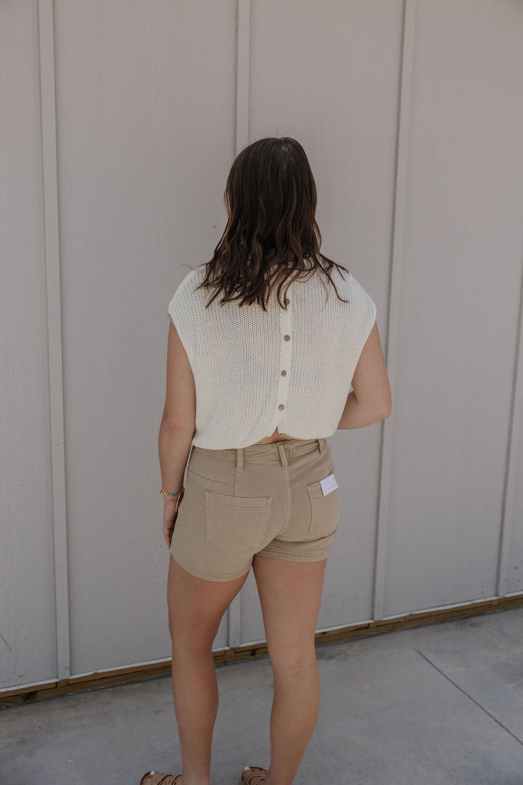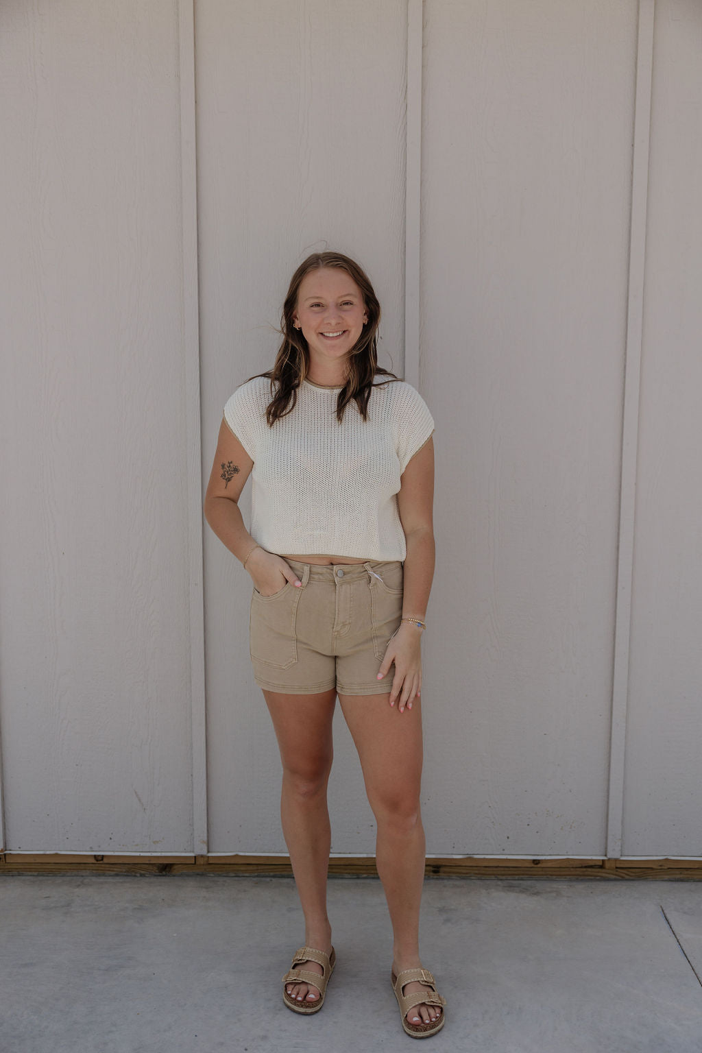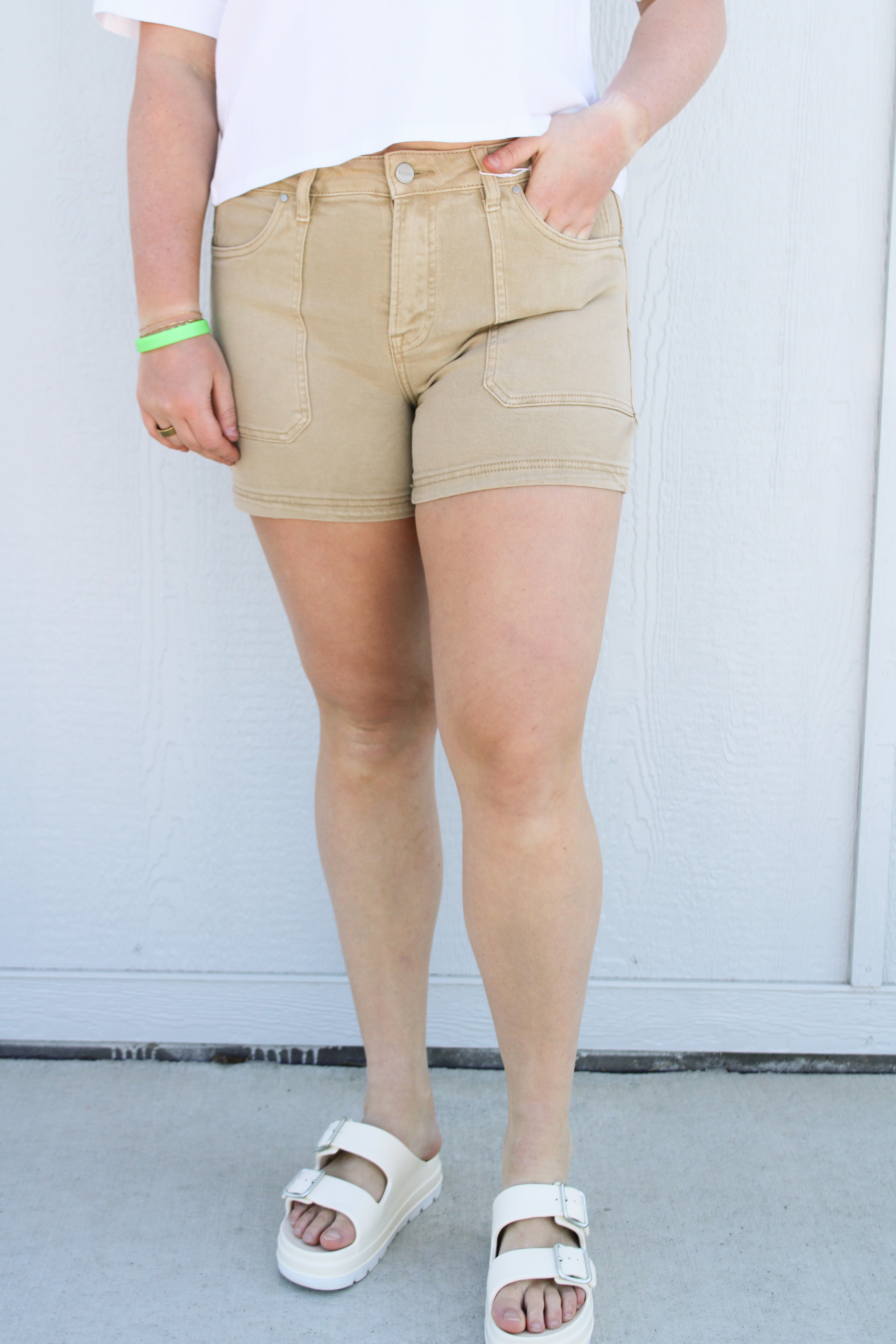 Add some edge and versatility to your wardrobe with our Risen Mid-Rise Front Patch Pocket Shorts. Made with olive denim and featuring convenient front patch pockets, these shorts are a must-have for any fashion-forward individual. Upgrade your style game with these essential shorts.