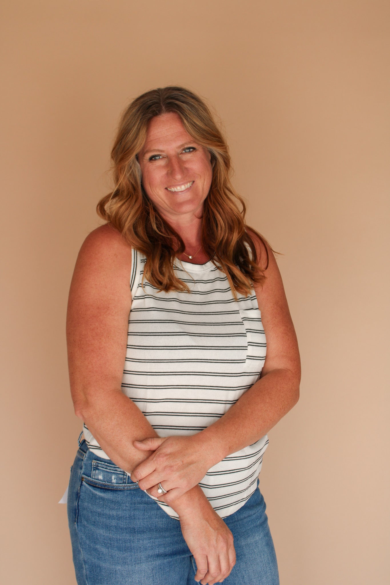 This playful striped tank top features a cozy hacci fabric that feels soft against your skin. With a classic round neck and a handy chest pocket, it’s perfect for layering or wearing solo on sunny days. Sleeveless and stylish, it adds a fun, casual vibe to any outfit.