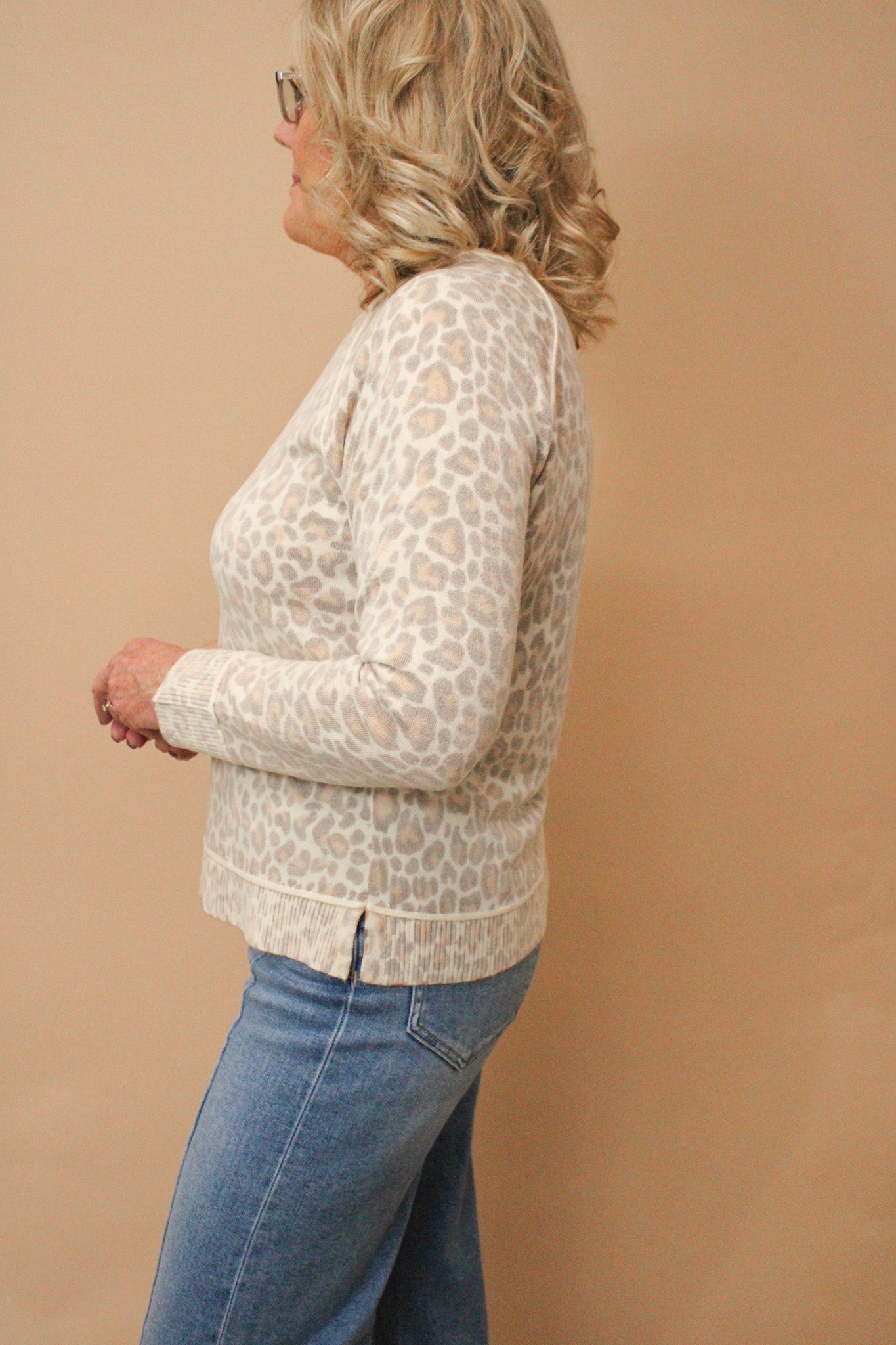 Stay cozy and chic in the Faylyn Muted Leopard Sweater, featuring subtle leopard spots that add just the right amount of wild. Side slits give it a relaxed fit, while ribbed cuffs keep you snug and stylish. Perfect for layering or wearing solo, this sweater brings a playful twist to your everyday look.