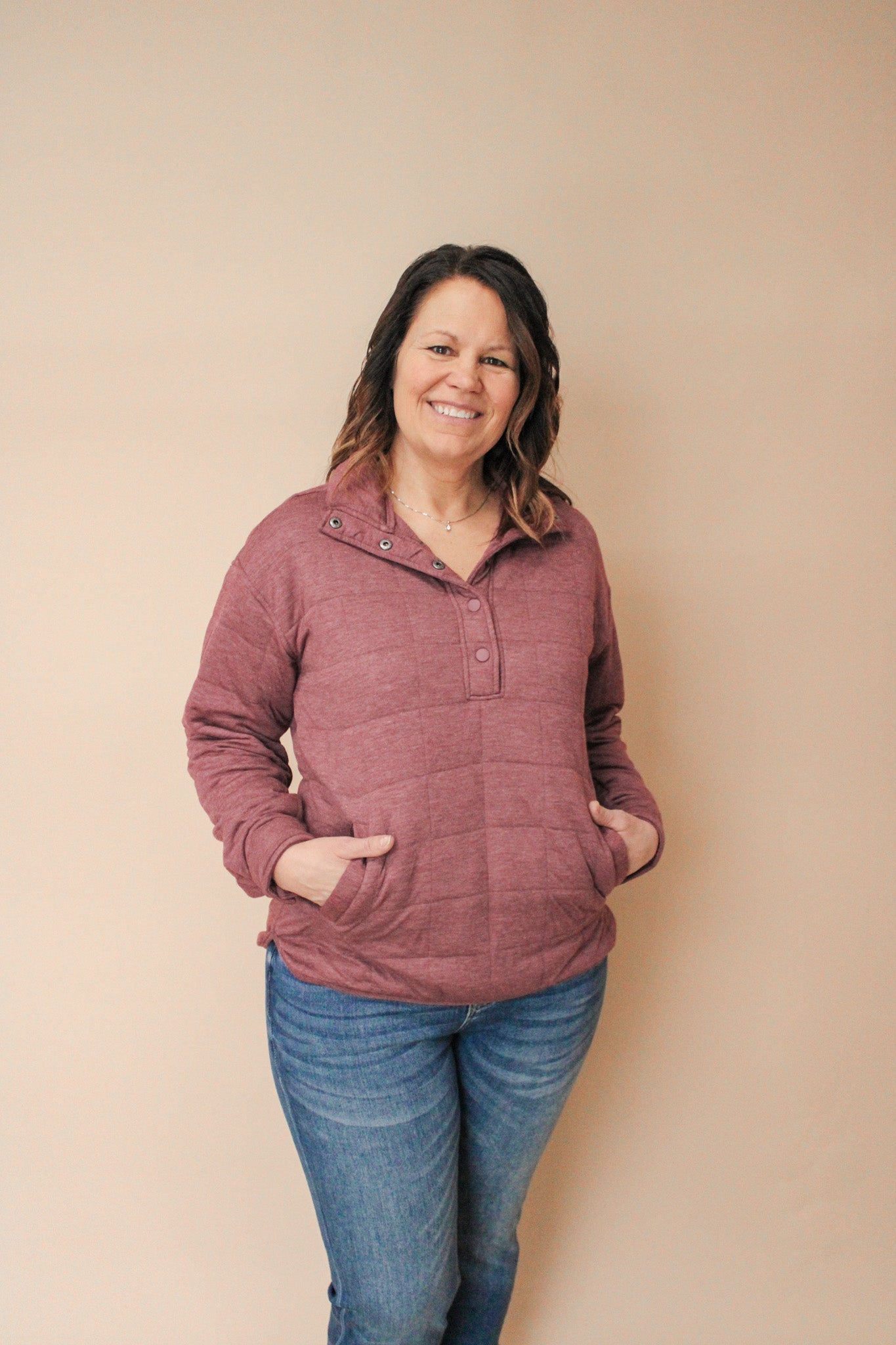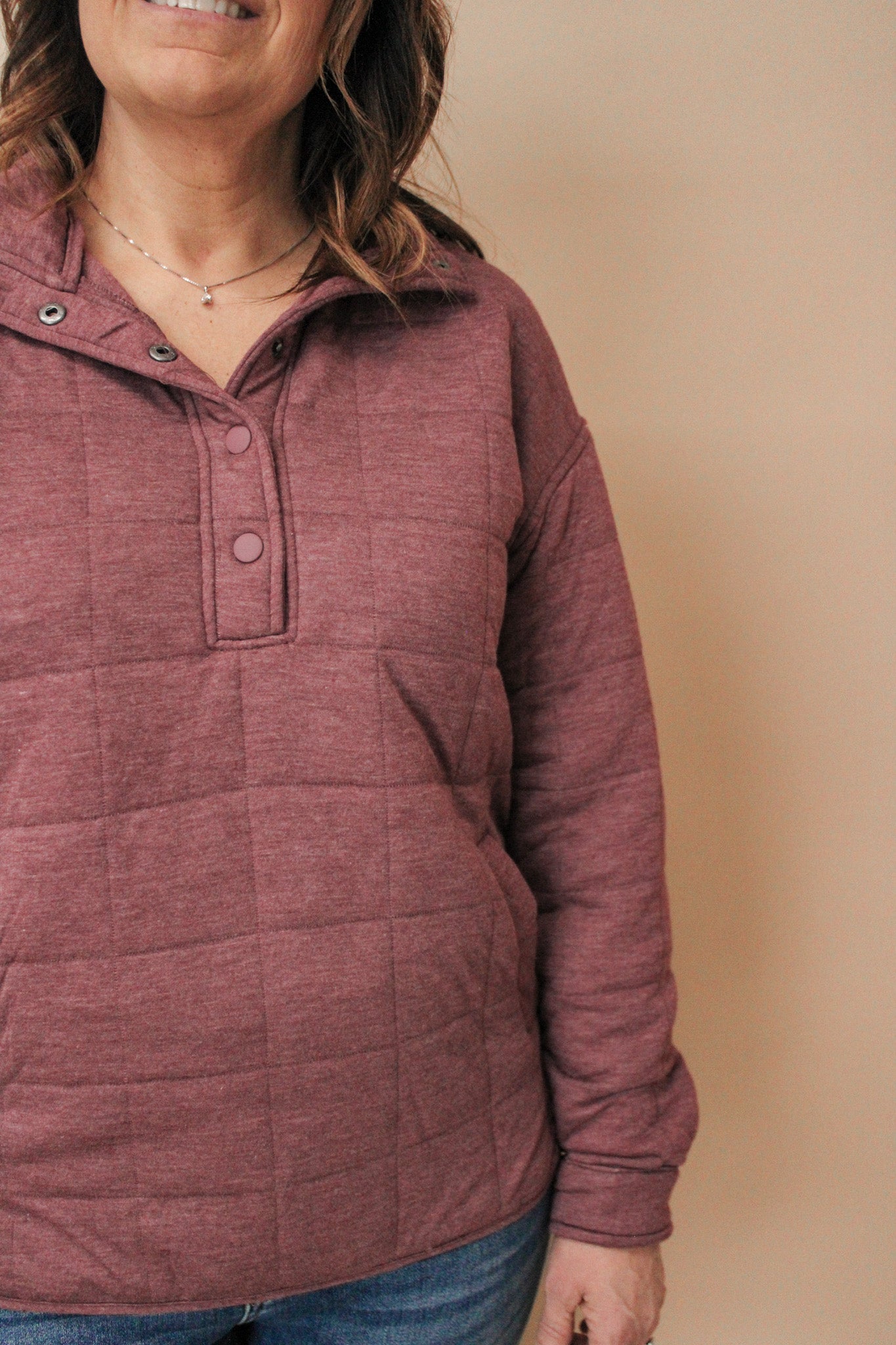 So comfy and soft, this oversized quilted knit pullover is featured with a half snap front closure, dual side pockets and drop shoulder silhouette.