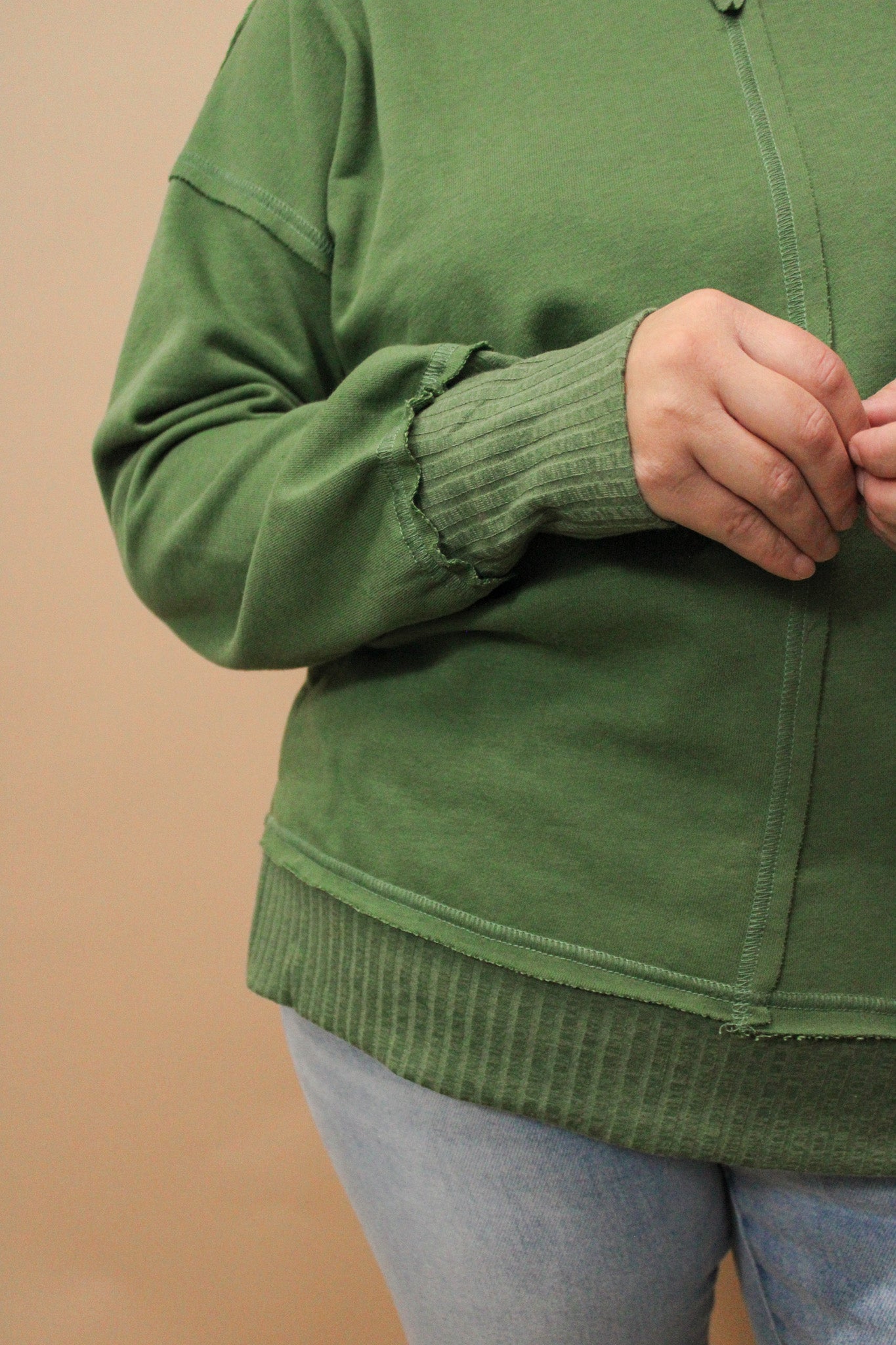Cozy meets cute in this long-sleeve French terry top, featuring ribbed contrast and charming stitching details. Perfect for adding a playful twist to your everyday look while keeping you comfy and stylish all day long.