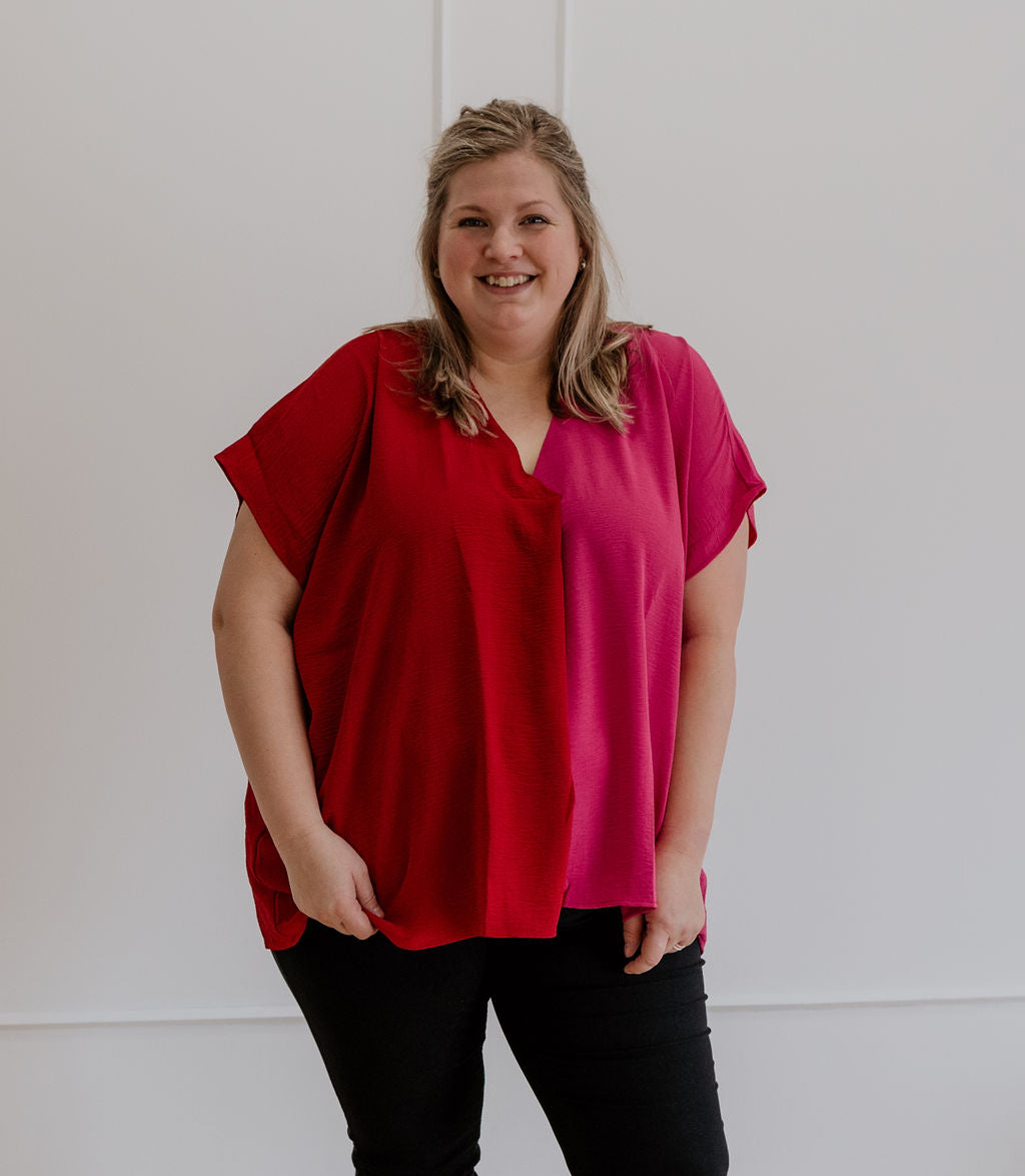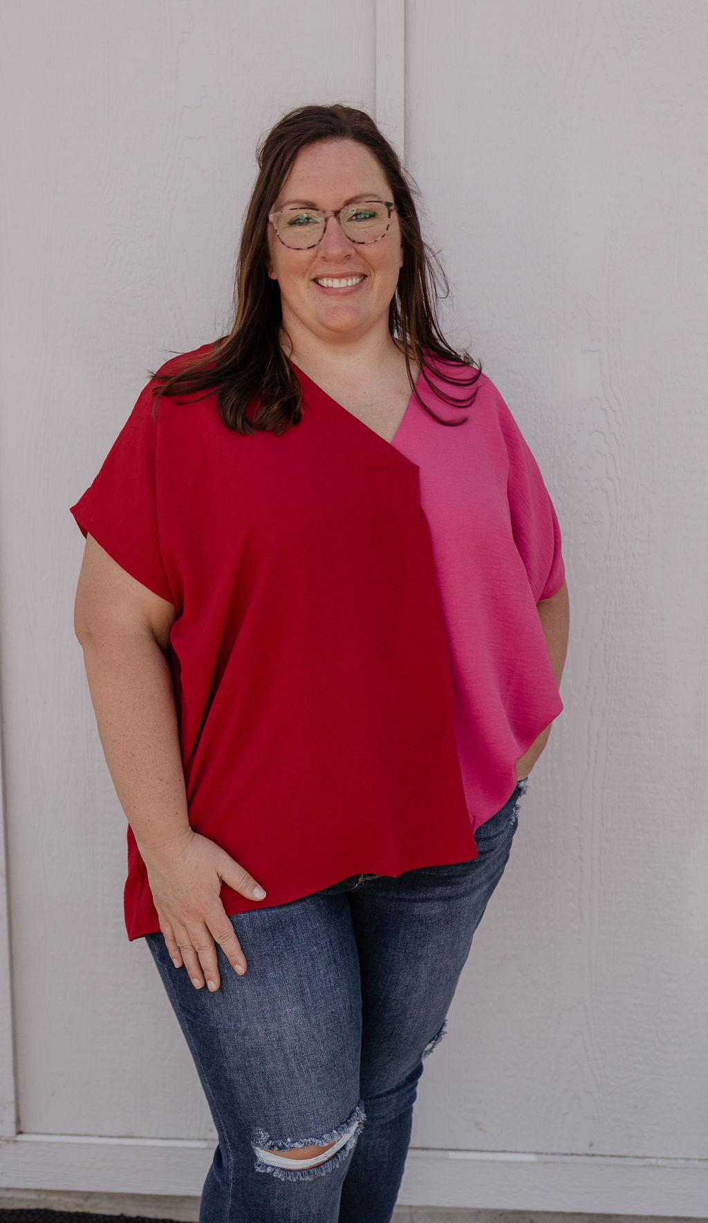 An easy, but stunning top that is perfect for Valentines Day or layering with your favorite cardigan. Features a colorblock of pink and red.