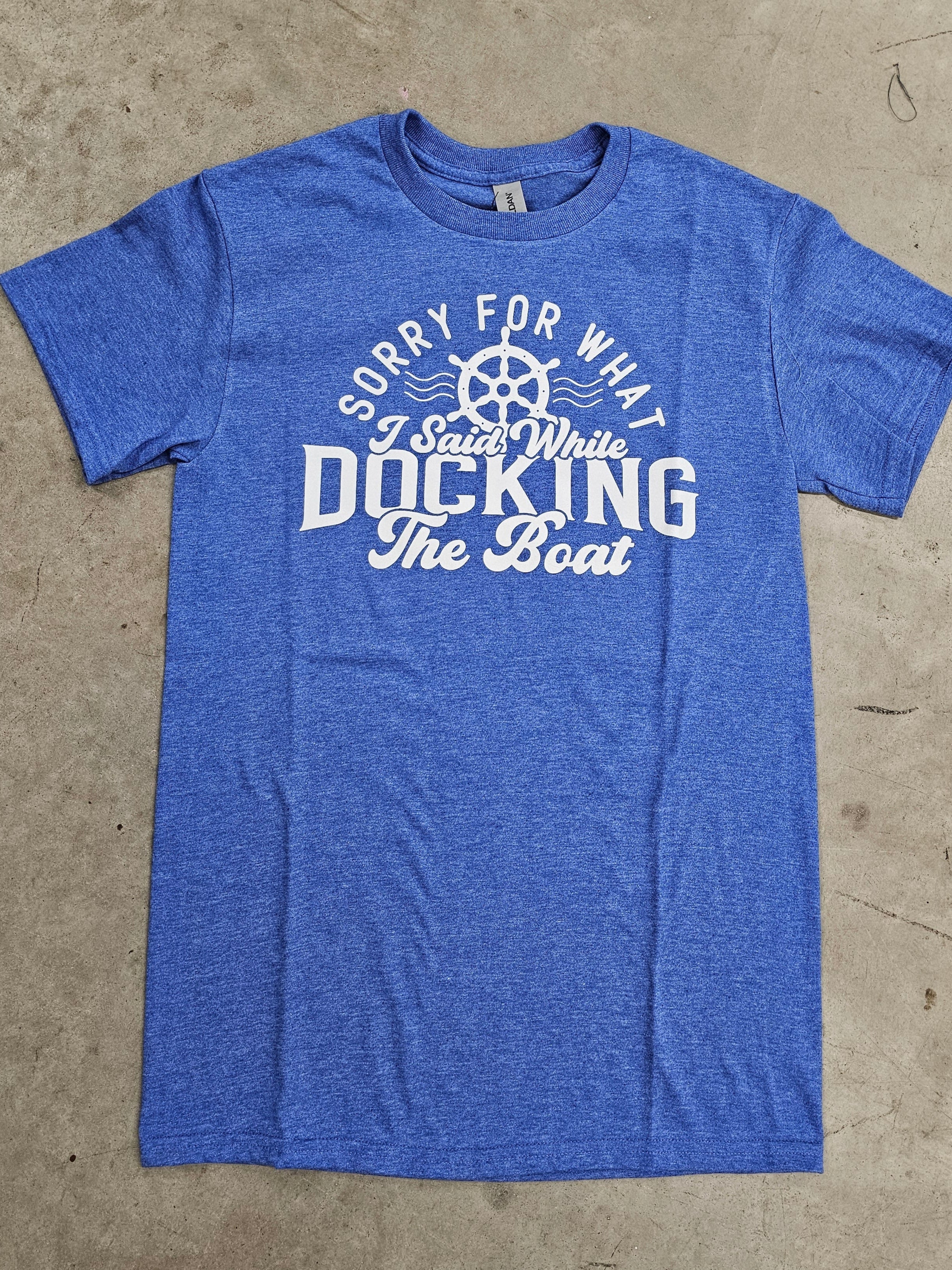 This royal blue tee is a must-have for boating enthusiasts with a sense of humor. Front and center, it features the phrase "I'm sorry for what I said when I was docking the boat" in clean, nautical-themed typography. The text is white or light gray for high contrast, with key words like "sorry" and "docking the boat" in a bold or script style to add emphasis and personality.