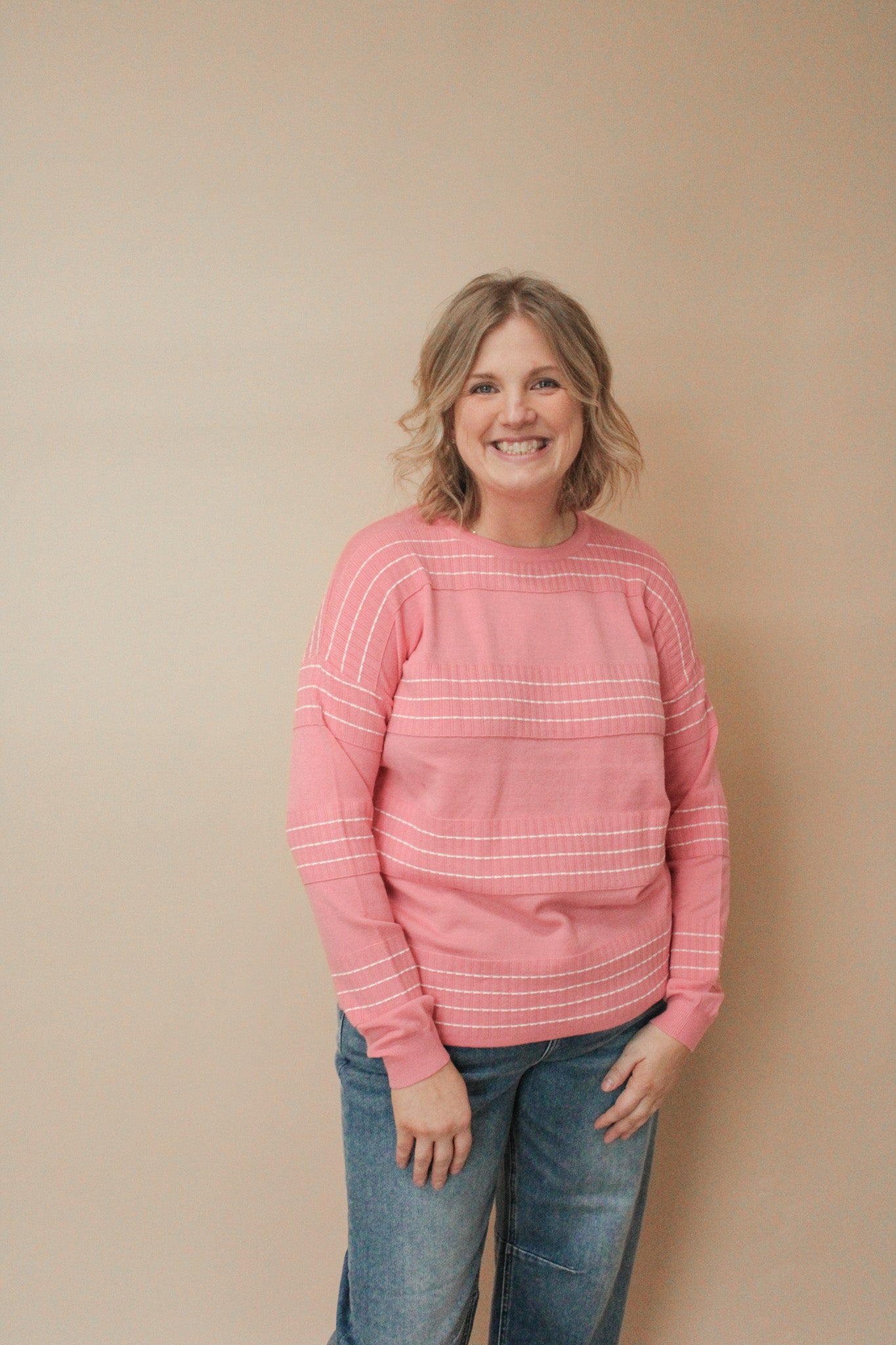 Get cozy and stylish with our NIKKI STITCHED STRIPE SWEATER! This light weight crewneck sweater features a unique stitch strip design and long sleeves for added warmth. Perfect for a casual day out or a cozy night in. Stay warm and fashionable with this must-have sweater.