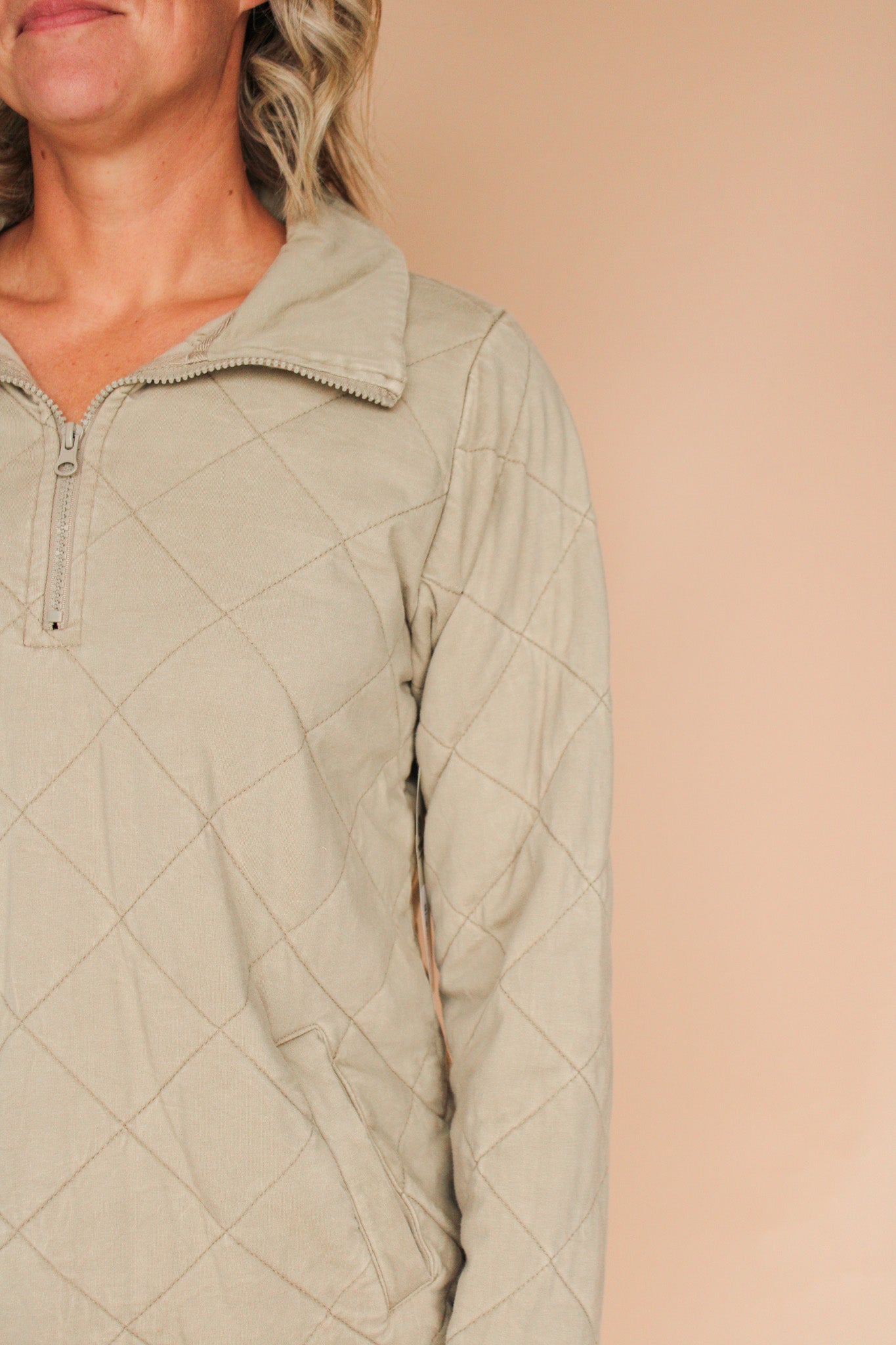 Get cozy with the LAIKE MINERAL-WASHED PULLOVER! With a quilted half zip design and a versatile taupe color, this pullover is perfect for any chilly day. Stay stylish and warm all at once.