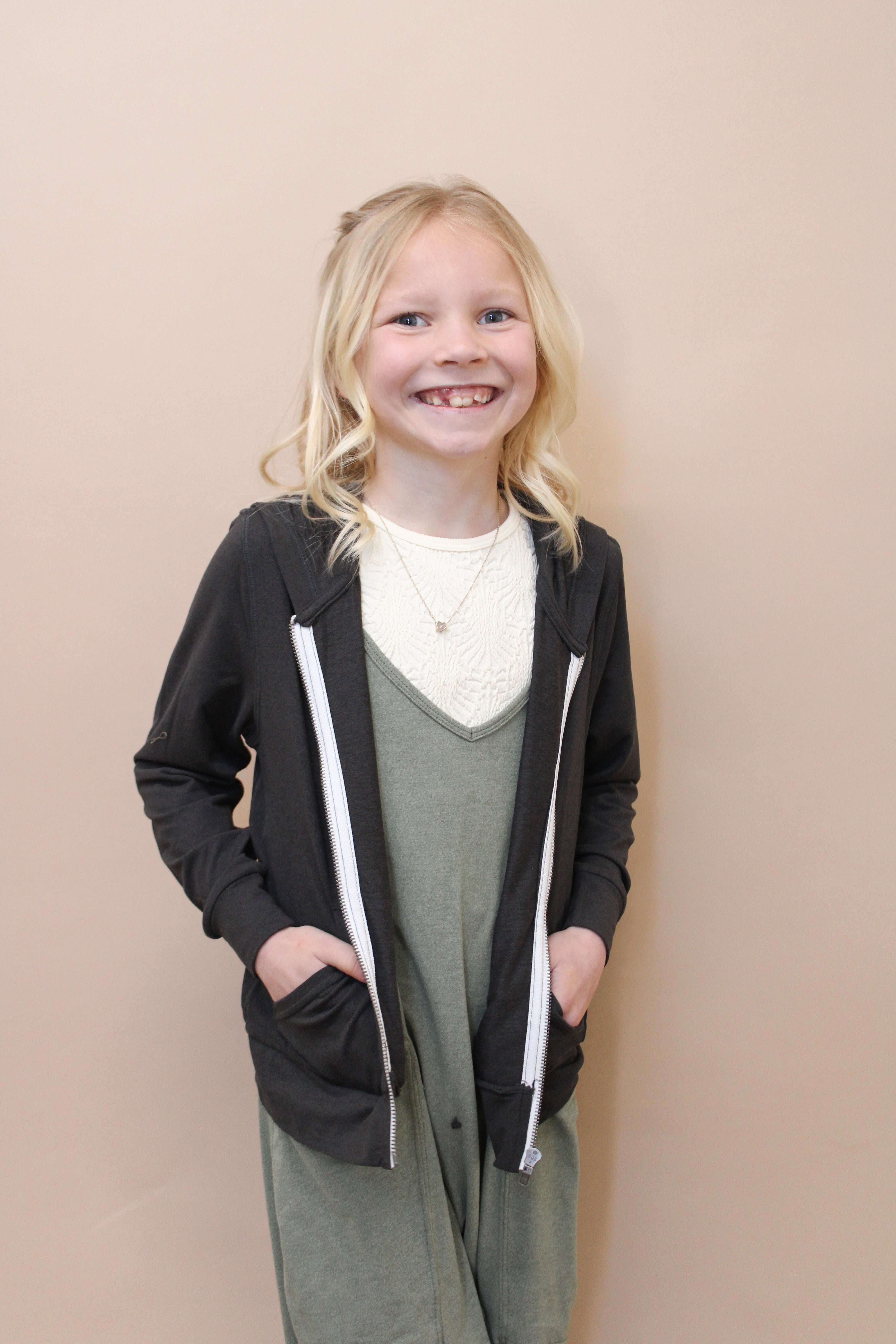 Introducing the perfect blend of comfort and style! Made specifically for kids, this full zip black hoodie is perfect for all their yoga adventures. Say goodbye to struggle and hello to effortless relaxation. Namaste in style with this zip-up!