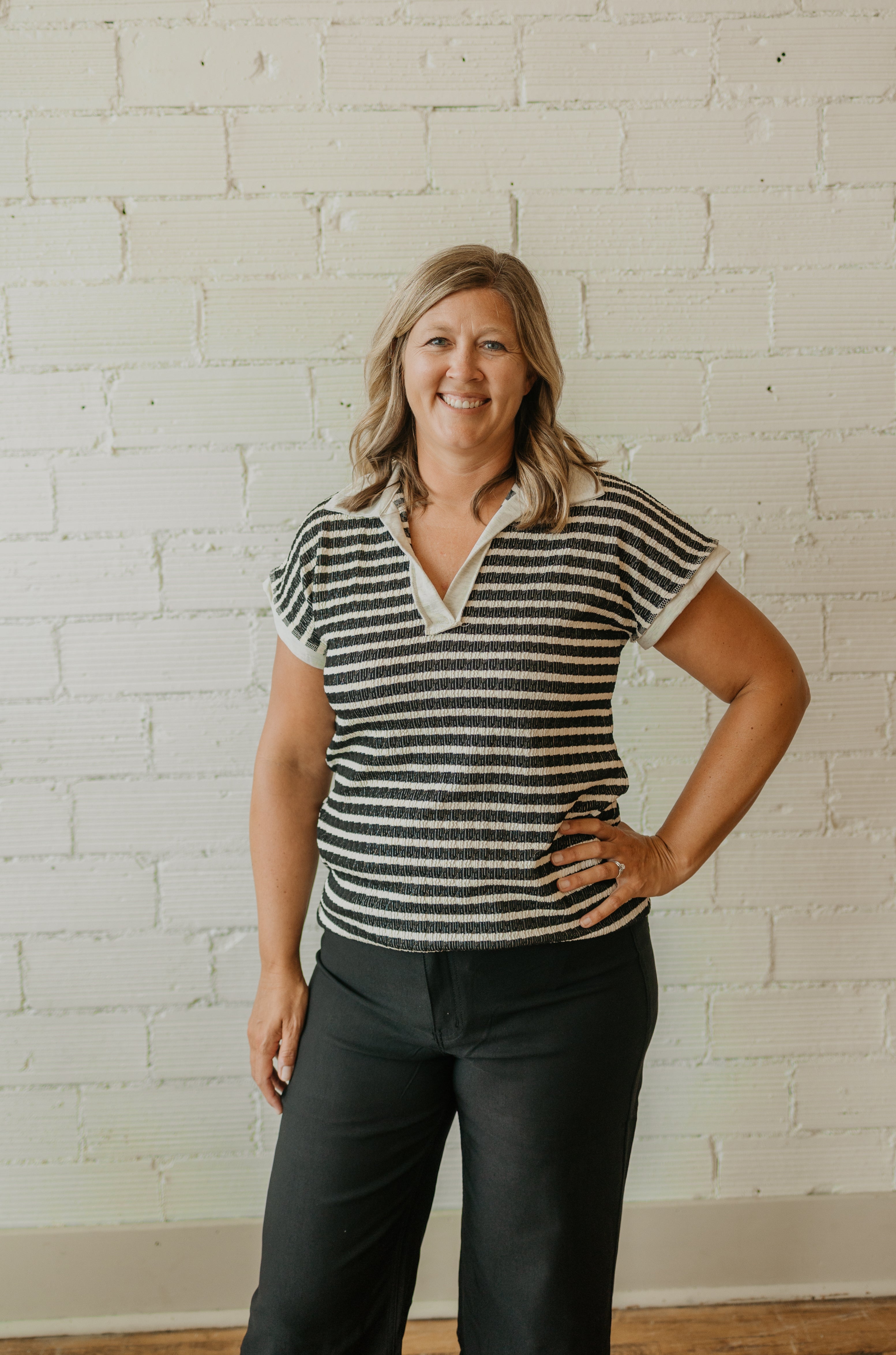 This playful short-sleeve top features a chic mandarin collar and eye-catching jacquard fabric. Bold contrast stripes add a fun twist, making it perfect for adding a pop of personality to your everyday look.