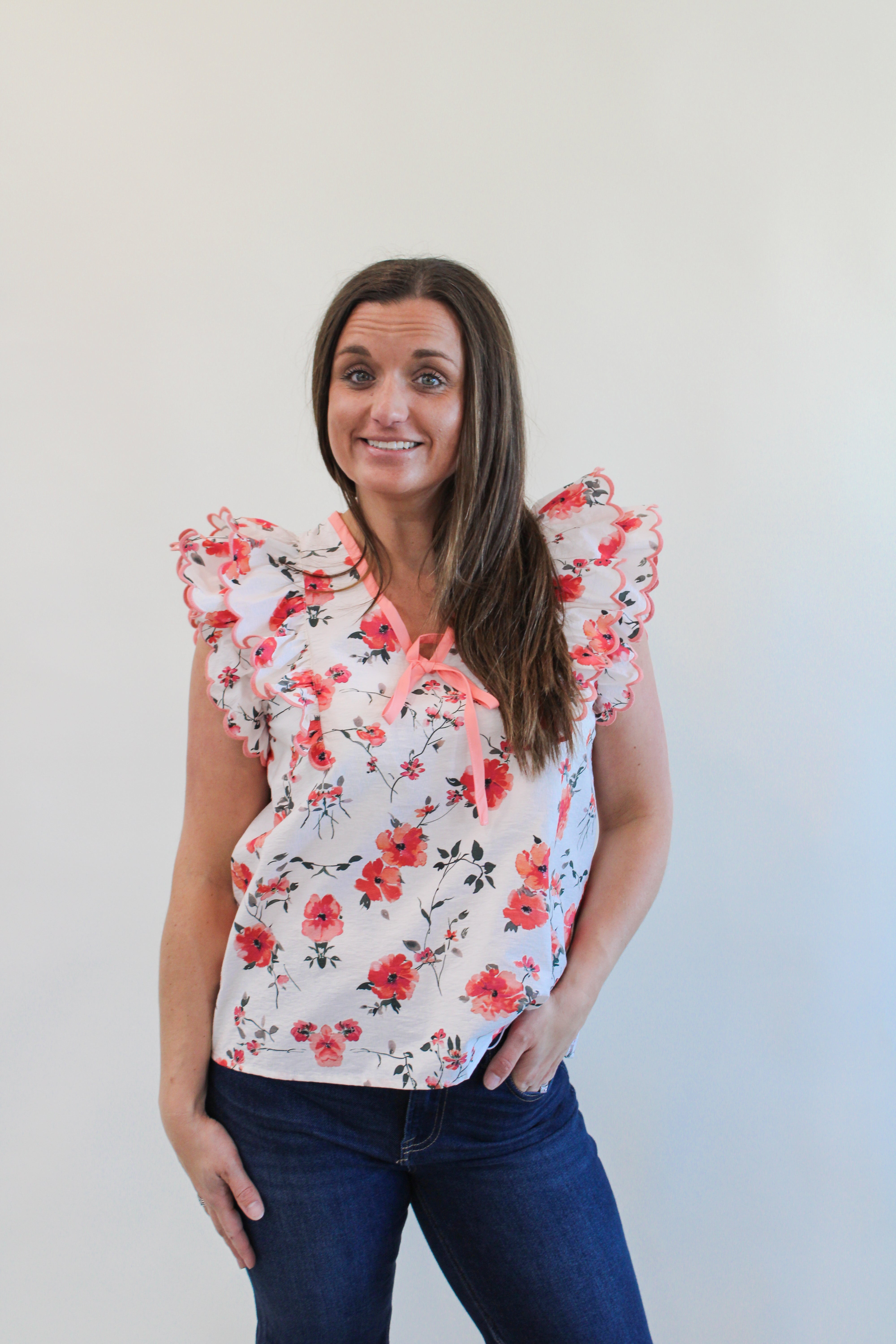 Be the talk of any event in the LESLEY FLORAL BLOUSE. With its playful floral print, coral bow detail, and ruffle sleeves, it's the perfect top to elevate any outfit. Dress up and stand out with this quirky and fun V-neck blouse!