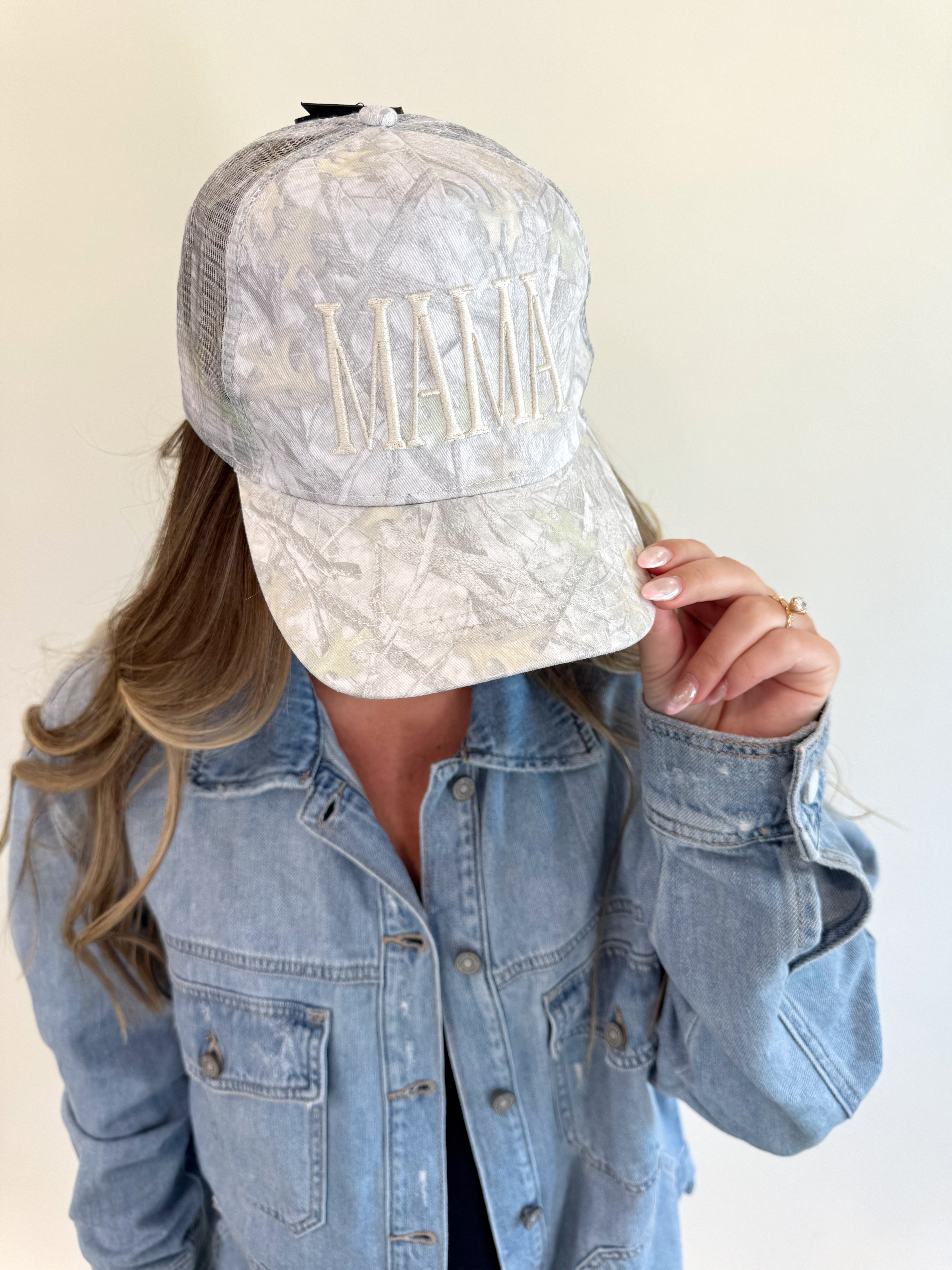 Show your mama pride in laid-back style with this chic camo trucker hat. Featuring a soft, muted camouflage print and bold ivory "MAMA" embroidery across the front, this hat combines trendy flair with everyday comfort. The breathable mesh back and adjustable snap closure ensure a relaxed, customizable fit—perfect for on-the-go days, errands, or casual outfits. Whether you're at the ball field or out for coffee, this hat is your go-to mom essential.