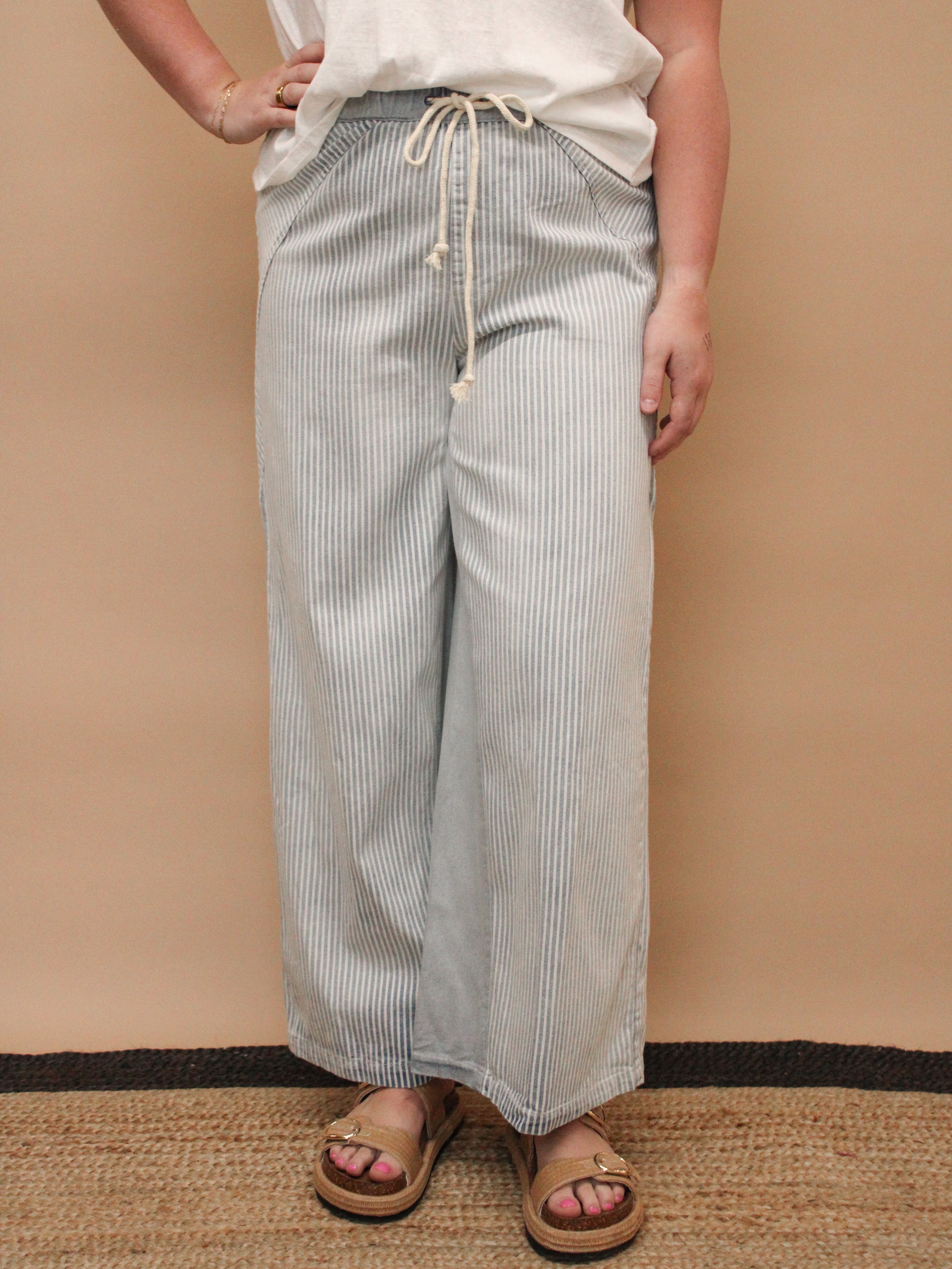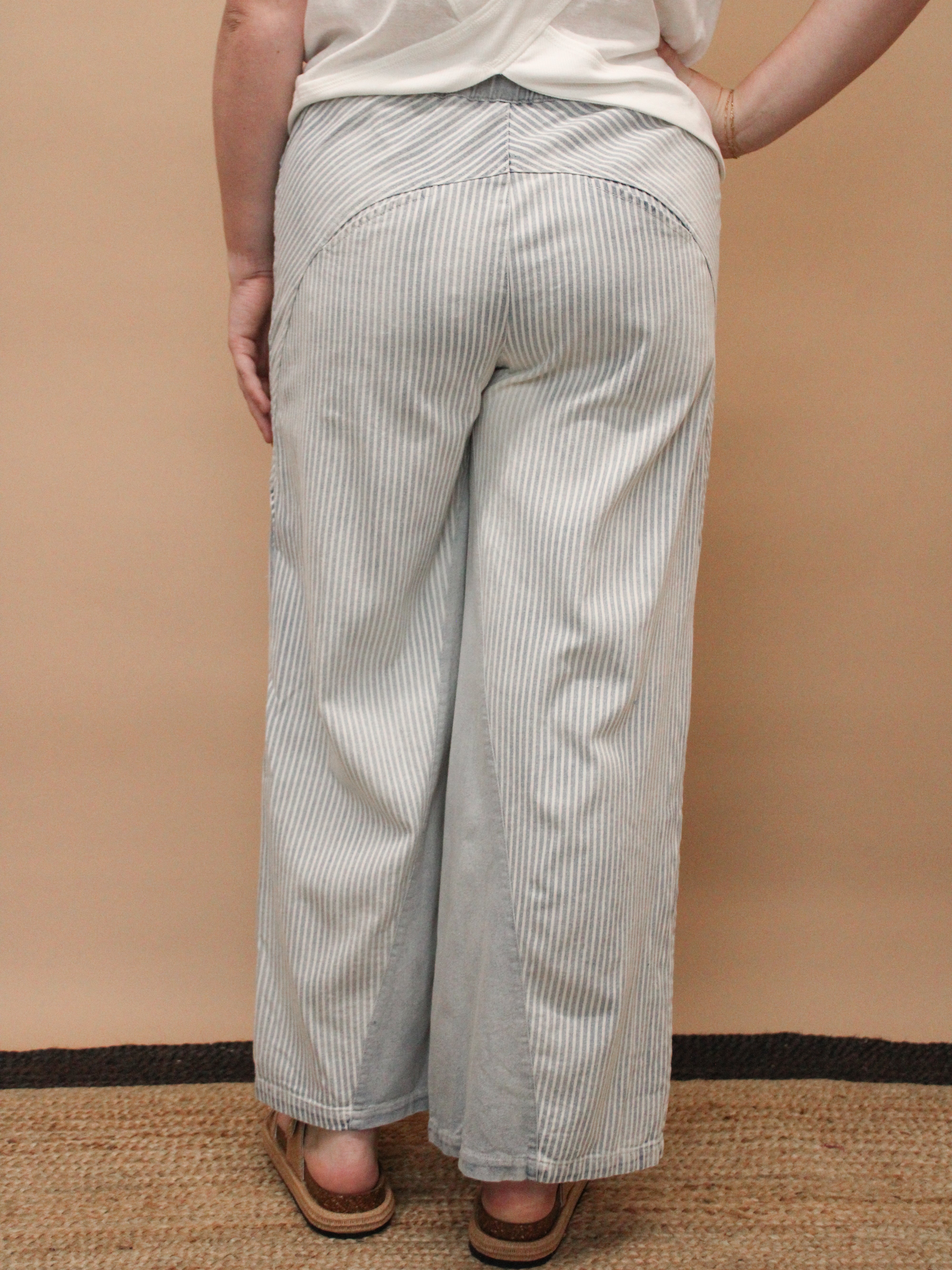 Dive into comfort with these mineral washed drawstring pants! The light blue and white pinstripes play peek-a-boo with funky chevron panels on the sides and back. Slip into the elastic waistband, give the rope drawstring a playful tug, and strut your stuff in these straight-leg wonders. Hidden back pockets? Yes, please! Perfect for days when you want to look put-together without actually trying.