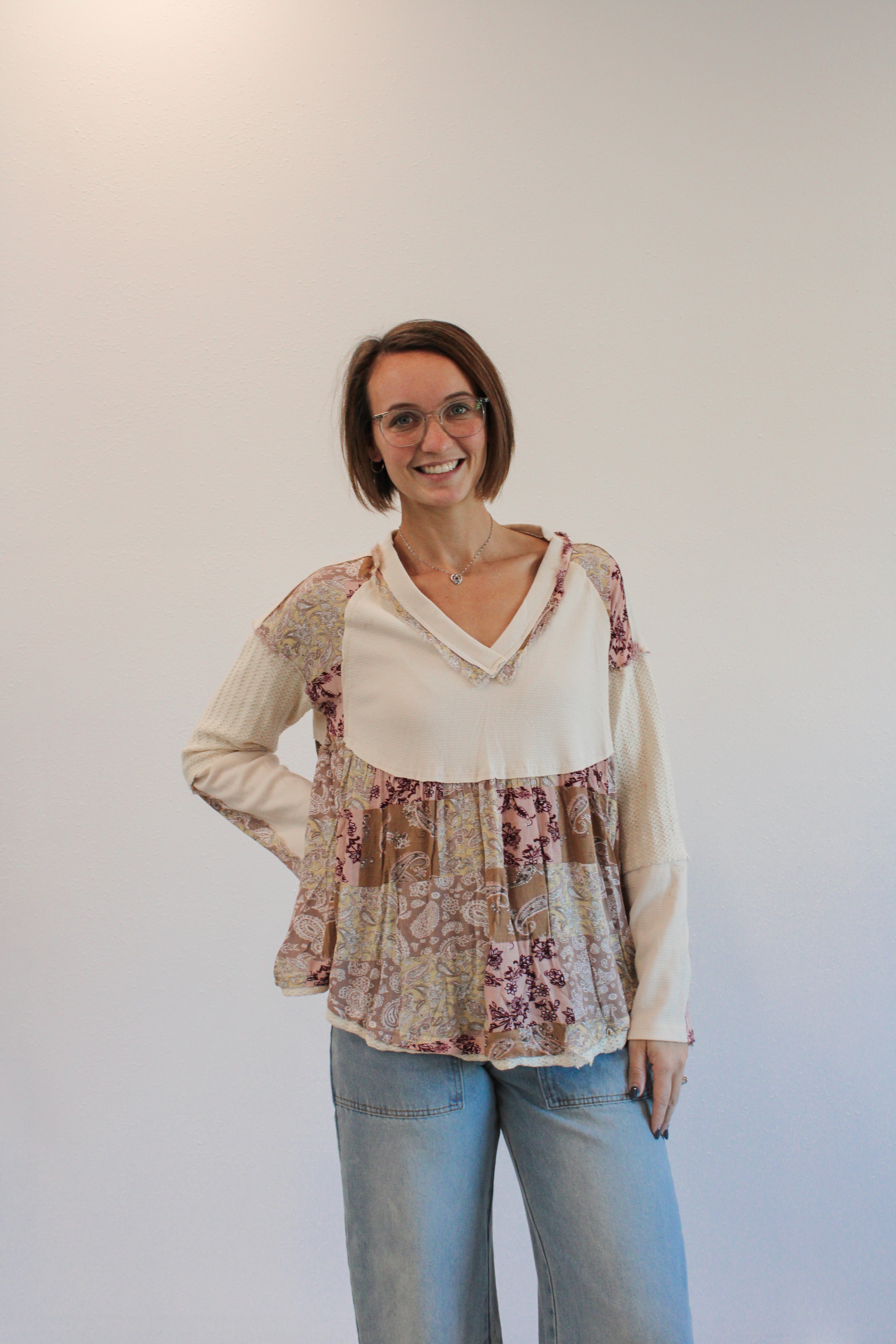 Feel free to summit with this overlay printed top! Designed with a flattering V-neck and full sleeves, it features a unique raw edge detail and bold pointed print pattern. Perfect for any adventure or everyday wear.