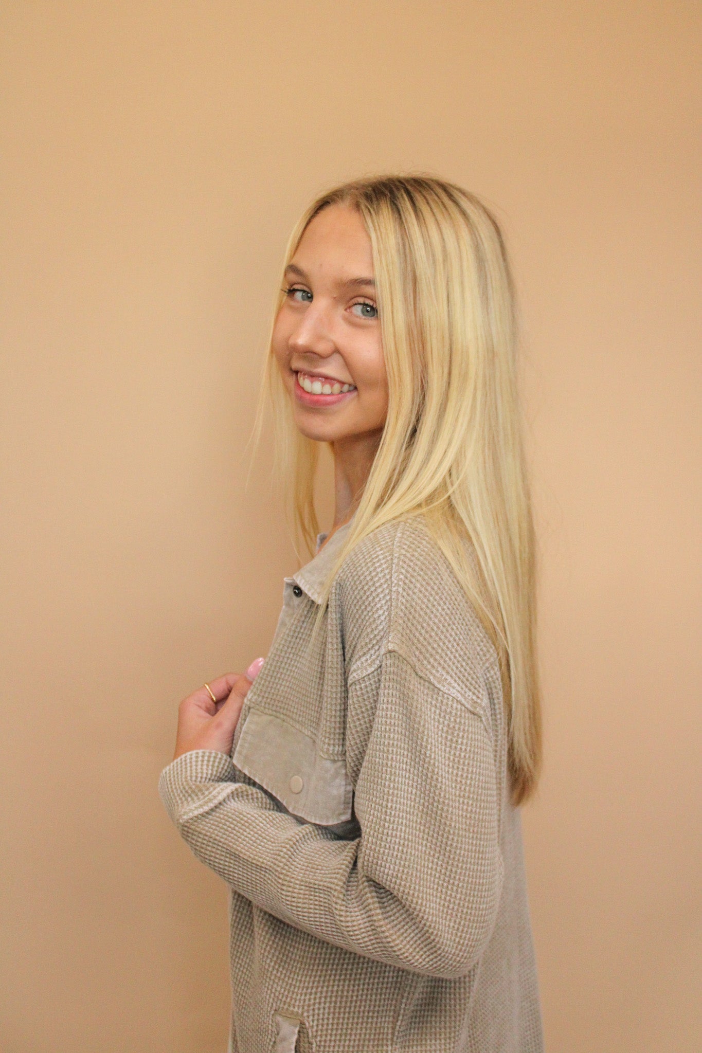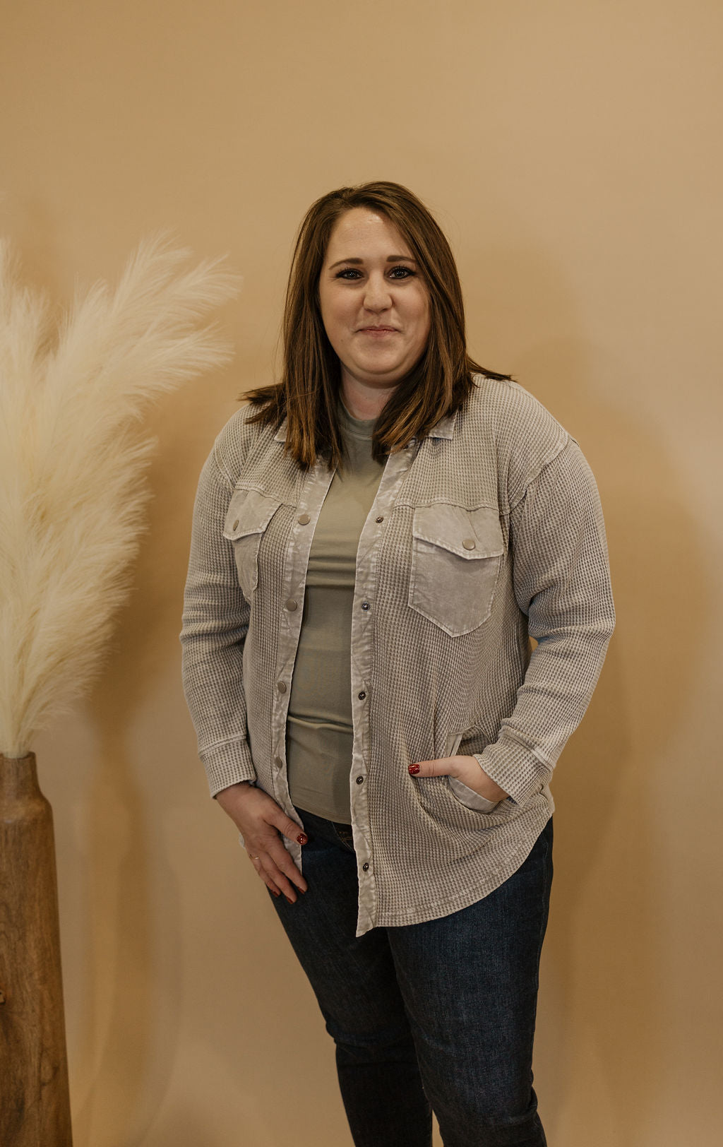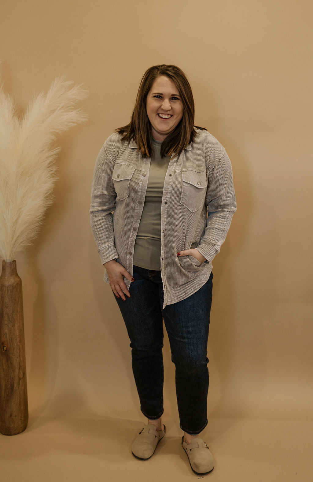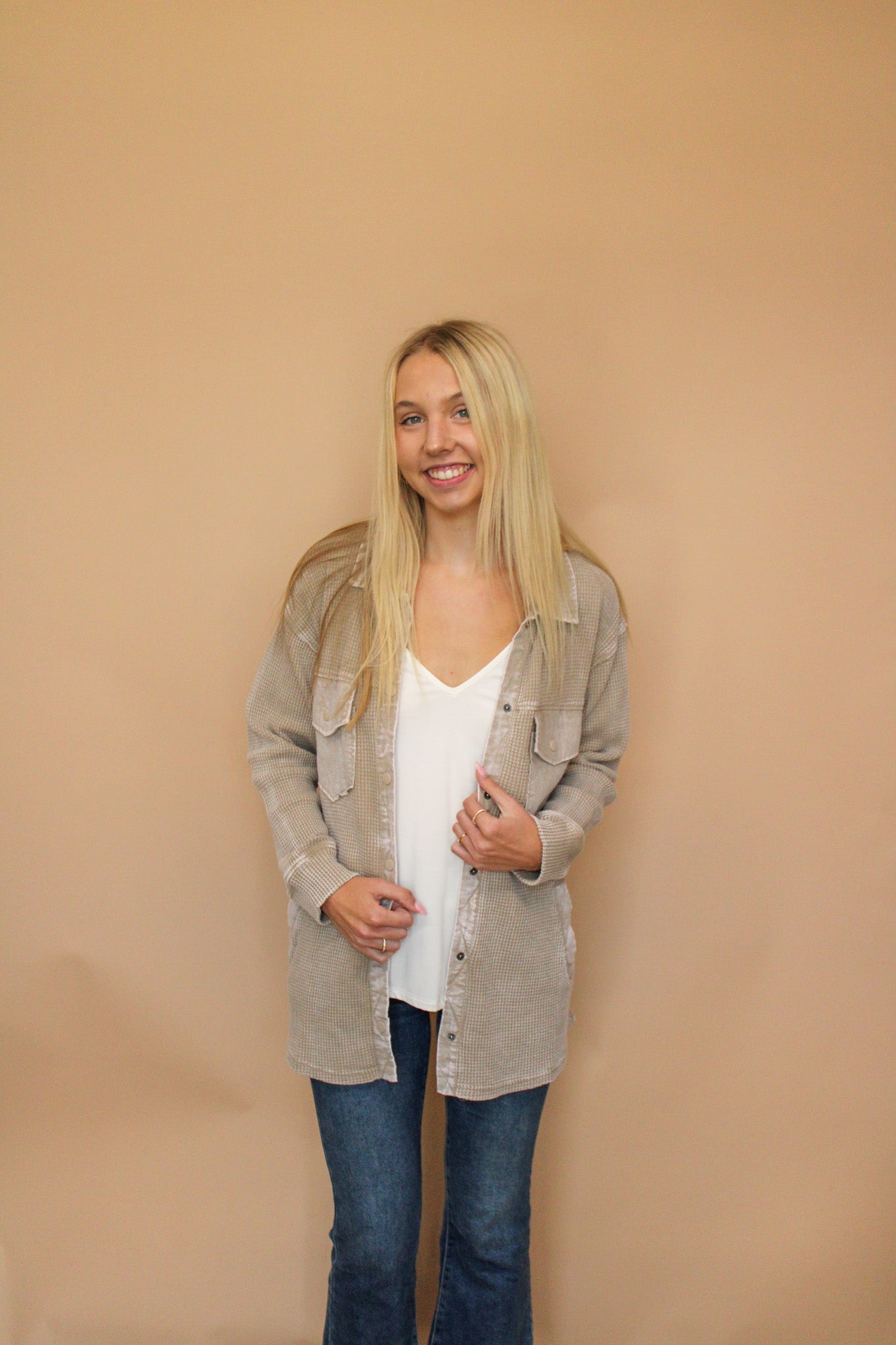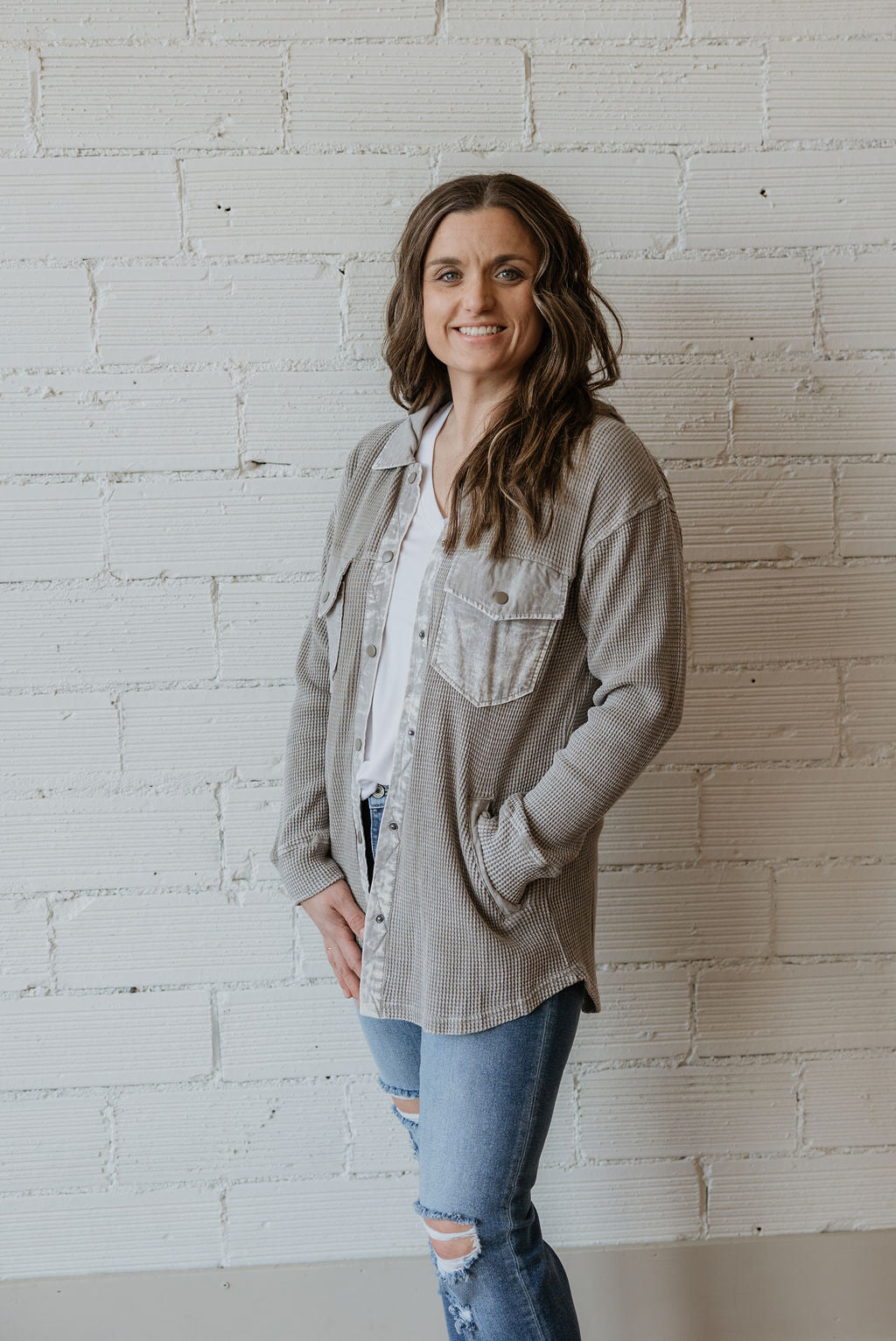 Waffle knit mineral washed button down top pairs perfect over a graphic tee
