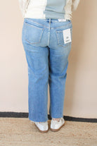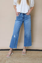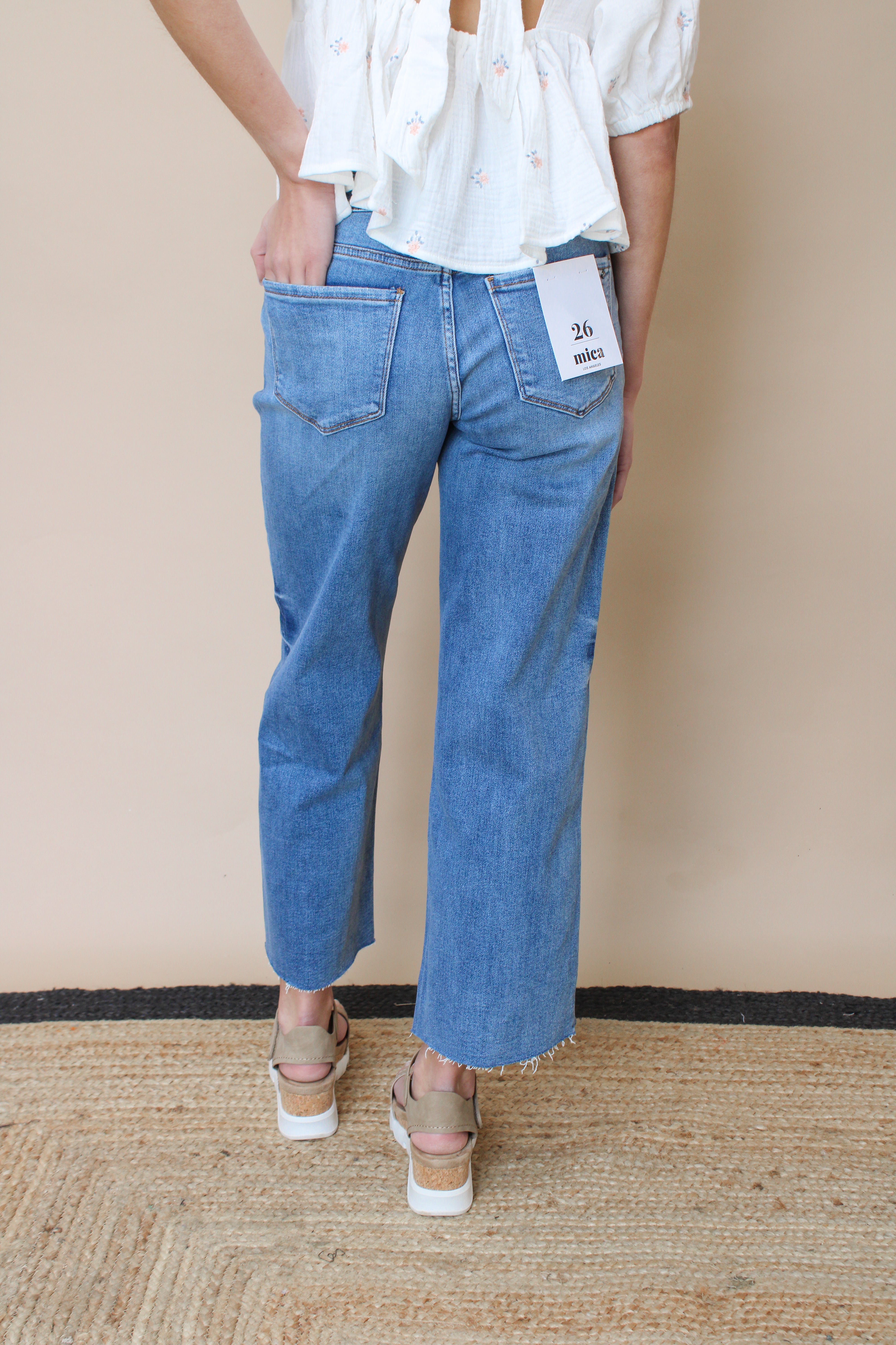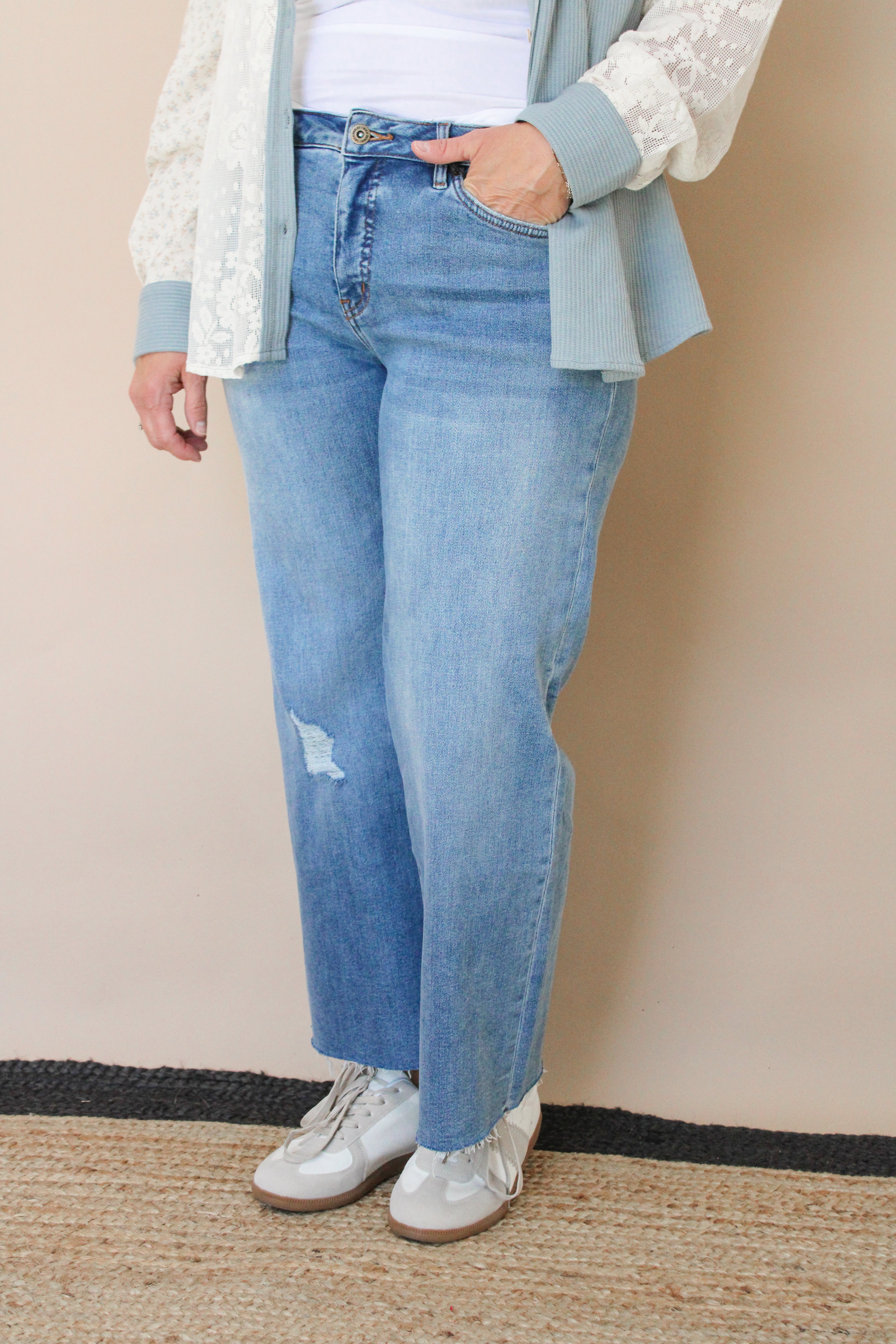 Transform your look with our MAGGIE MID RISE WIDE LEG jeans in Morning Blue. Designed with Tummy Tuck Control, these jeans cinch your waist for a flattering fit. Crafted from a cotton blend with a touch of stretch, they offer comfort and style. Get ready to rock that 20" wide leg!