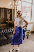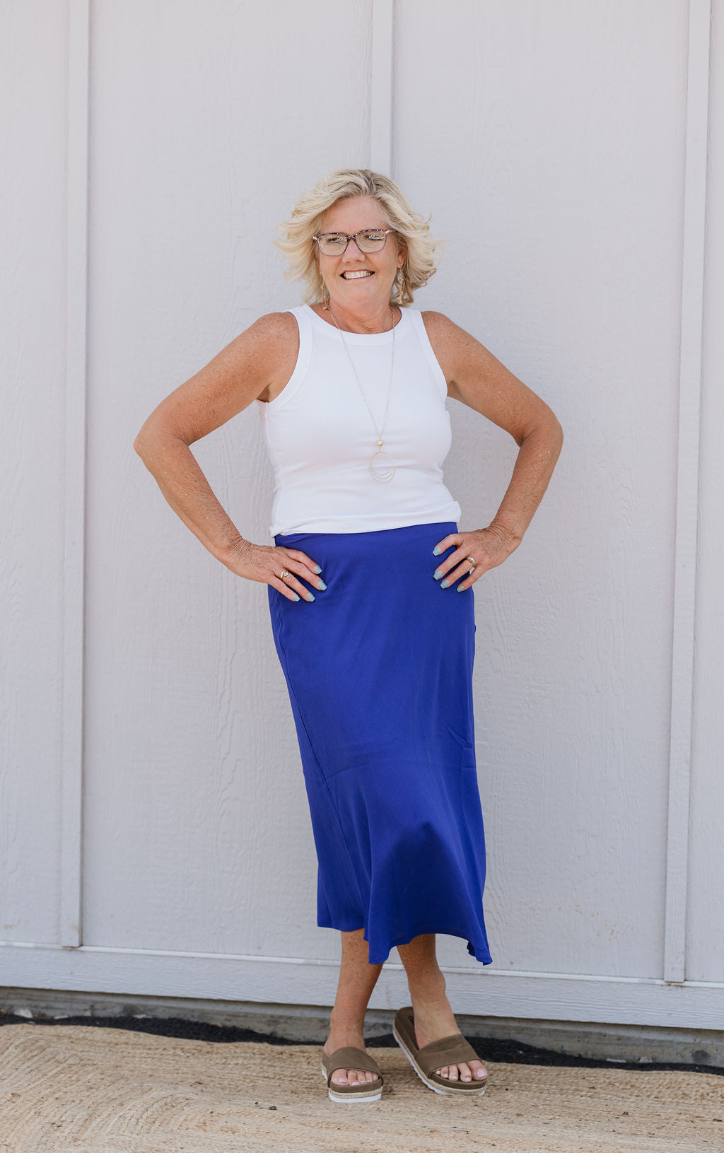 Royal elastic waistband skirt pairs perfect with a white tank top