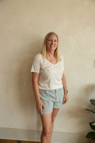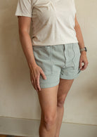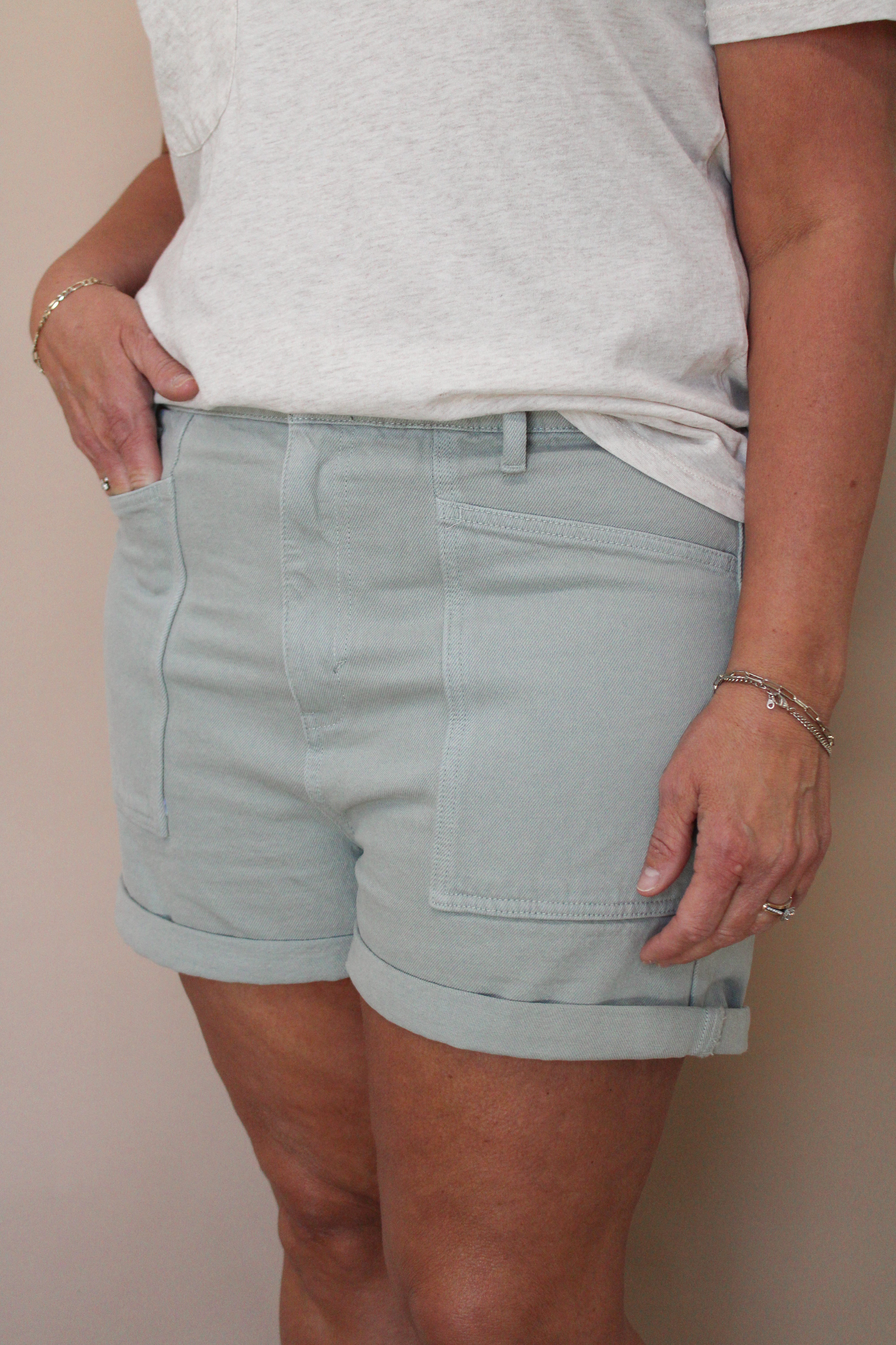 Sage colored denim shorts with an elastic waistband and front pocket detail