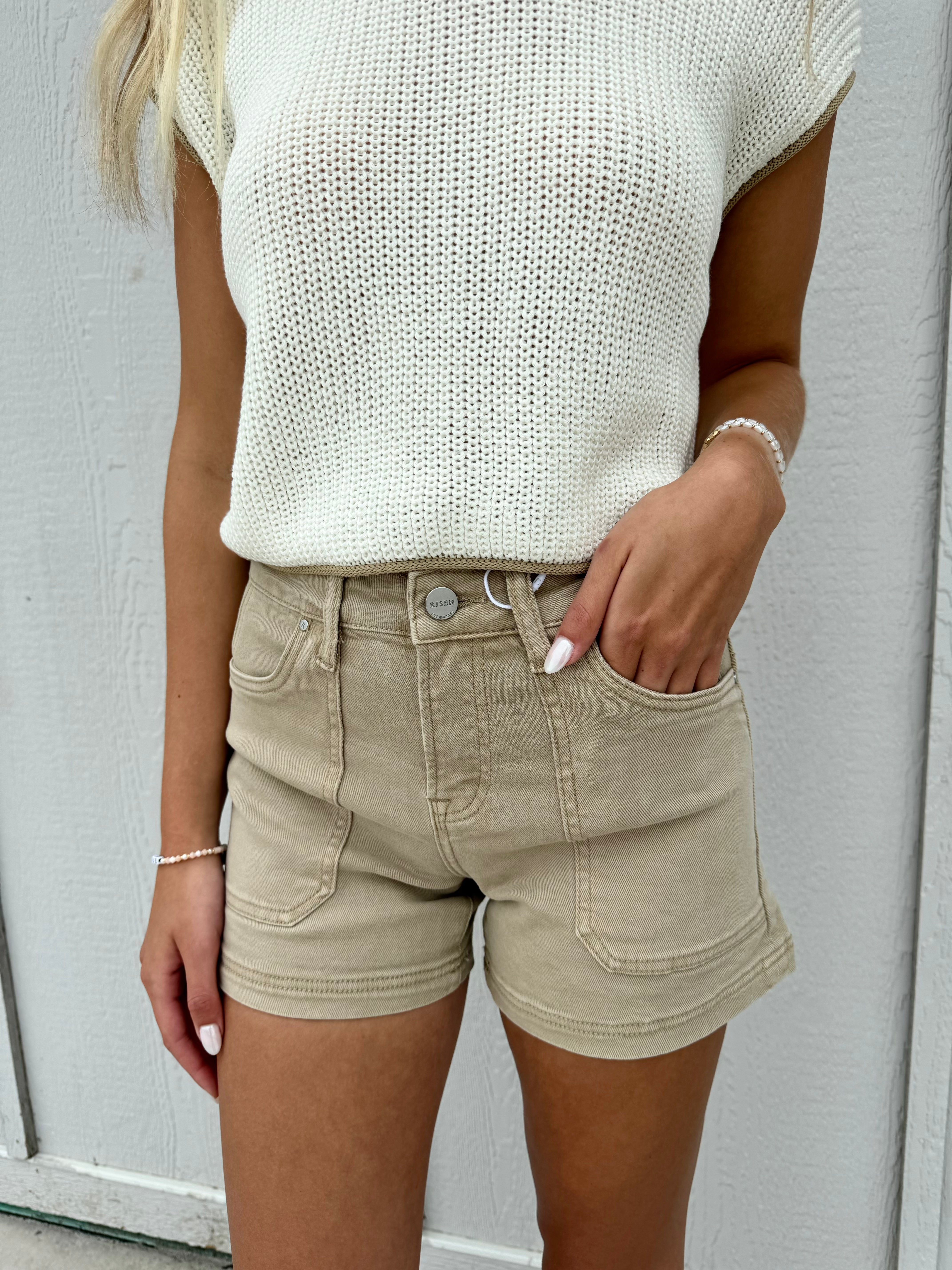 Add some edge and versatility to your wardrobe with our Risen Mid-Rise Front Patch Pocket Shorts. Made with olive denim and featuring convenient front patch pockets, these shorts are a must-have for any fashion-forward individual. Upgrade your style game with these essential shorts.