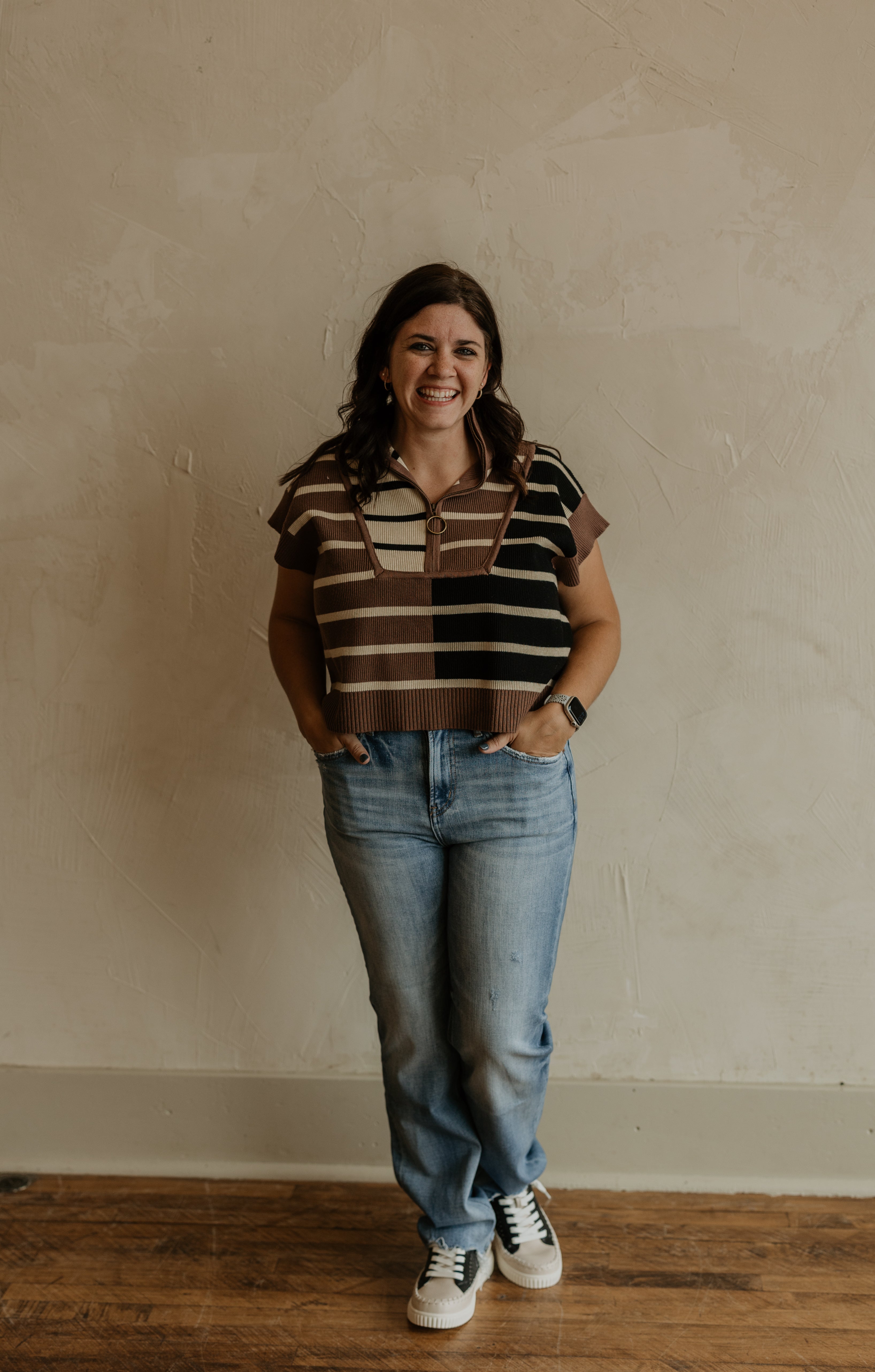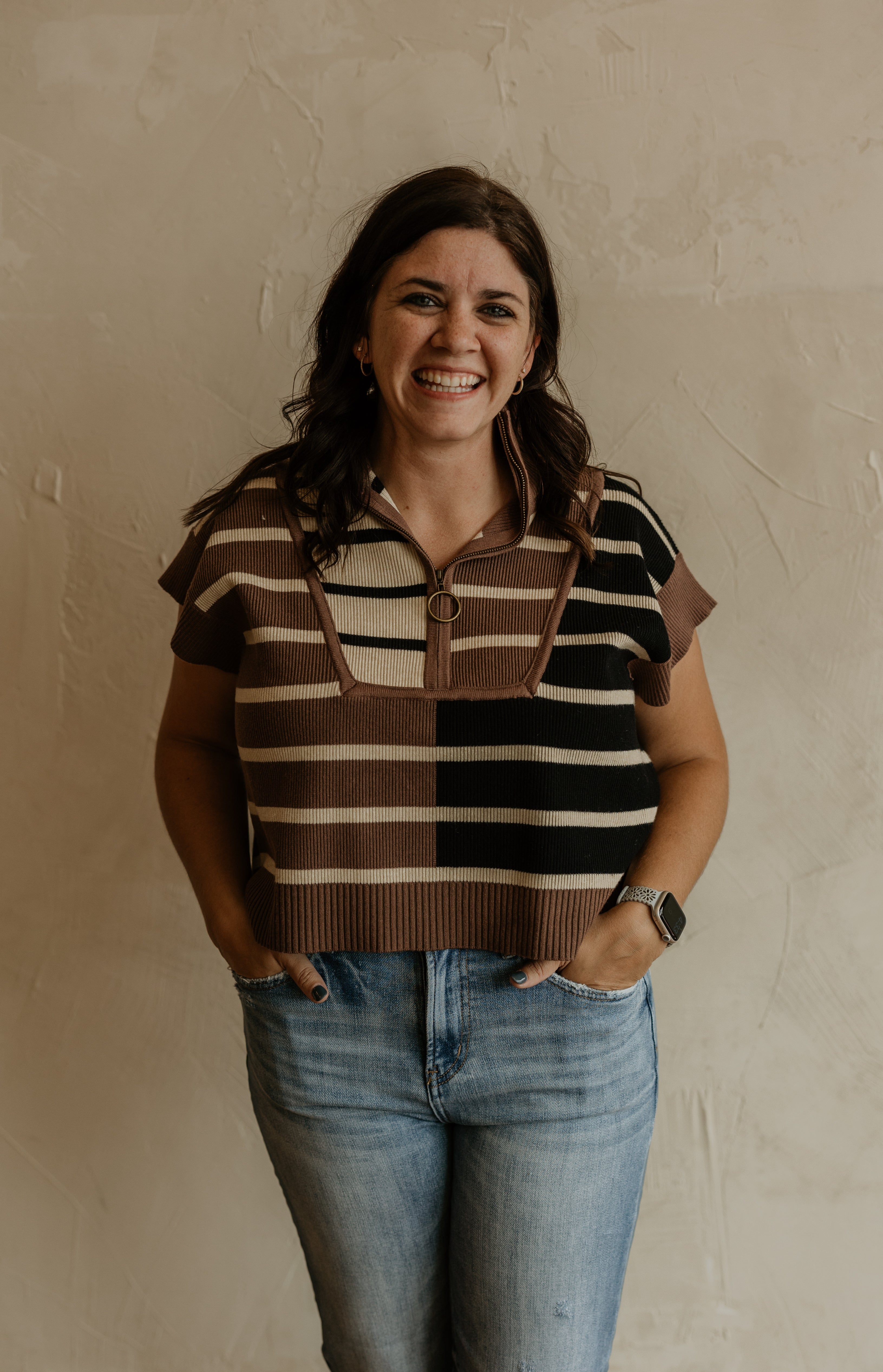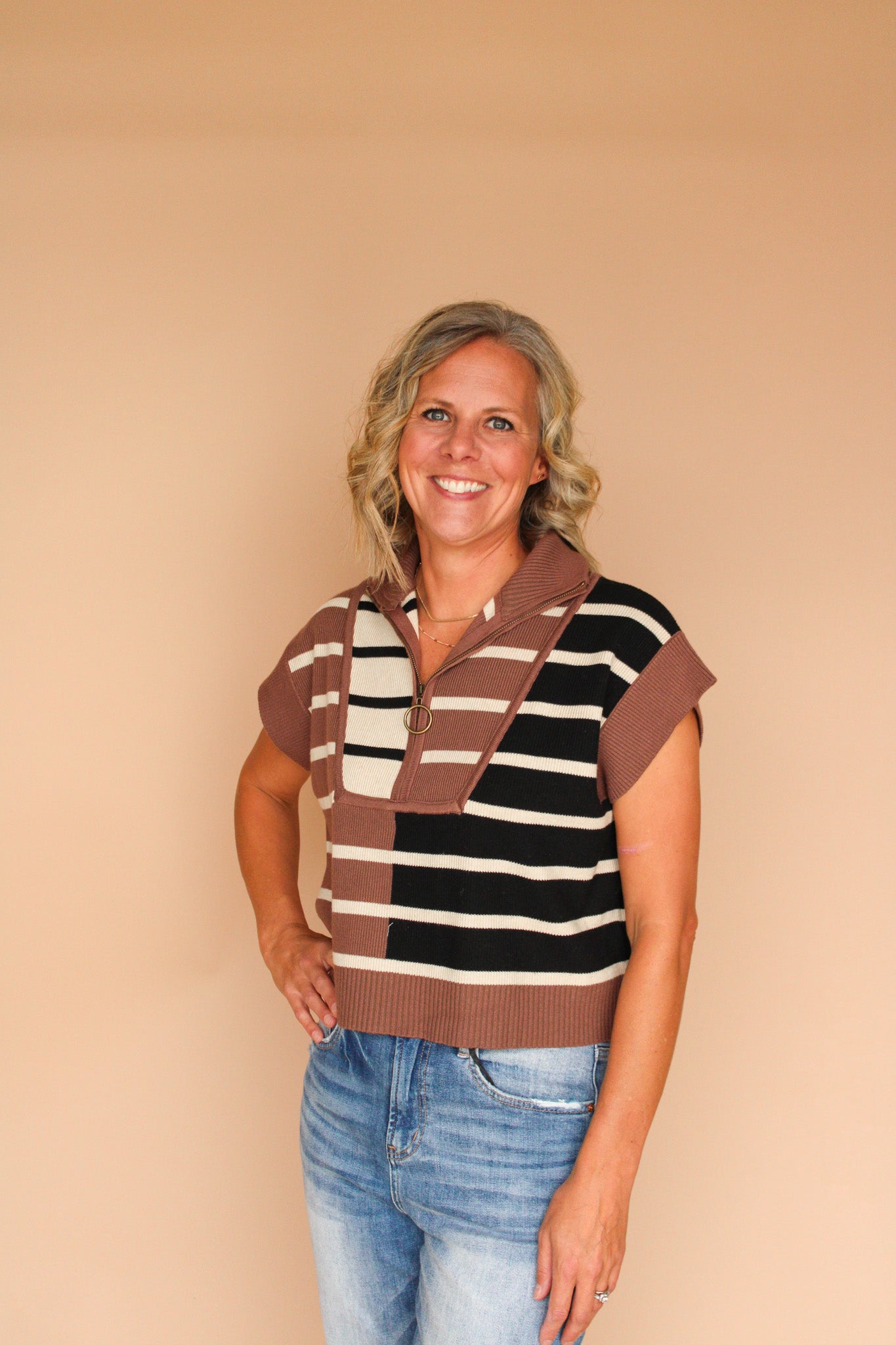 Get ready to make a statement with the Dacia Stripe Cap-Sleeve Sweater. This fun colorblock sweater is perfect for any outing and features a half zip for added style. With a loose fit, you'll be both comfortable and fashionable.