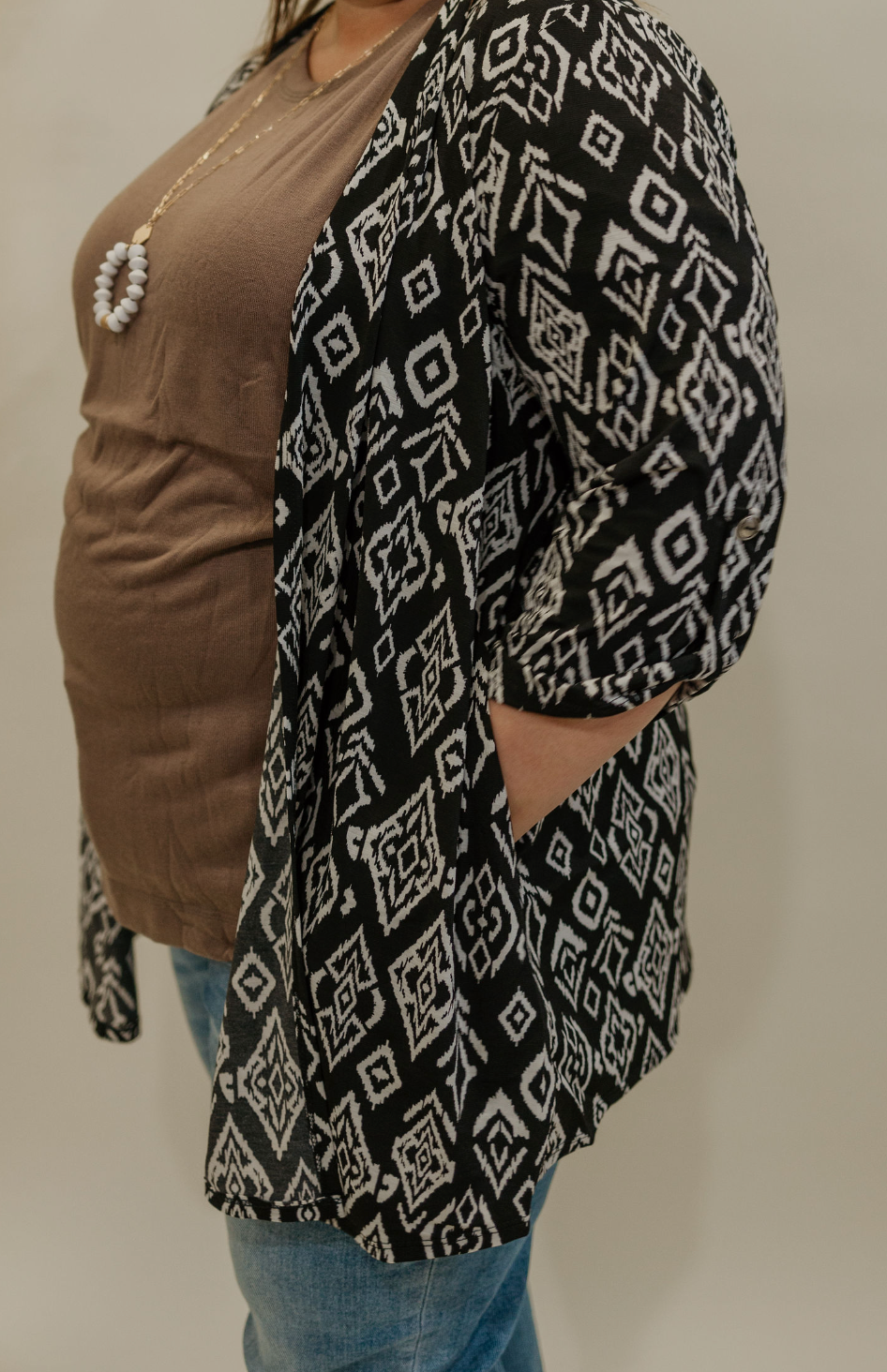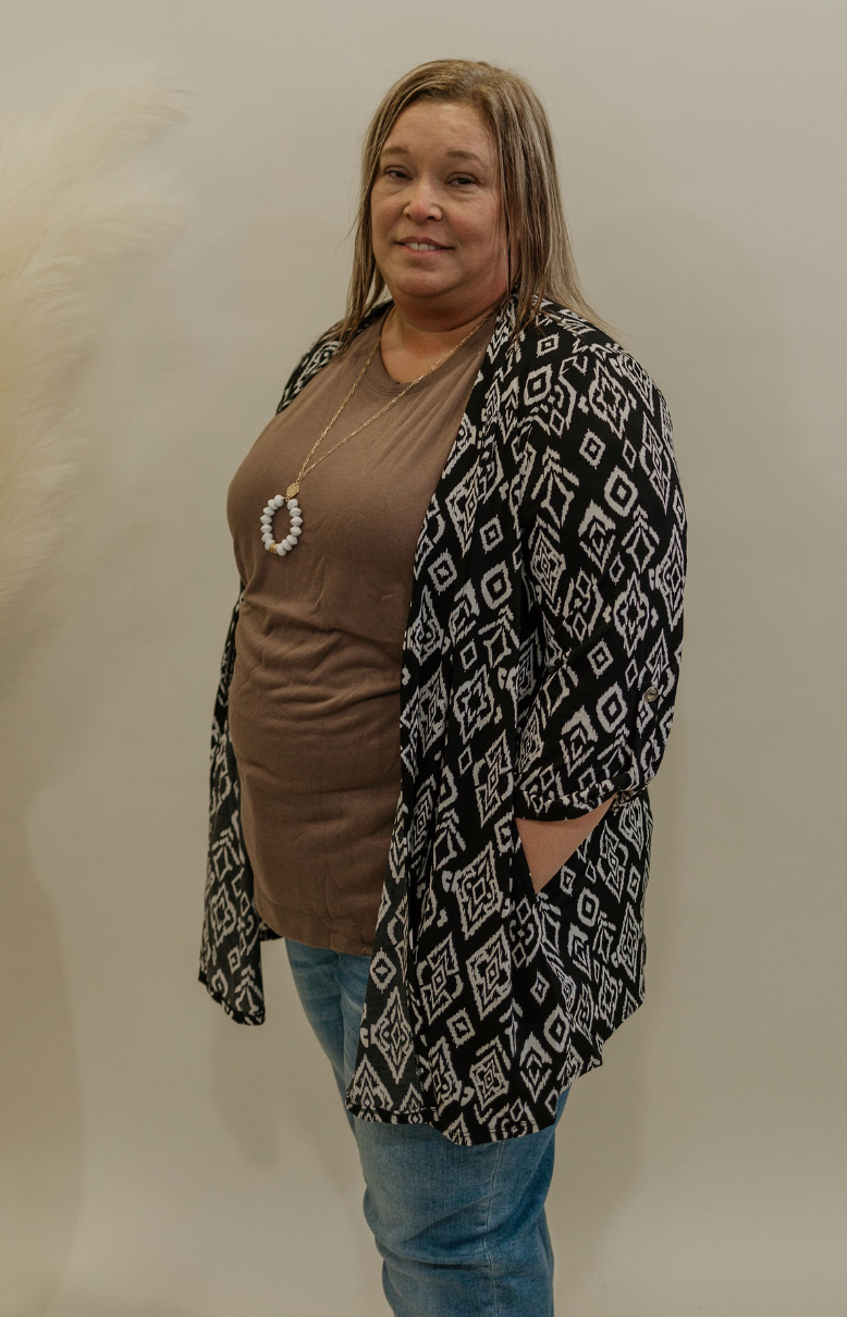 Curvy black and white kimono pairs perfect over a fun colored basic top