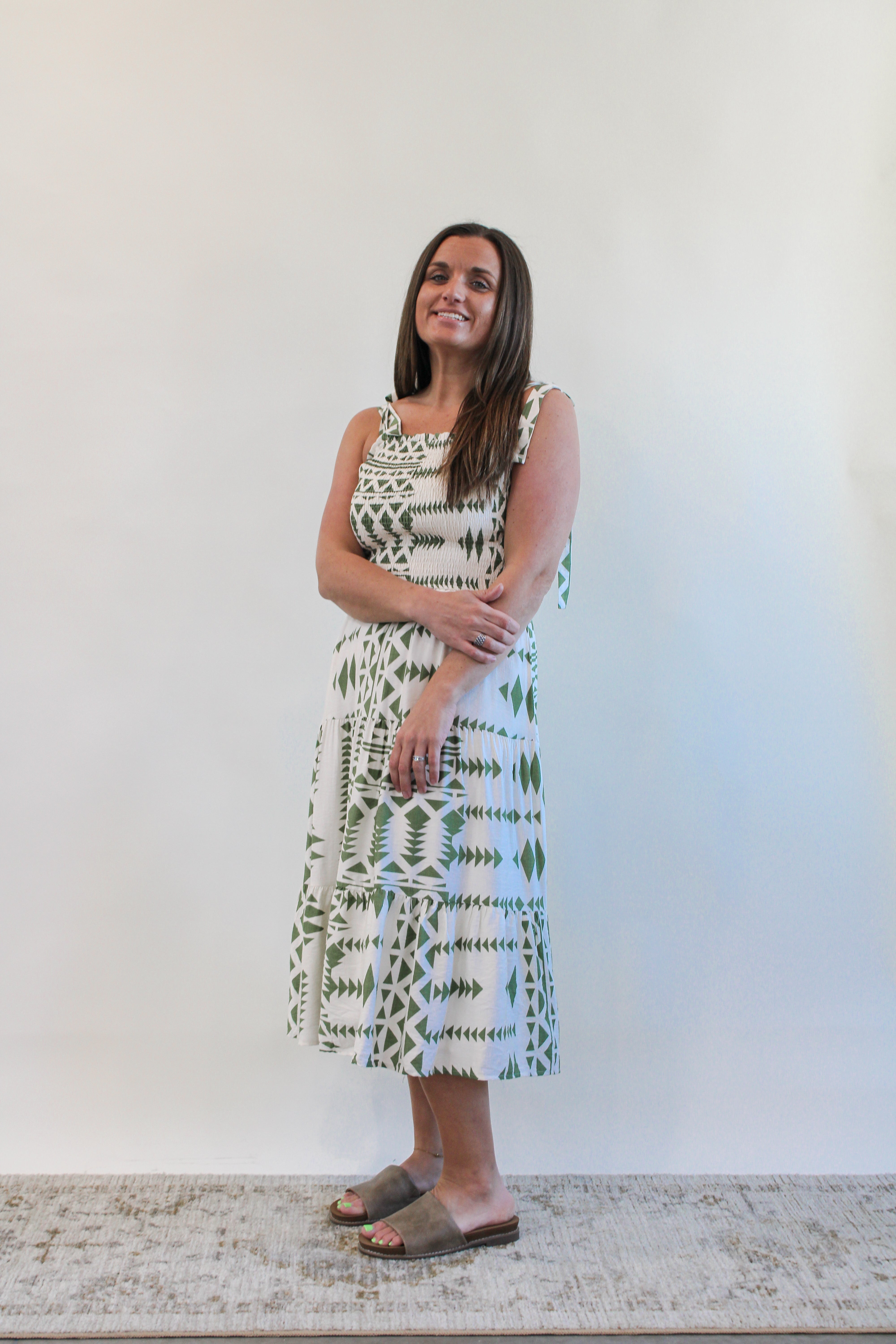 Rock a playful look with FIN's Womens Shoulder Tie Smocked Geometric Print Dress. The print fabric and unique shoulder ties add a touch of quirk to this classic silhouette, while the smocked detail brings both style and comfort to your wardrobe. Perfect for making a statement!