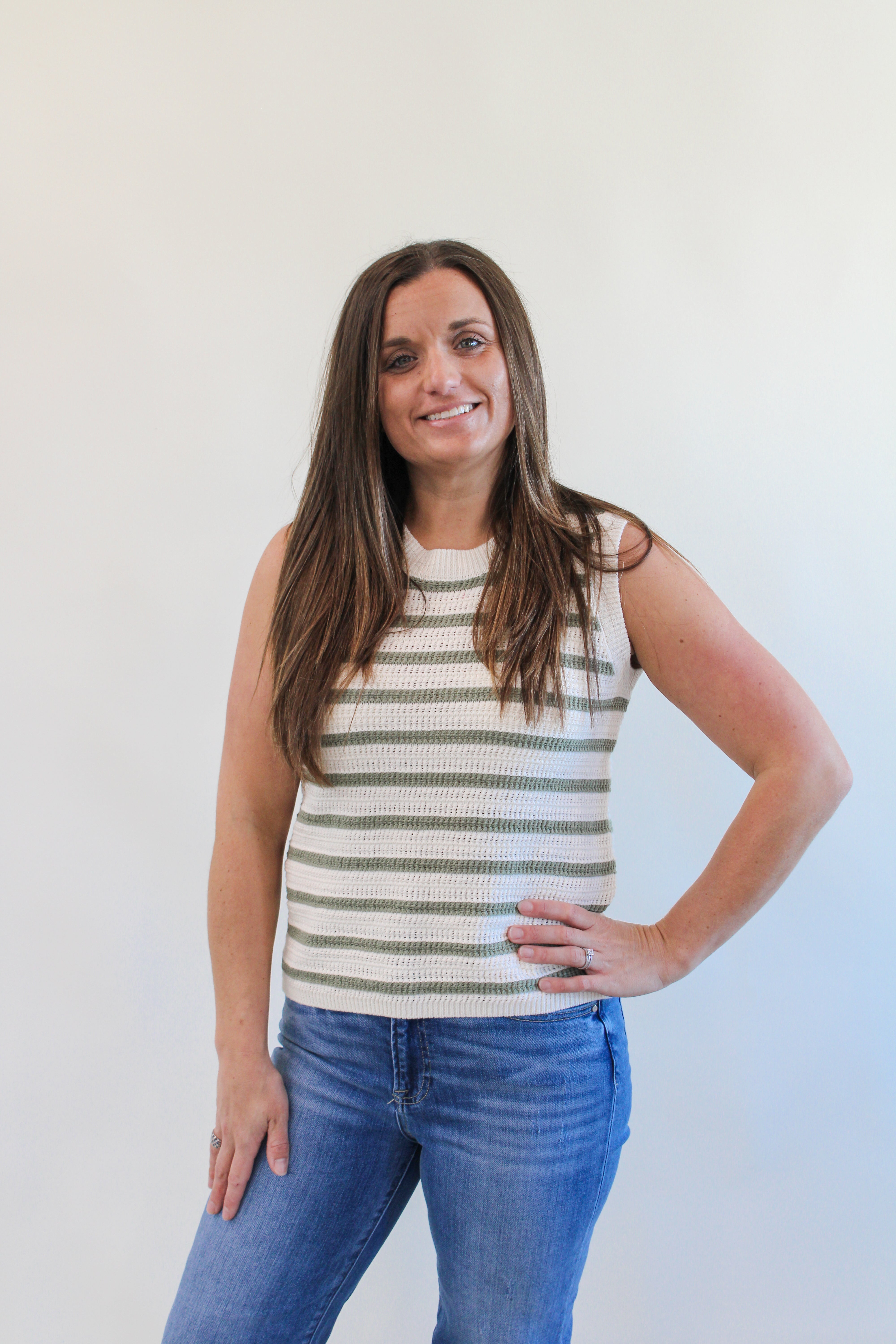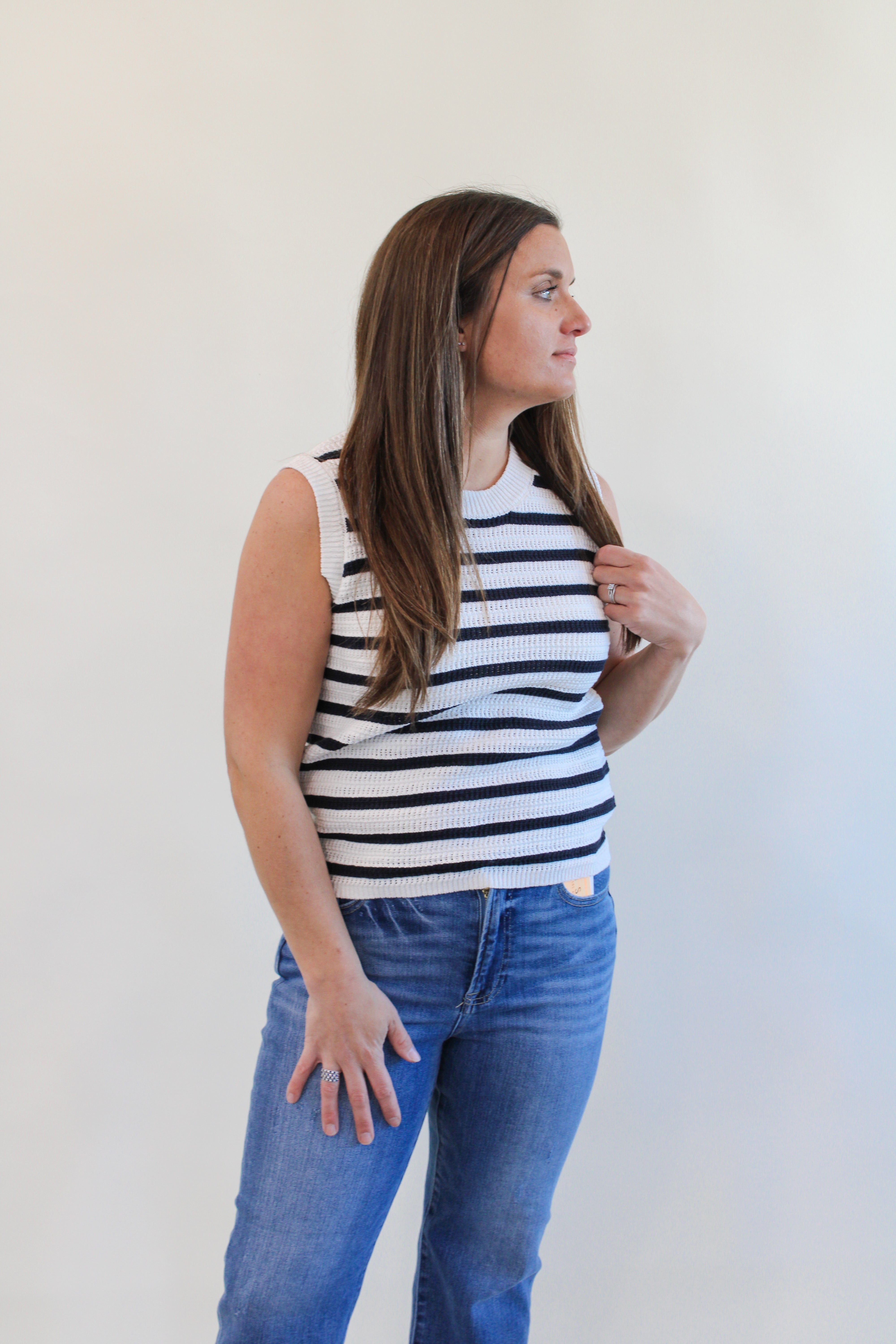 Get ready to turn heads in our Arabella Knit Sweater Tank! This chunky, striped tank features contrast accents at the sleeves, neck, and hem. Made with a soft blend of 60% cotton and 40% viscose. Who knew cozy could be so stylish?