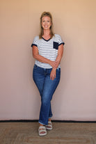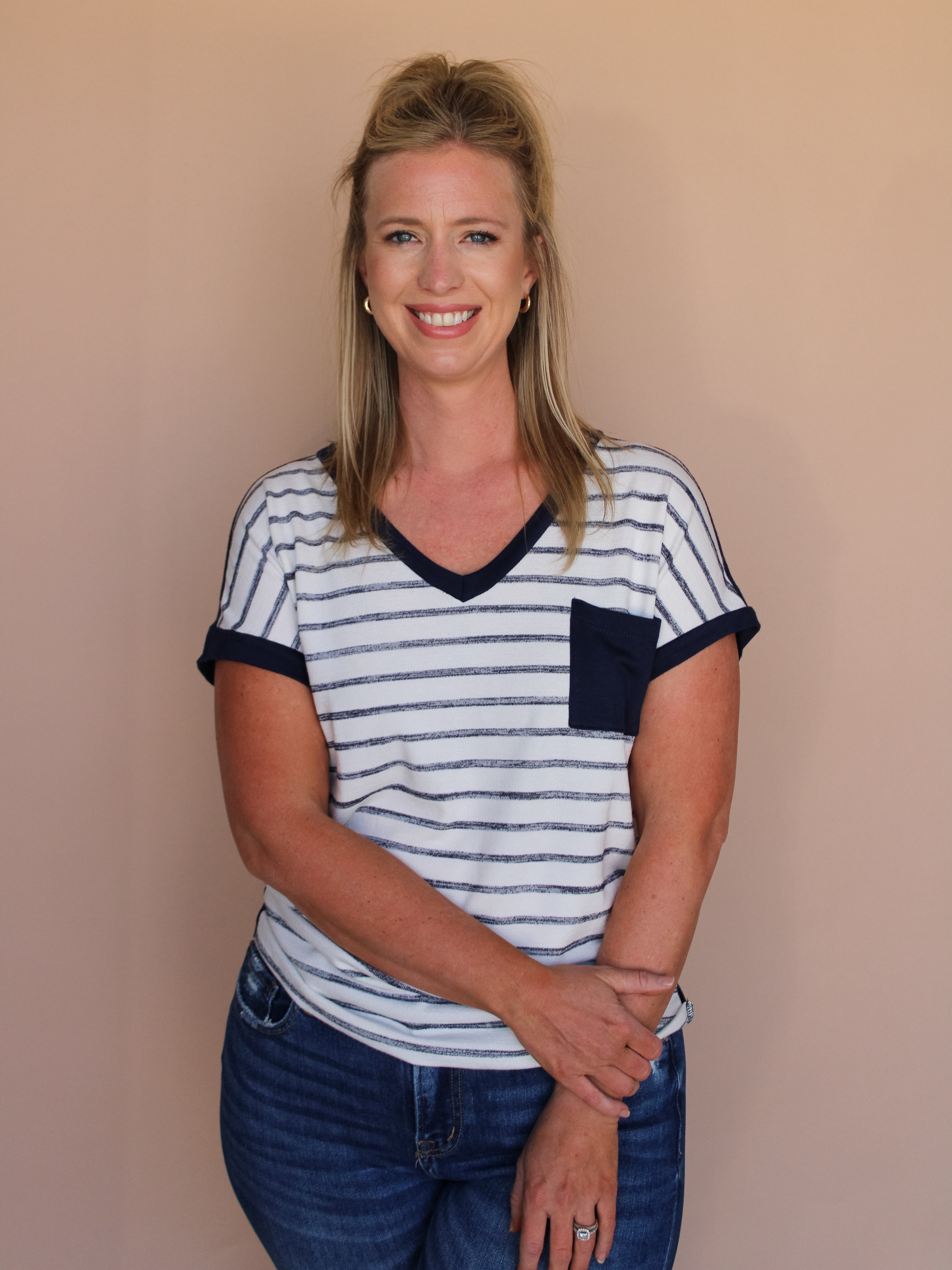 Unleash your playful side with our KIERRA VNECK top! The bold color blocking on the back and striped front add a fun twist to this classic vneck. Plus, keep your essentials close with the convenient chest pocket. Get ready to turn heads in this quirky and stylish short sleeve top.