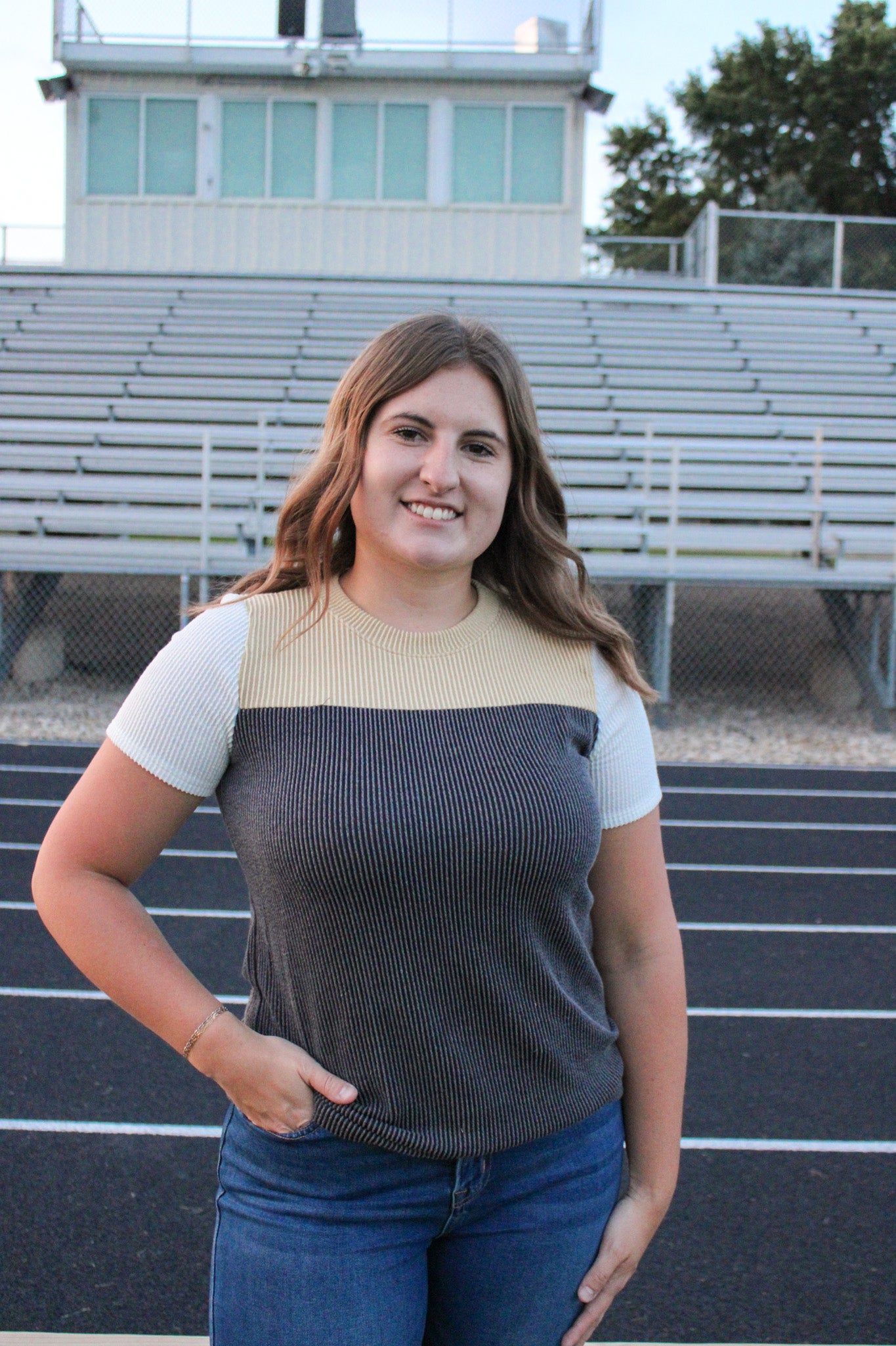 Bring some fun to your wardrobe with the Simone Ribbed Colorblock Top. Featuring a comfy round neck and playful ribbed texture, this trio of contrasting colors adds a vibrant touch to any outfit. Perfect for mixing, matching, and making a statement with every wear.