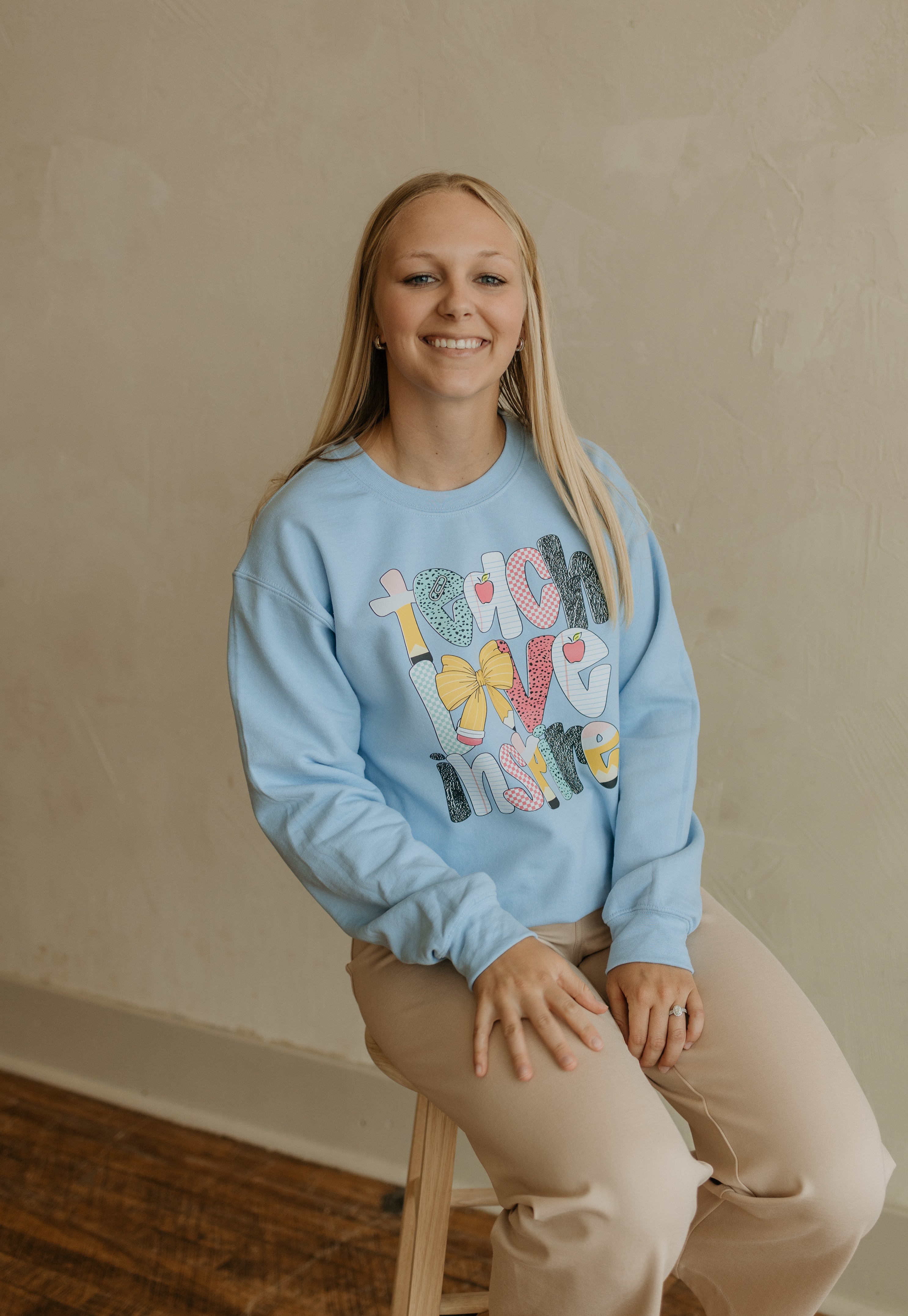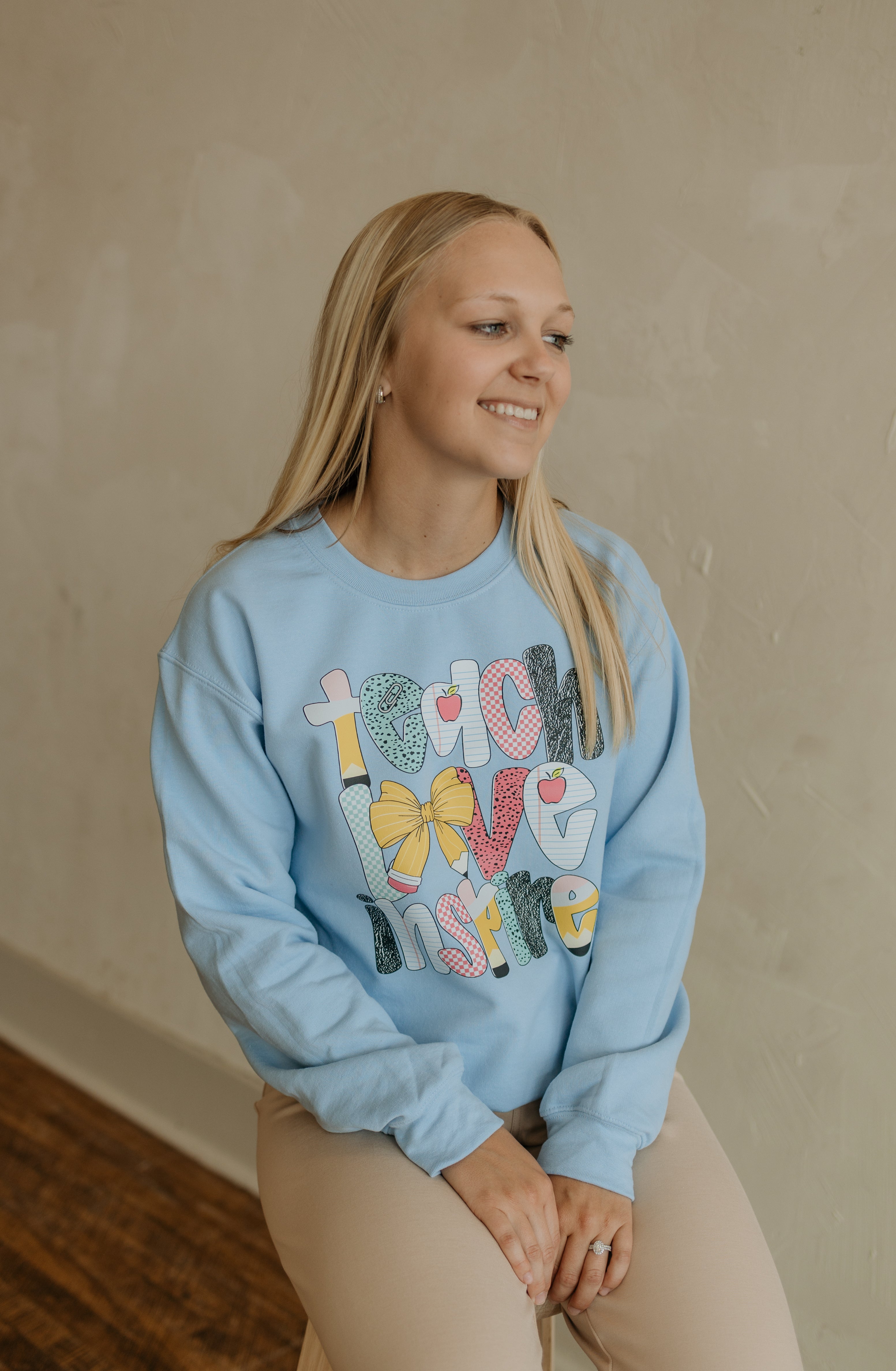 Celebrate your passion for teaching with this playful light blue Hanes sweatshirt. Featuring the inspiring "Teach Love Inspire" graphic alongside charming school supply text, it’s perfect for educators who want to share their love for learning in style. Comfortable and cozy, this sweatshirt brightens your day while keeping you warm.